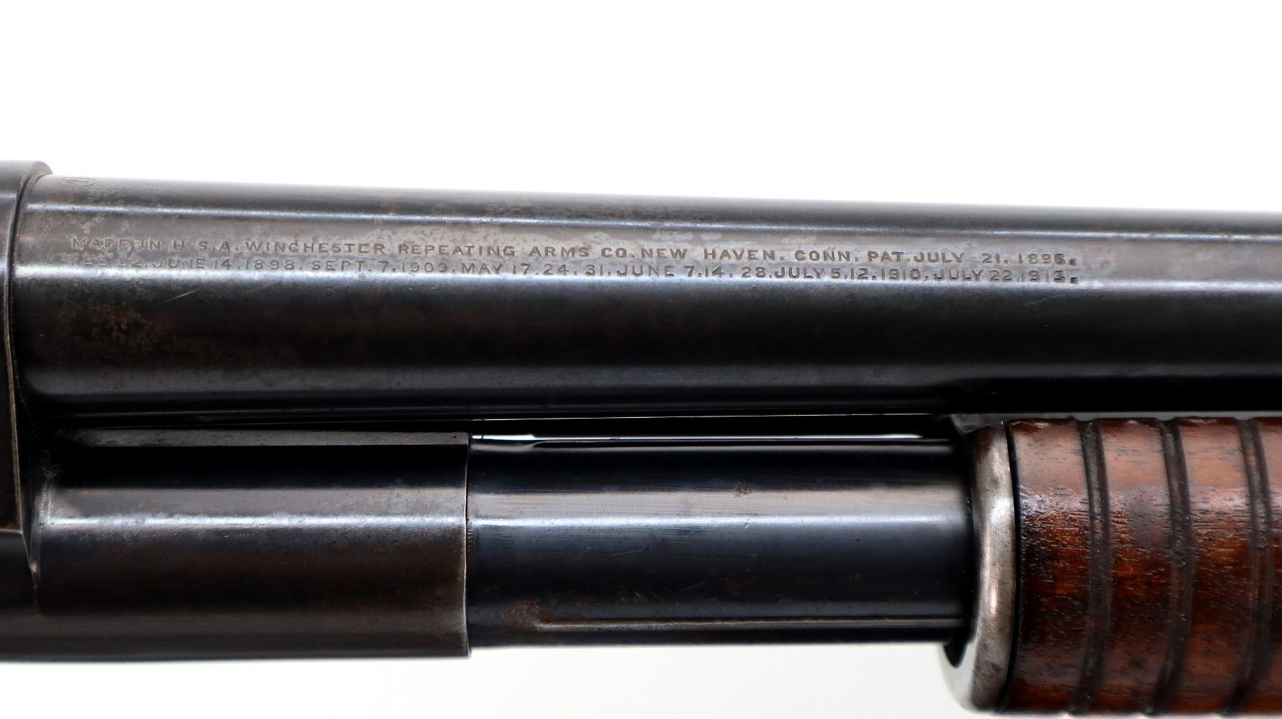 Main Description: Manufactured 1936. Silver bead, blued finish, round barrel, receiver has a welded spot on top, has a one piece grooved wood forearm. Missing complete butt stock assembly, receiver tang is bent.