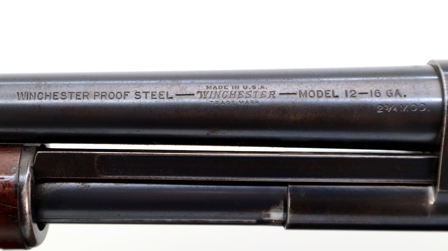 Main Description: Manufactured 1932. Silver bead, blued finish, round barrel, choke reemed from Mod to IC. Two piece wood stocks, grooved forearm, pistol grip cracked and chipped behind receiver, red vented rubber recoil pad, 13.5" LOP