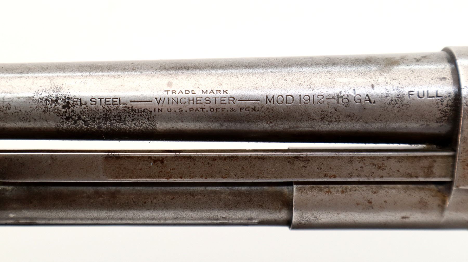 Main Description: Manufactured 1913. Silver bead, round barrel loose on receiver. Two piece wood stocks, grooved forearm which is cracked, pistol grip chipped, cracked and loose, replaced black rubber recoil pad