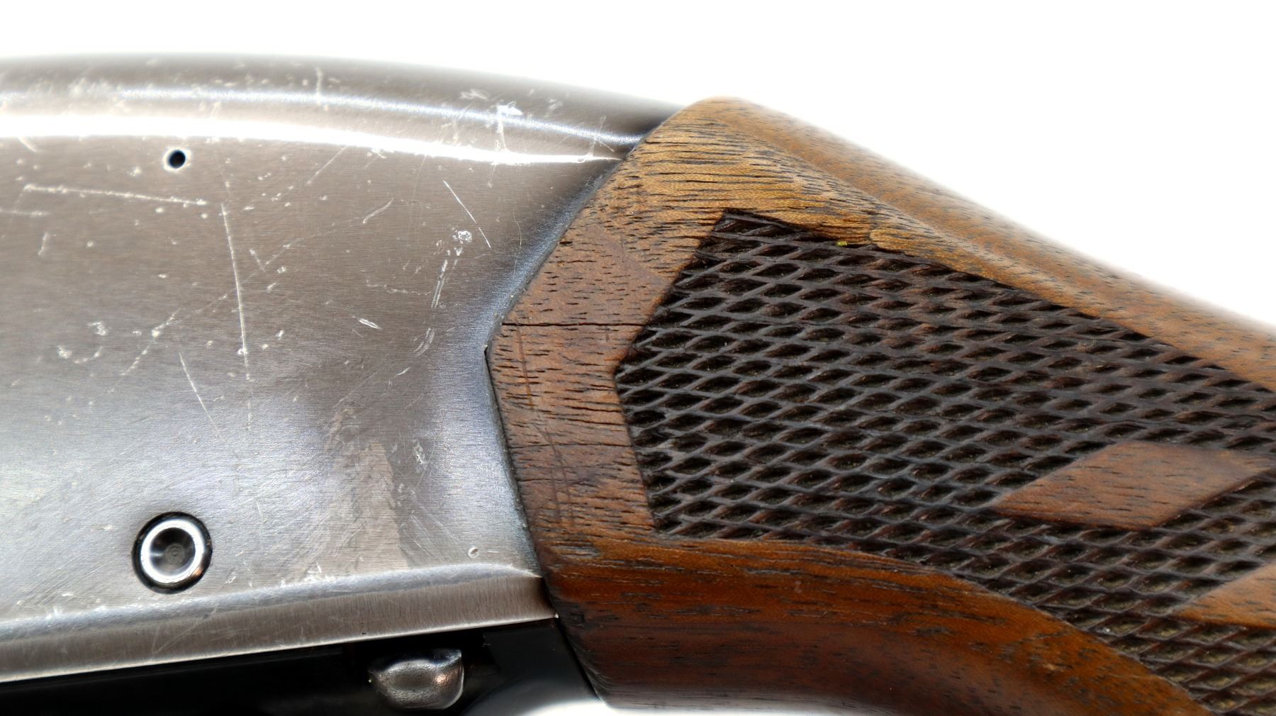 Main Description: This shotgun has a Semi Auto Model 1400 barrel installed. Silver bead, blued vent rib barrel which is dented, alloy receiver. Two piece wood stocks, checkered forearm (is loose has lots of play) and pistol grip both are cracked, replaced grooved black polymer butt plate, 13.5" LOP, rear sling swivel only.
