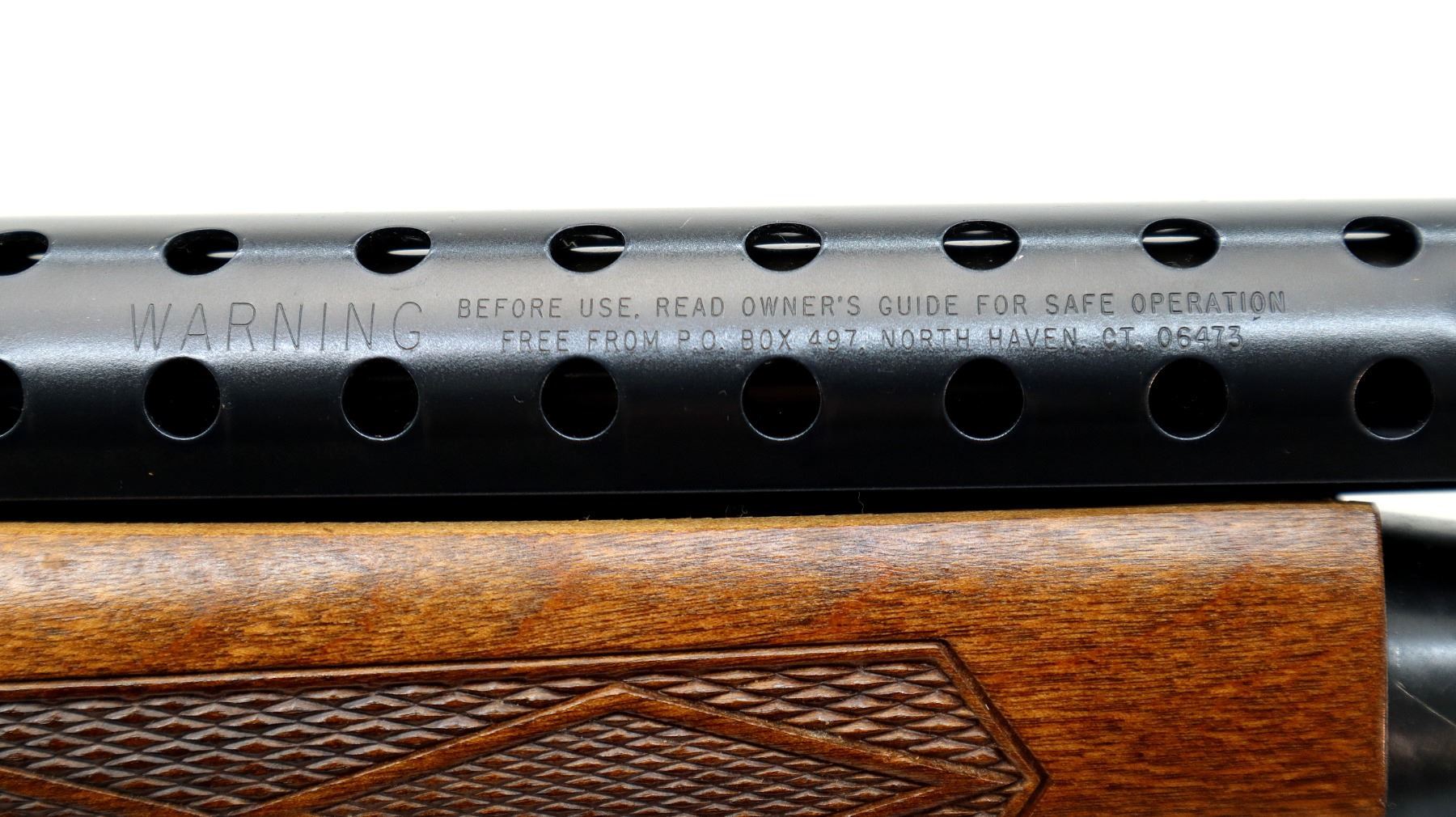 Main Description: Missing bead, custom shortened ported blued round barrel with ventilated heat shield, black alloy receiver. One piece checkered wood forearm, black polymer butt stock with textured pistol grip and vented recoil pad, grip cap, rear sling swivel only.