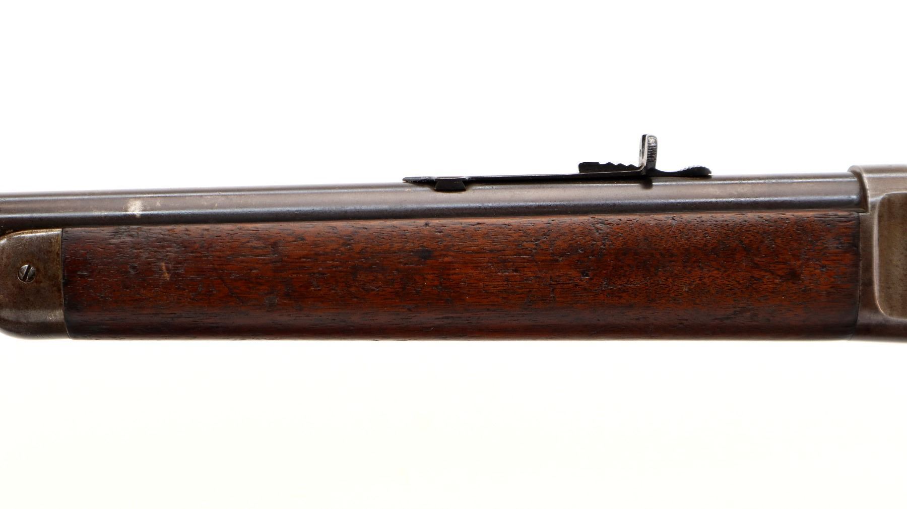 Main Description: Manufactured 1901. Blade front sight, adjustable semi buckhorn rear sight, tapered round barrel, checkered spur hammer. Two piece wood stocks, straight grip, small crack behind tang, smooth curved steel butt plate, full length magtube.