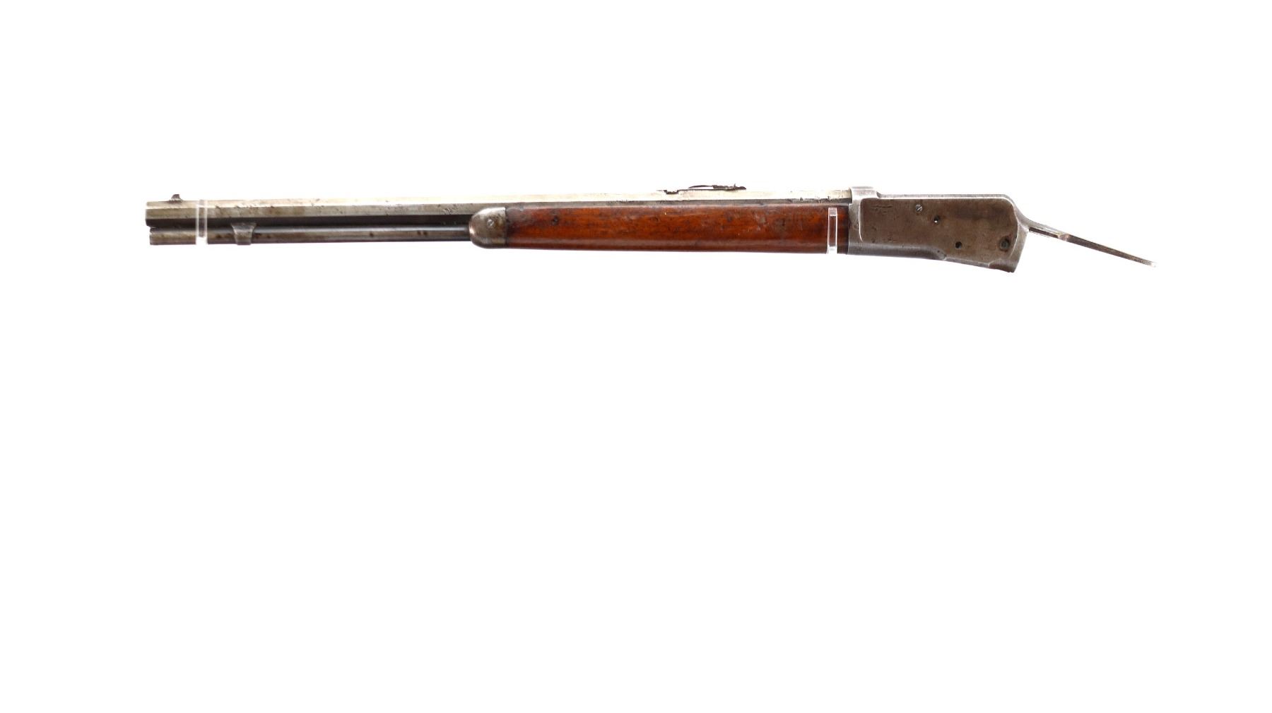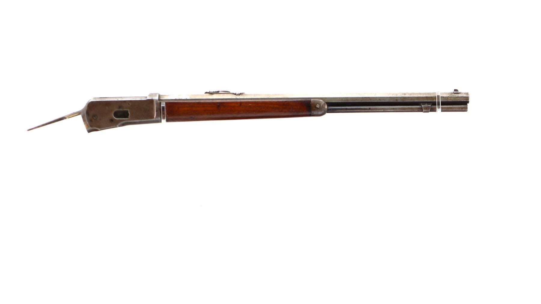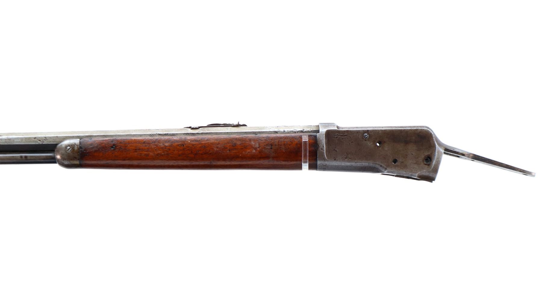 Main Description: Manufactured 1907. Blade front sight, replaced adjustable u notched rear sight, shortened octagon barrel and magtube, includes wood forearm which is chipped and cracked, nose cap, magazine follower and spring. No other parts or stocks are included.