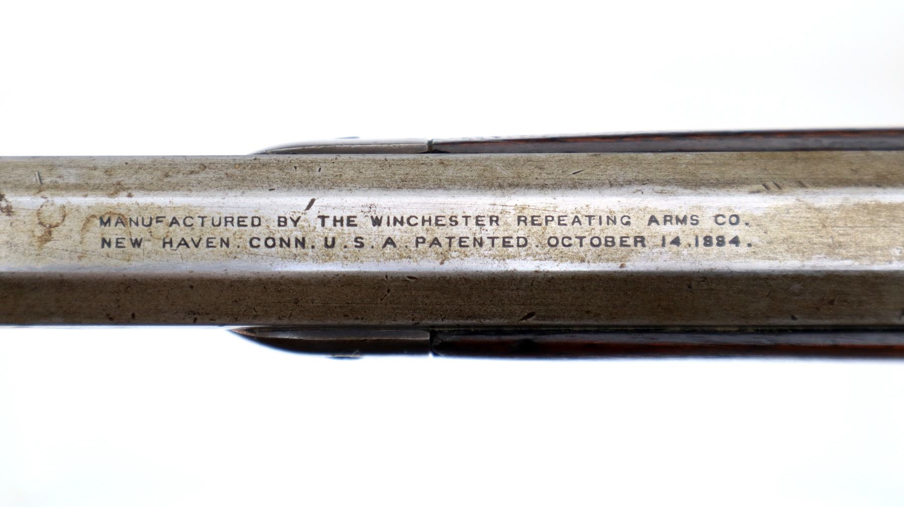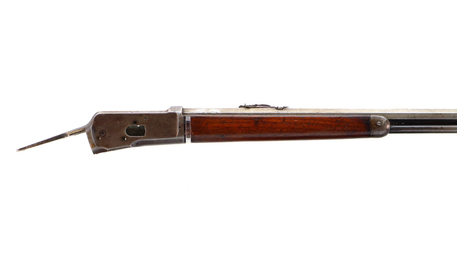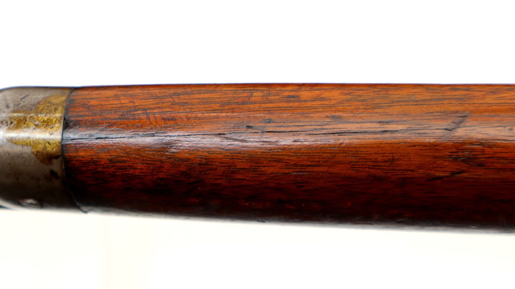 Main Description: Manufactured 1907. Blade front sight, replaced adjustable u notched rear sight, shortened octagon barrel and magtube, includes wood forearm which is chipped and cracked, nose cap, magazine follower and spring. No other parts or stocks are included.