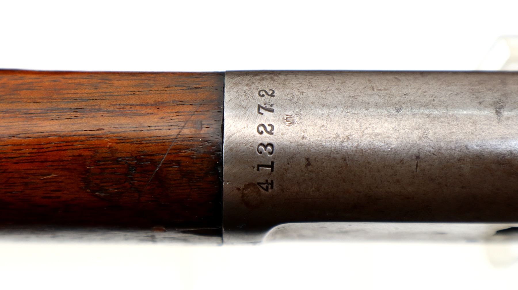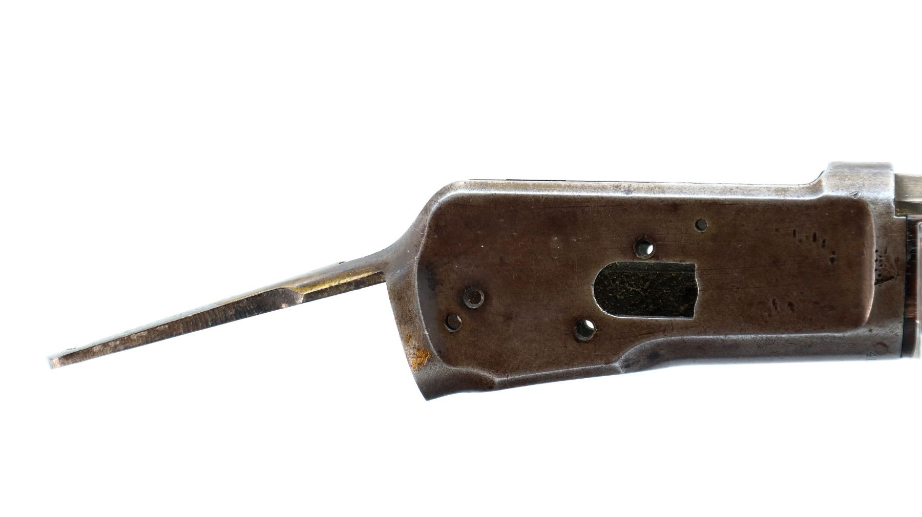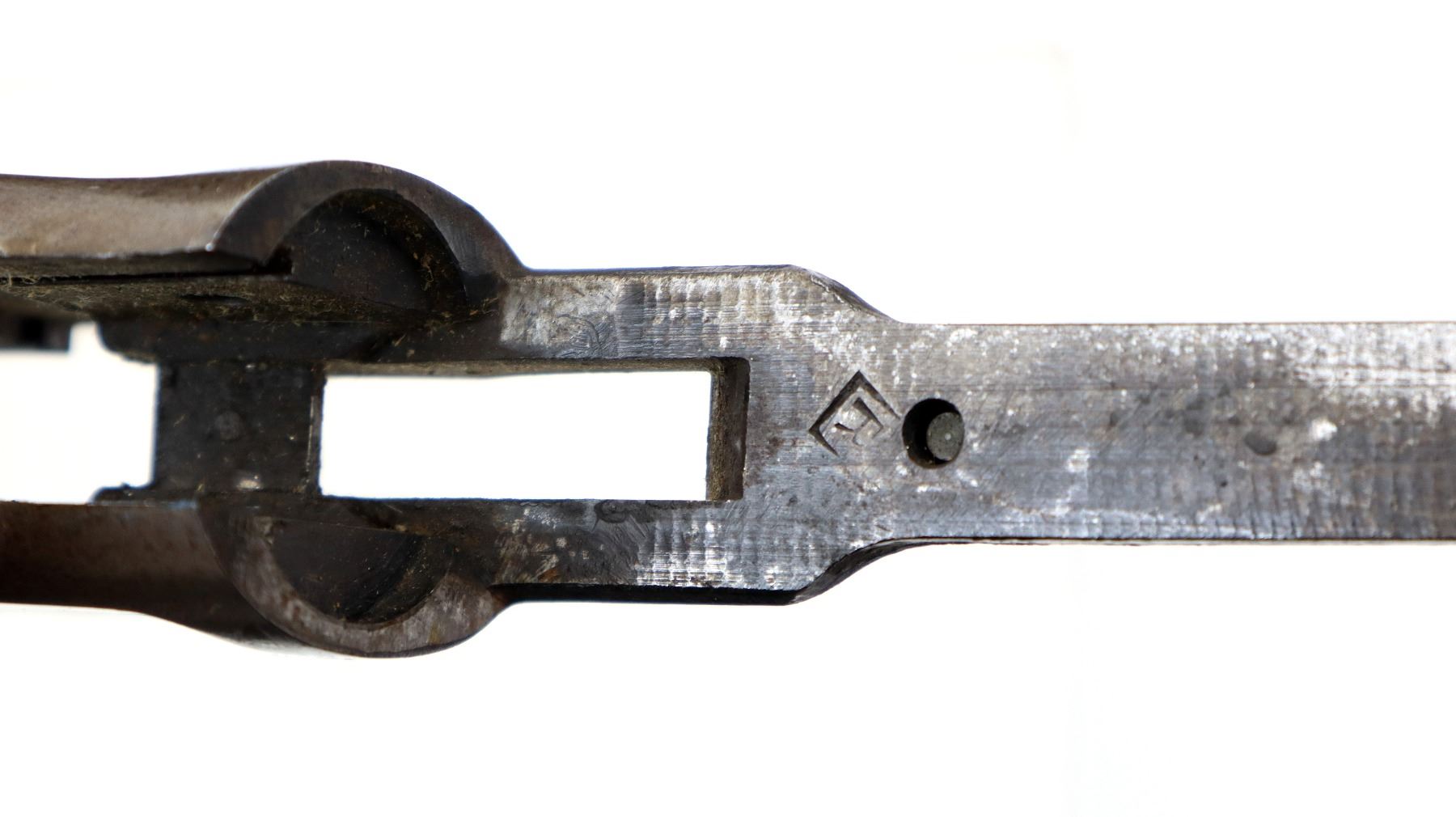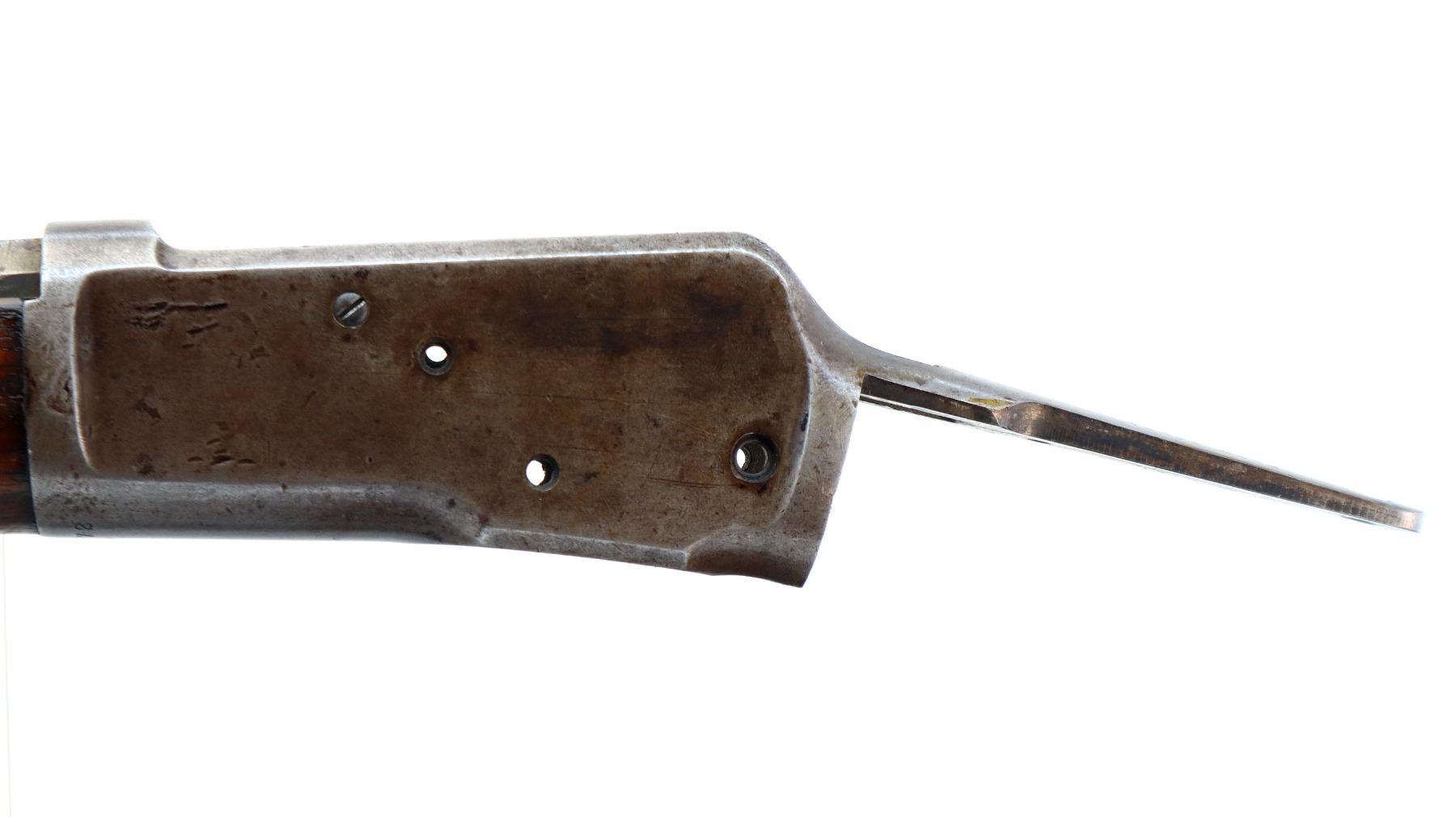 Wear: Metal finish turning silver grey with pitting, light rust speckles, scratches, handling marks and wear. Forearm shows marks, scratches and wear.
