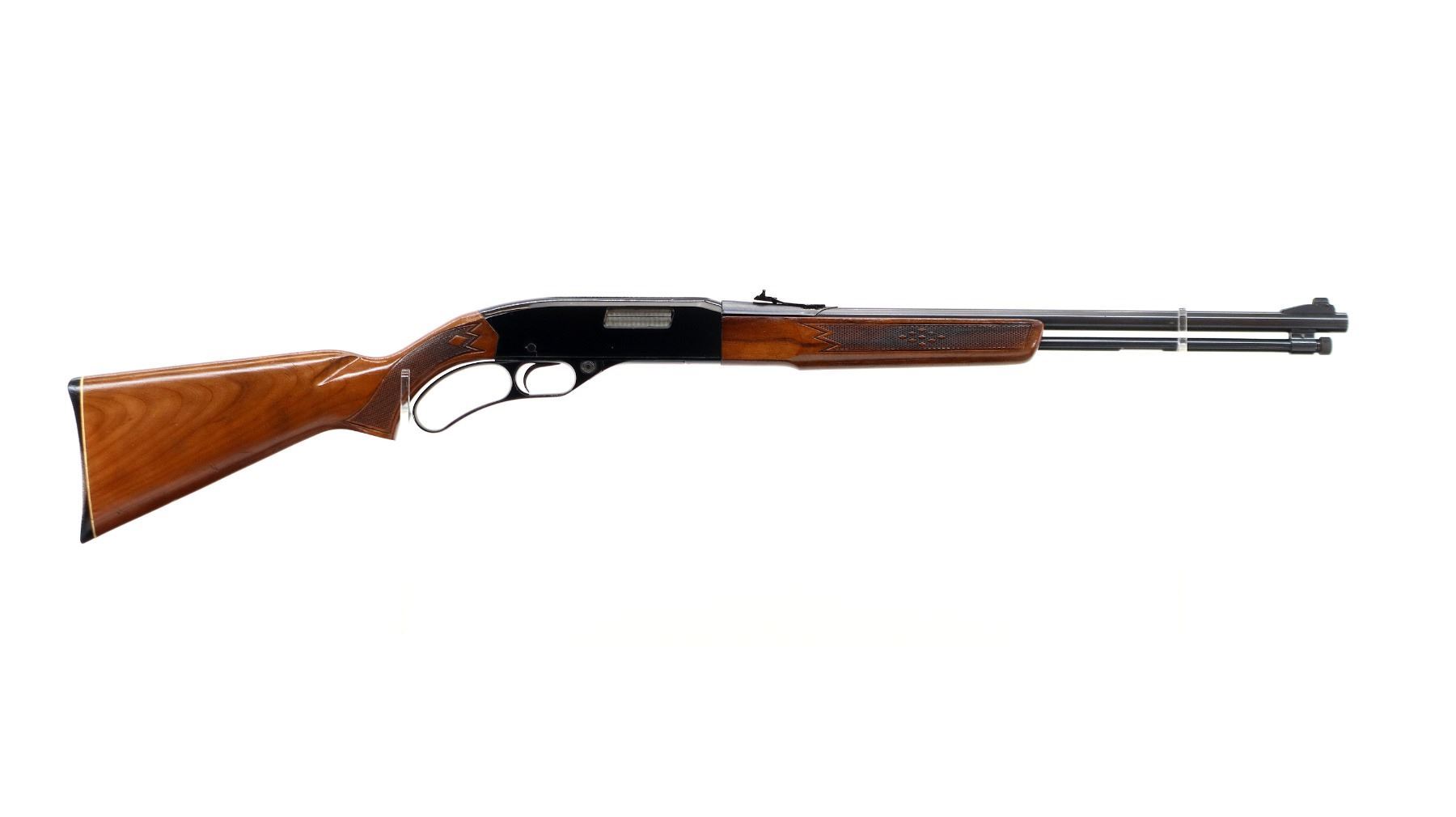 Main Description: Blade front sight with ramp, replaced adjustable u notched rear sight, blued round barrel and outer magtube, grooved black alloy receiver. Two piece wood stocks, checkered forearm and pistol grip, grooved black polymer butt plate