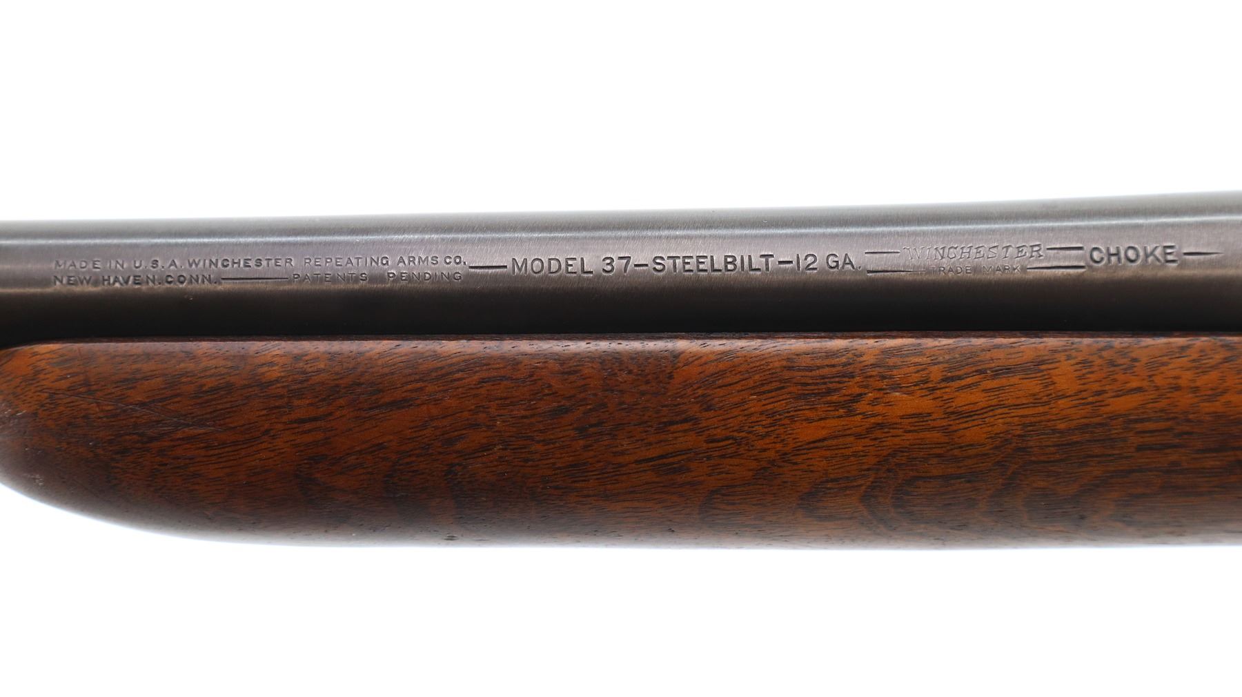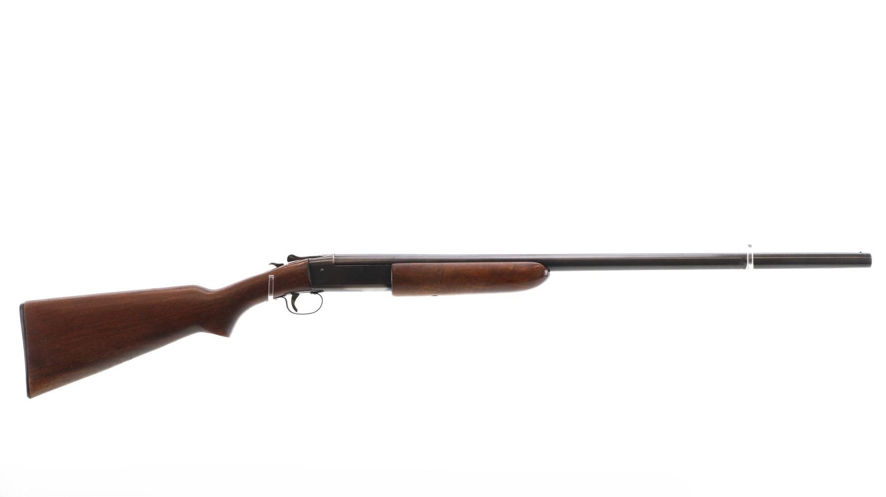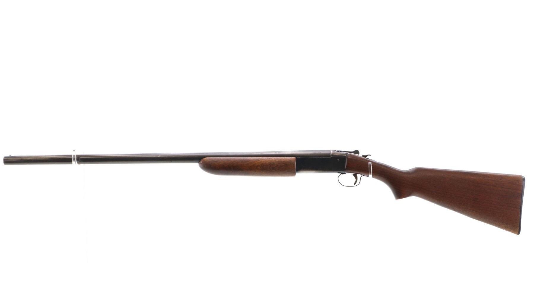 Main Description: Silver bead, blued finish, round barrel, grooved spur hammer, extractor. Two piece smooth wood stocks, pistol grip, checkered black polymer butt plate.