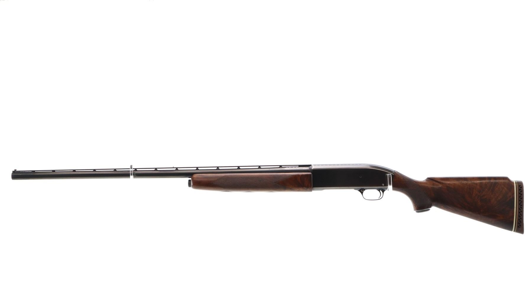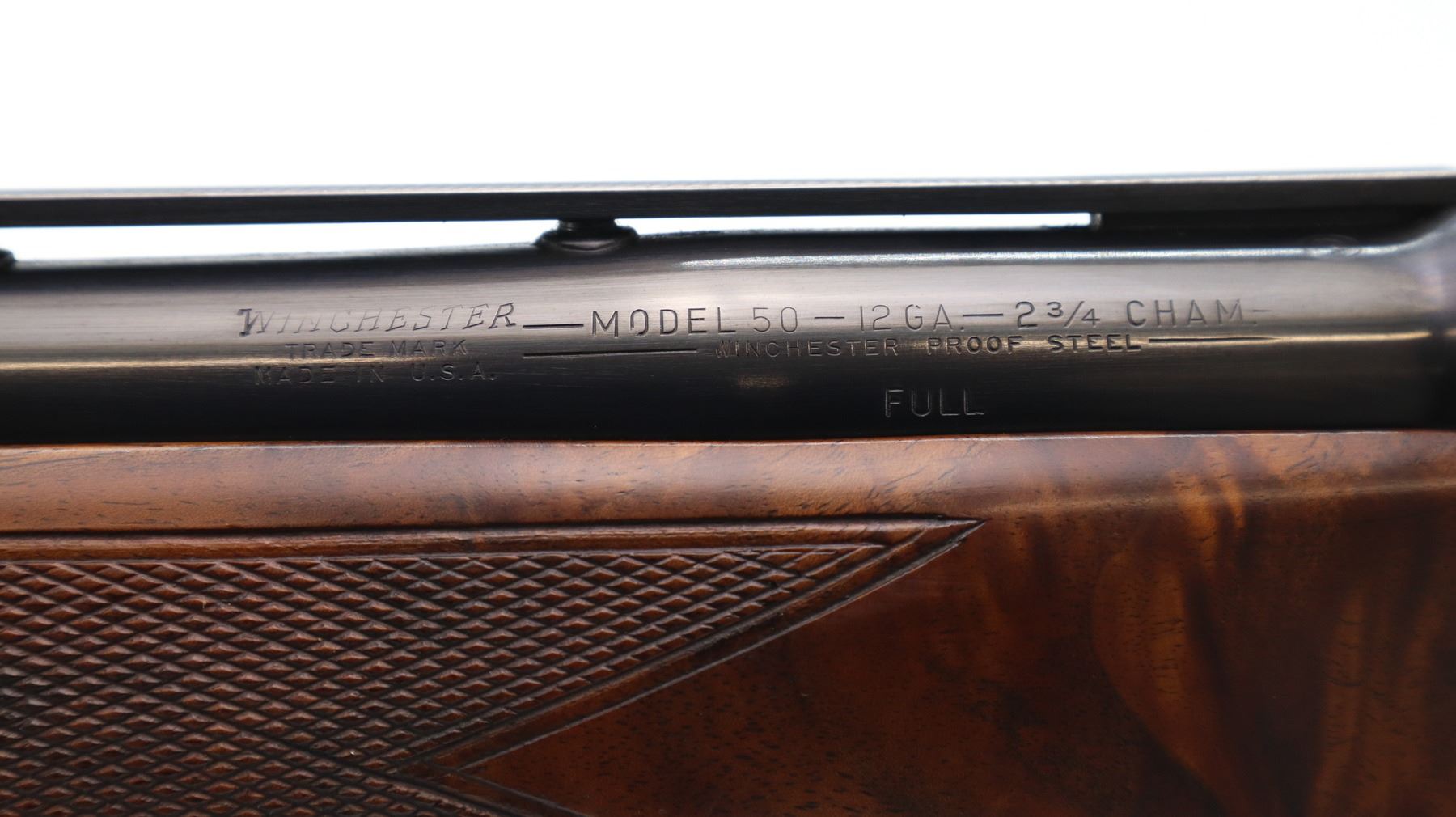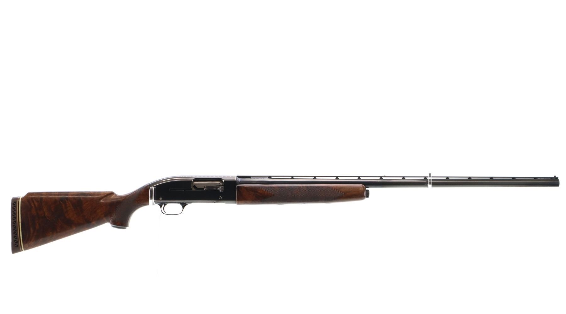 Main Description: Manufactured 1956. Red front and silver mid rib beads, polish blued finish, vent rib barrel. Two piece satin finish wood stocks with nicely figured wood grain, checkered forearm cracked on left side, checkered pistol grip, raised comb, brown vented rubber recoil pad, steel grip cap.