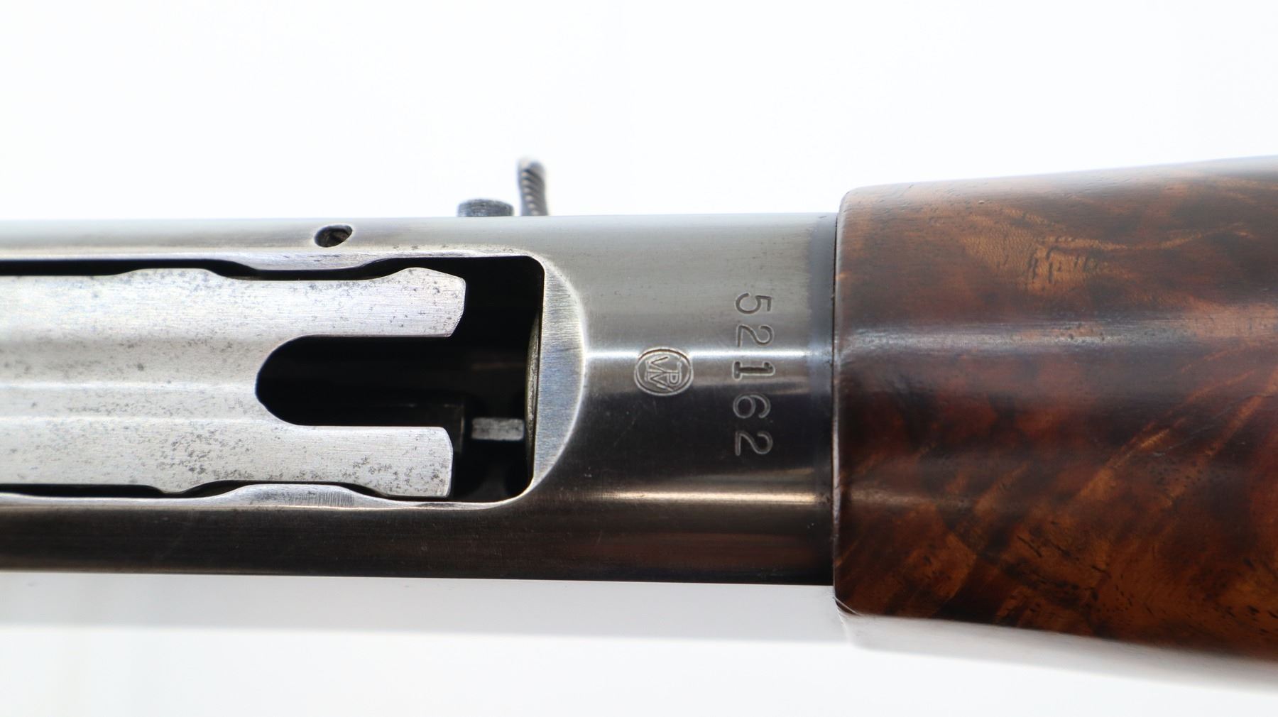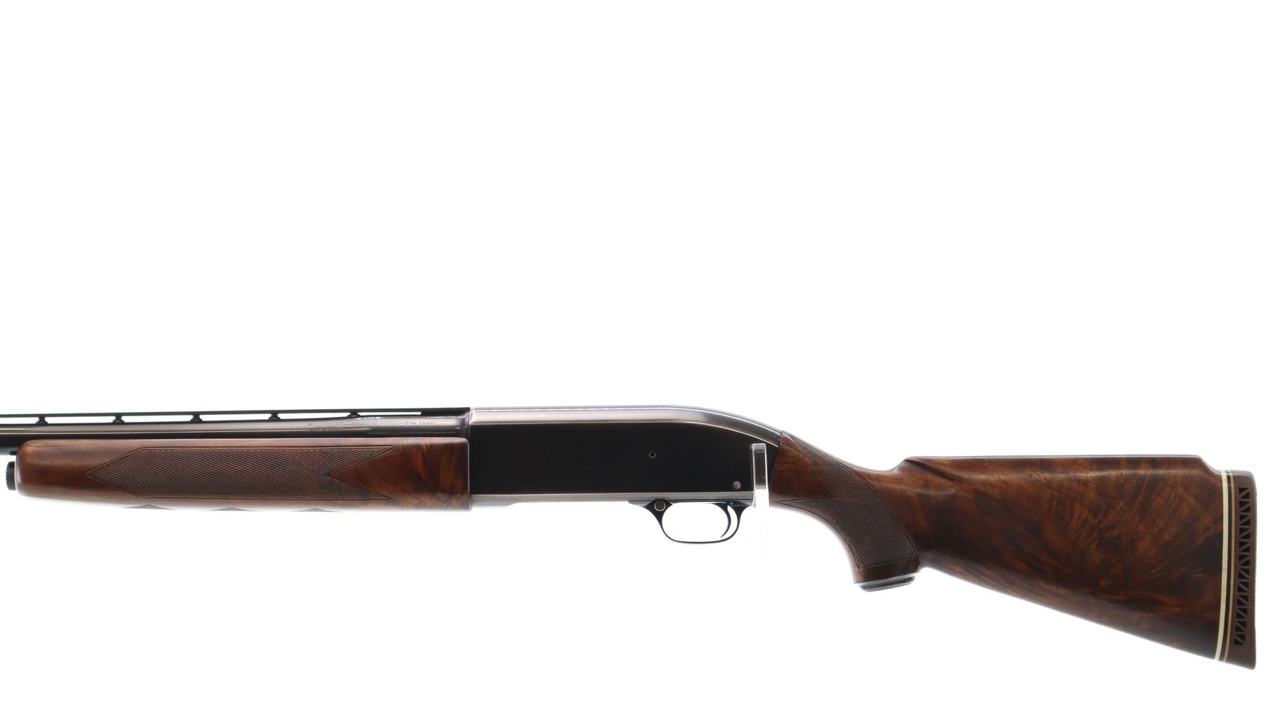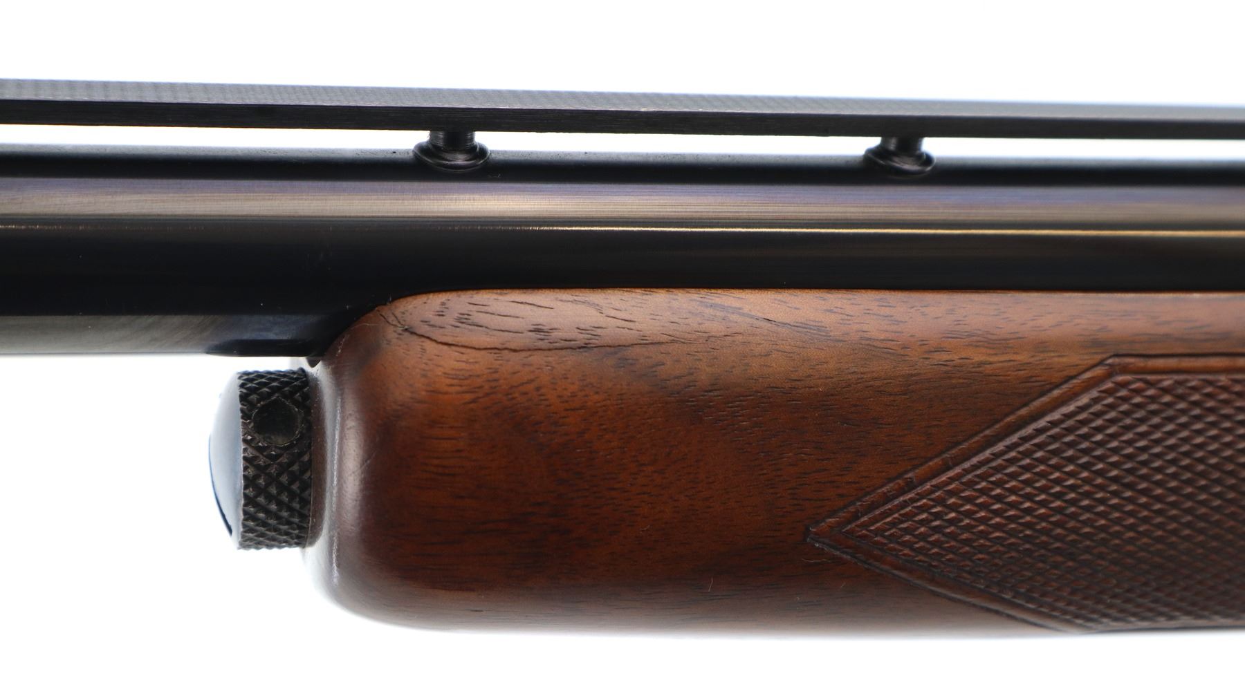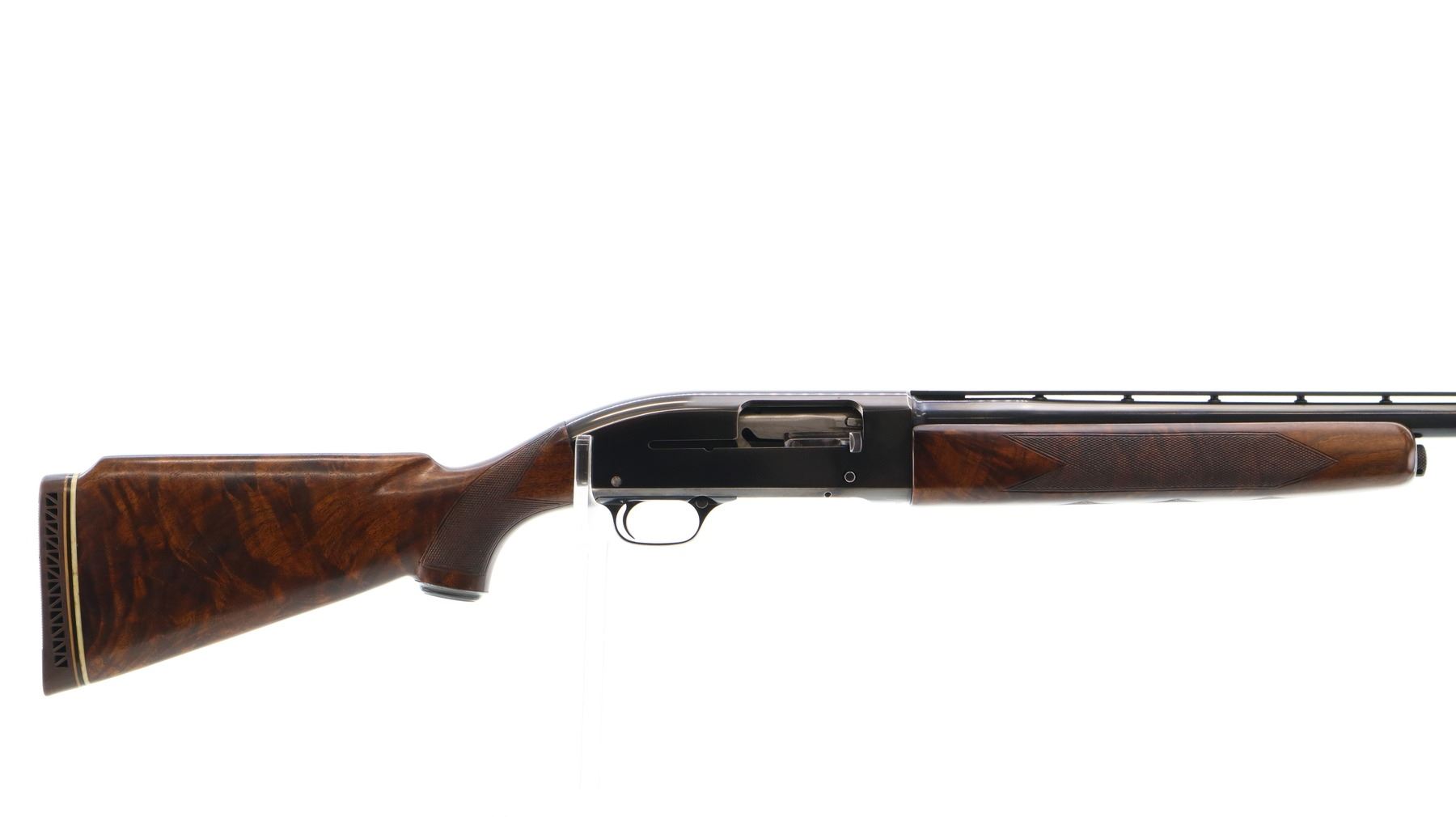 Main Description: Manufactured 1956. Red front and silver mid rib beads, polish blued finish, vent rib barrel. Two piece satin finish wood stocks with nicely figured wood grain, checkered forearm cracked on left side, checkered pistol grip, raised comb, brown vented rubber recoil pad, steel grip cap.