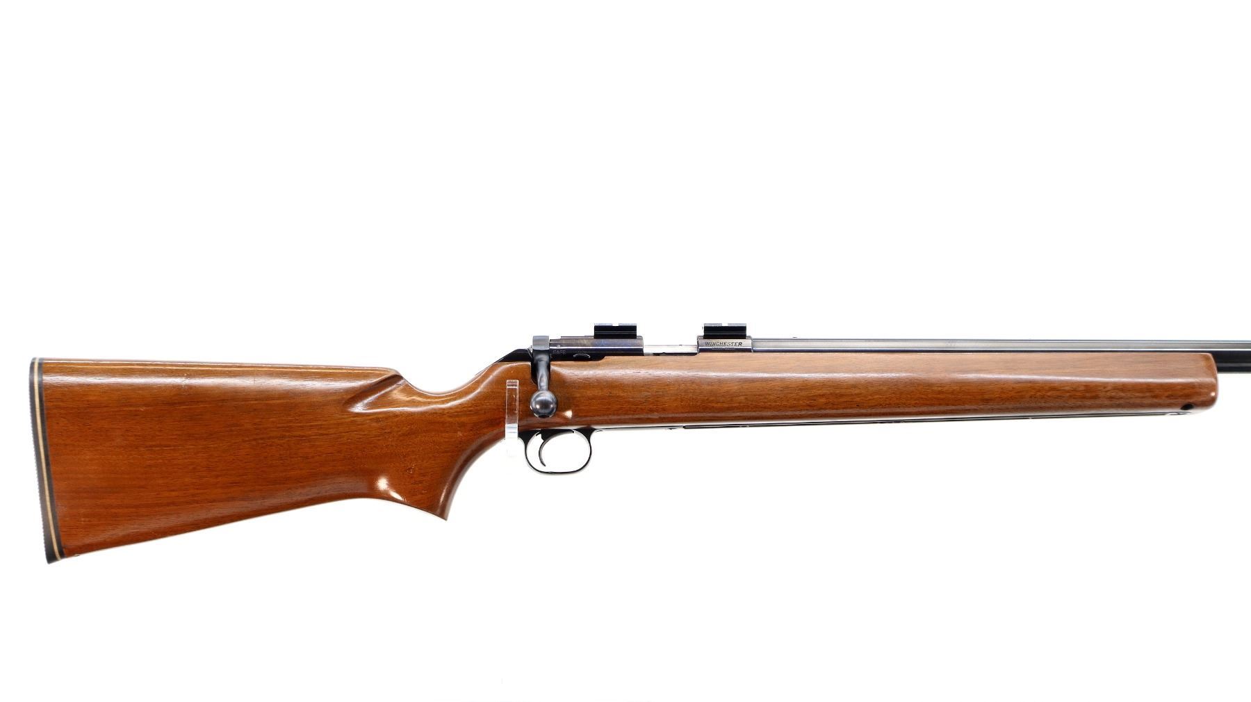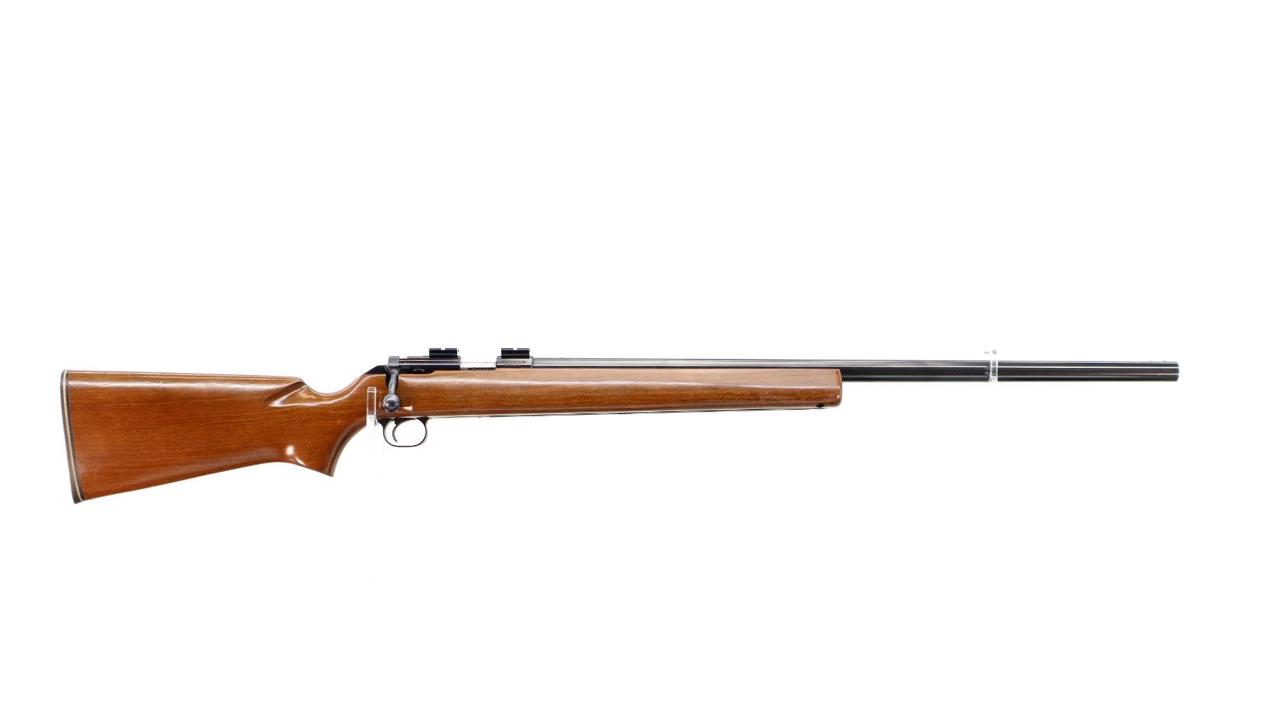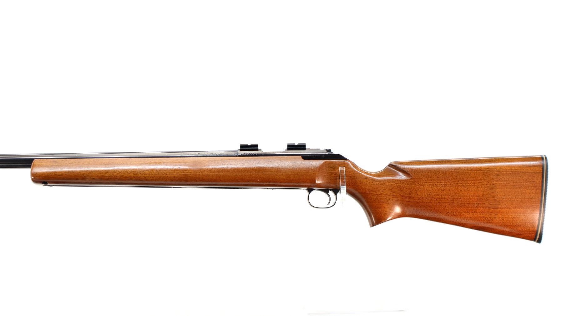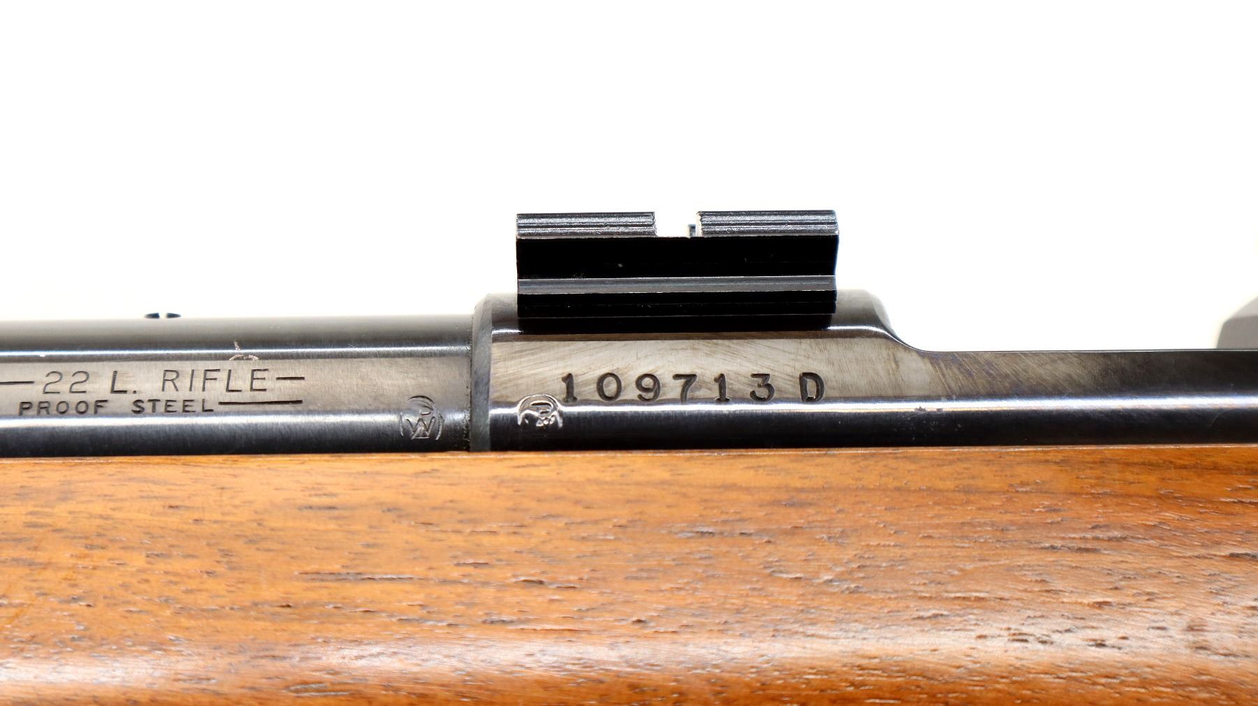 Main Description: Manufactured 1963. No sights, blued finish, heavy barrel drilled and tapped with 6 plug screws installed, receiver drilled and tapped with two piece scope bases, smooth bolt knob. One piece target wood stock, wide forearm with full length rail on bottom, pistol grip, grooved black rubber recoil pad.