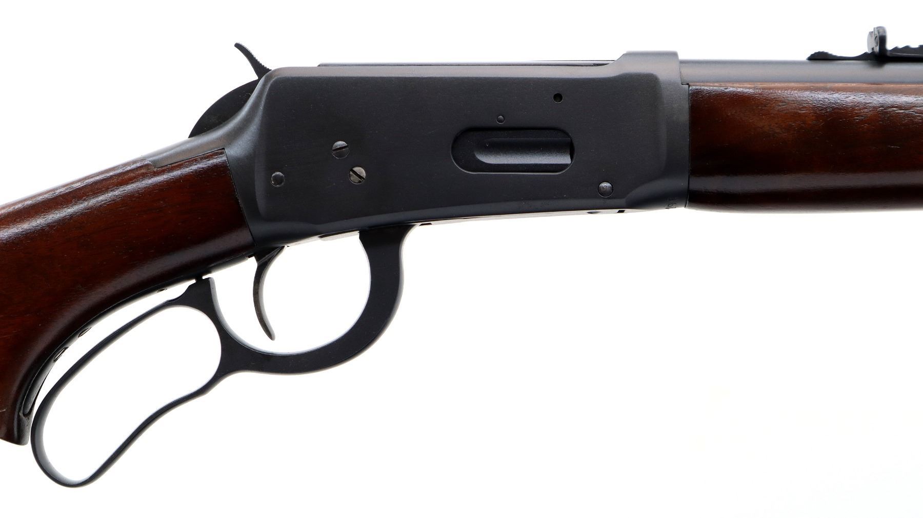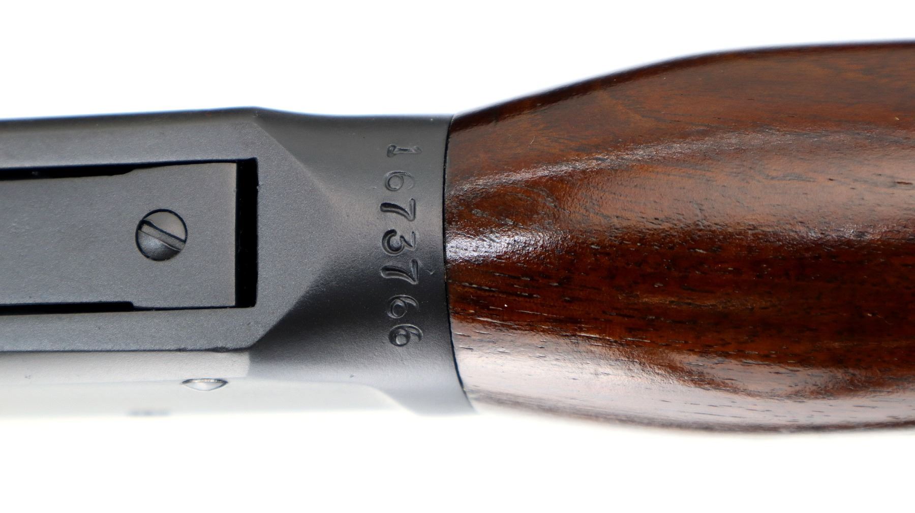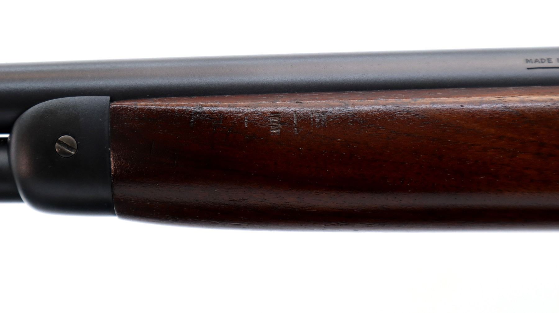 Main Description: Manufactured 1950. Blade front sight with ramp, adjustable u notched rear sight, matte blued metal finish with light pitting underneath, grooved spur hammer. Two piece wood stocks, pistol grip, checkered steel butt plate, 2/3rd length button magtube.
