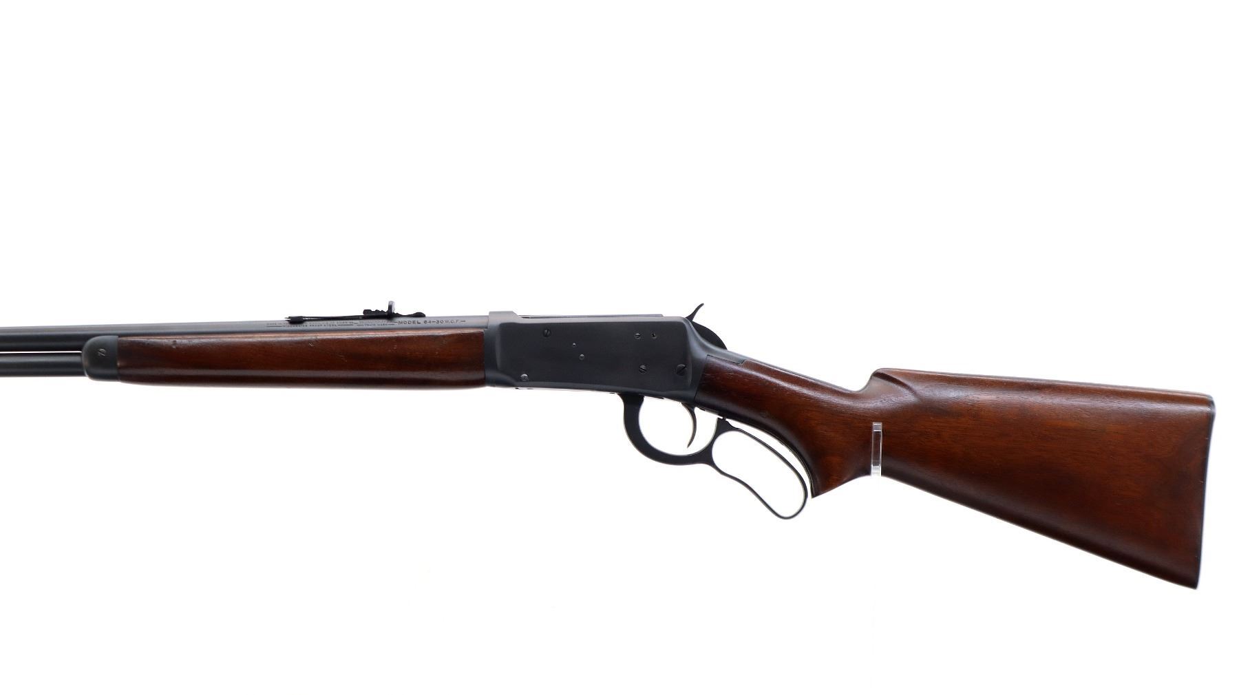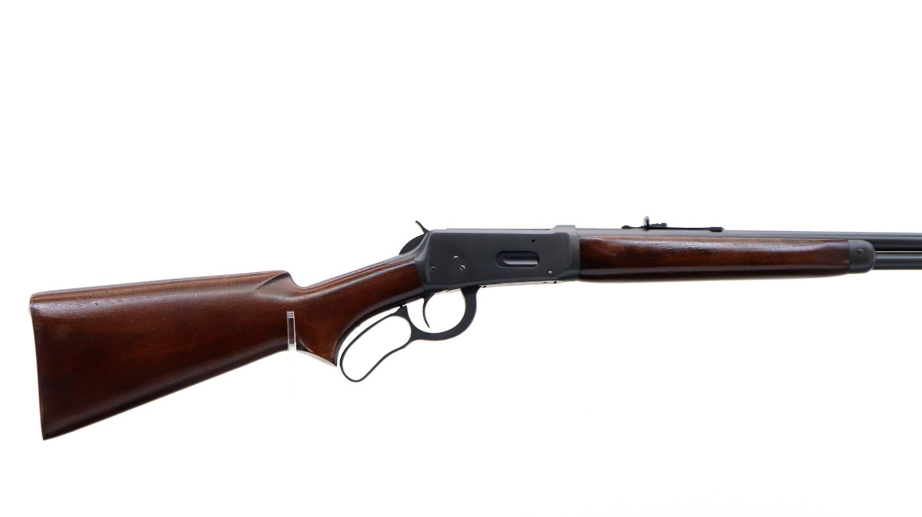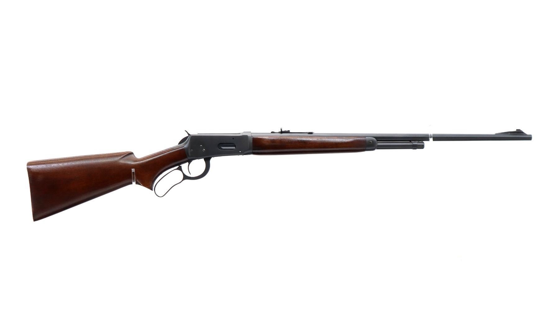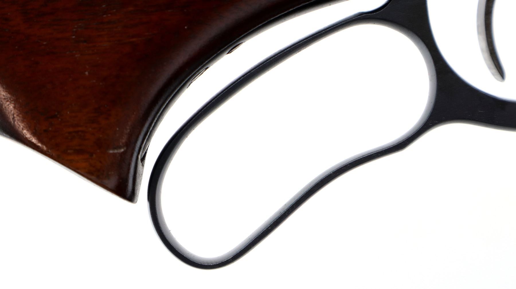 Main Description: Manufactured 1950. Blade front sight with ramp, adjustable u notched rear sight, matte blued metal finish with light pitting underneath, grooved spur hammer. Two piece wood stocks, pistol grip, checkered steel butt plate, 2/3rd length button magtube.