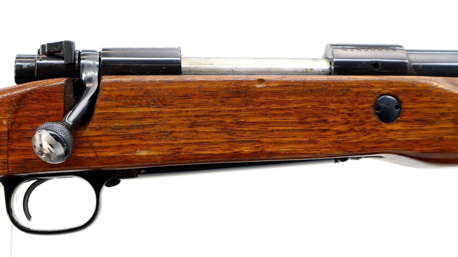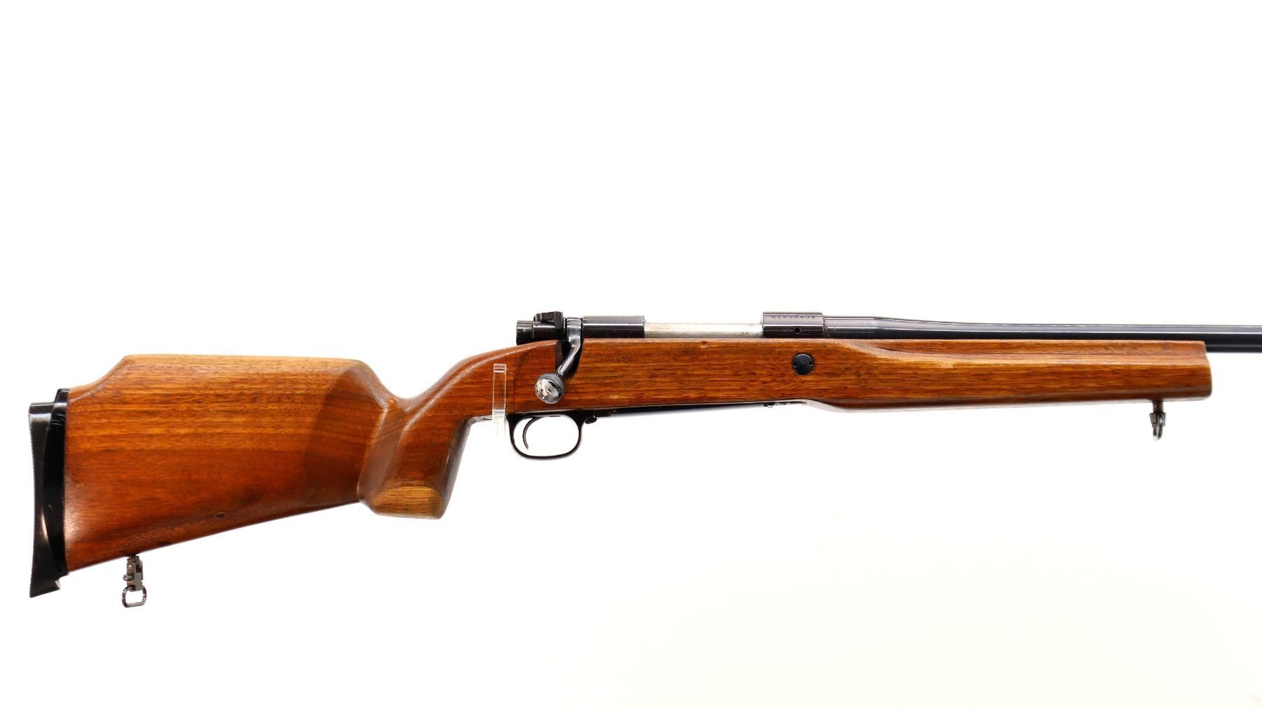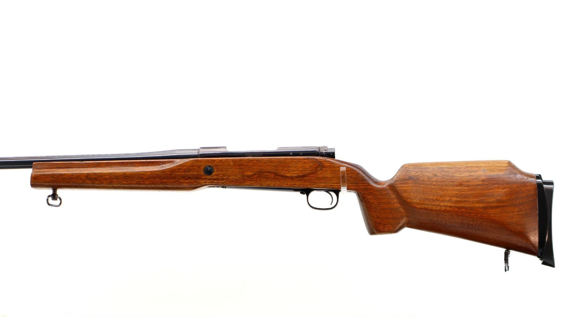 Main Description: No sights, blued finish, heavy barrel, receiver drilled and tapped with no plug screws installed, push feed bolt with checkered knob that has been modified. One piece custom target wood stock, finger grooved forearm, pistol grip, cheek rest, adjustable checkered black polymer butt plate, trigger guard has been bedded, sling swivels.