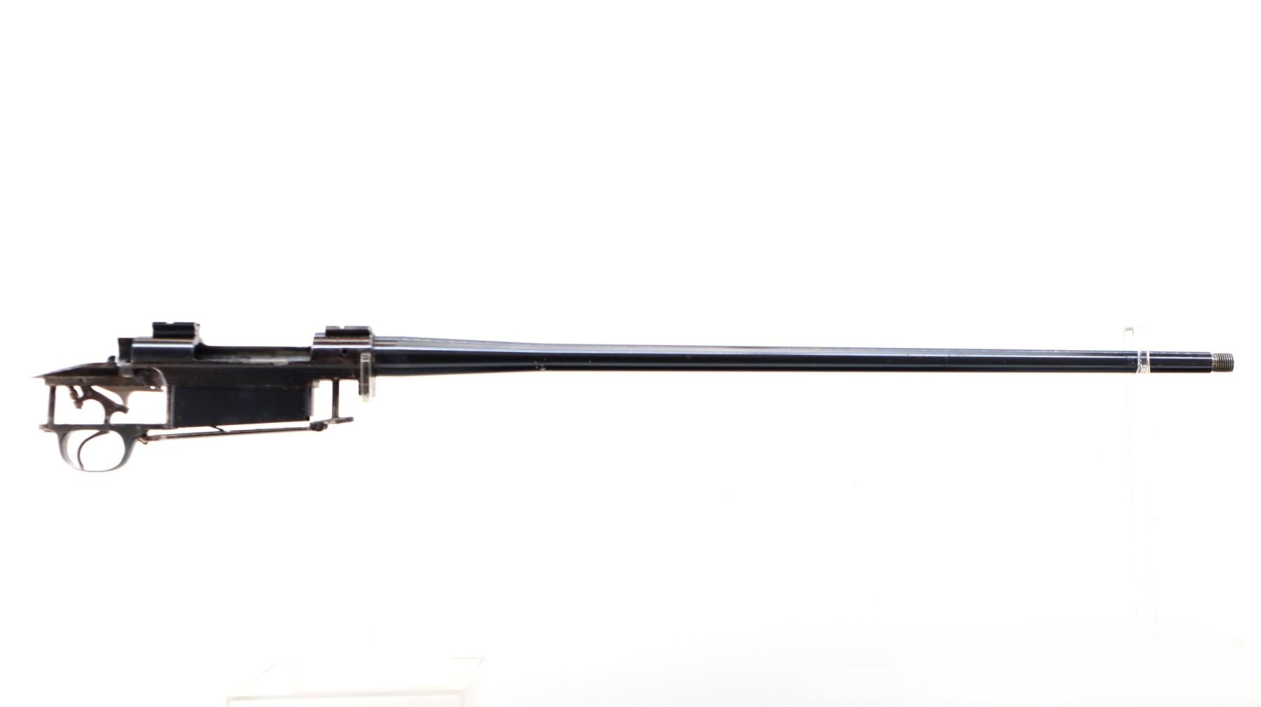 Main Description: This rifle is missing front and rear sights, complete bolt, stock assembly and associated parts. Blued finish, barrel has threaded holes present, receiver drilled and tapped with two piece scope bases, has trigger guard, hinged floor plate, mag box plus parts, action screws, trigger and sear and bolt stop. Threaded muzzle with no cap.