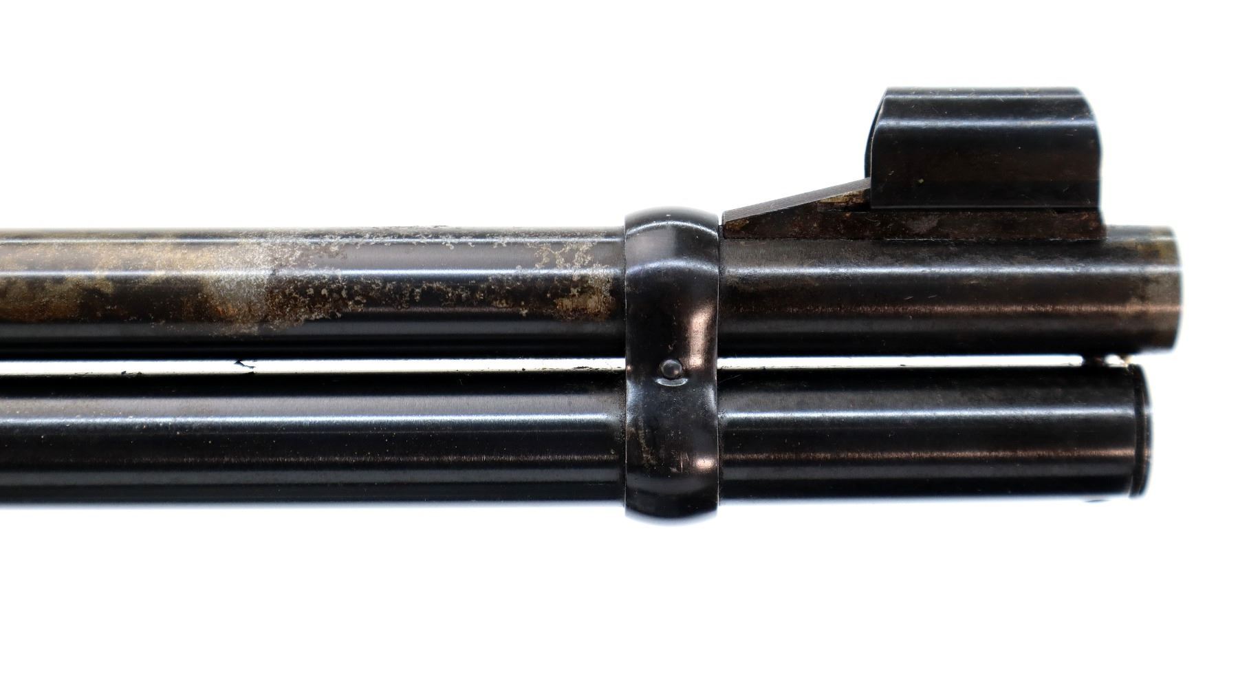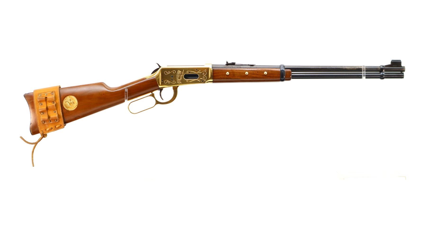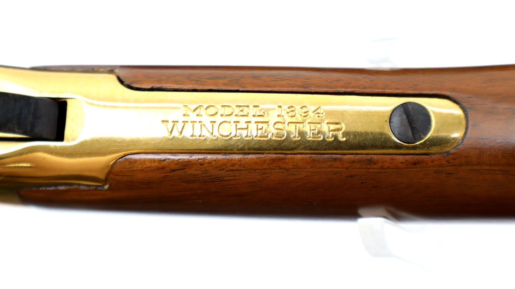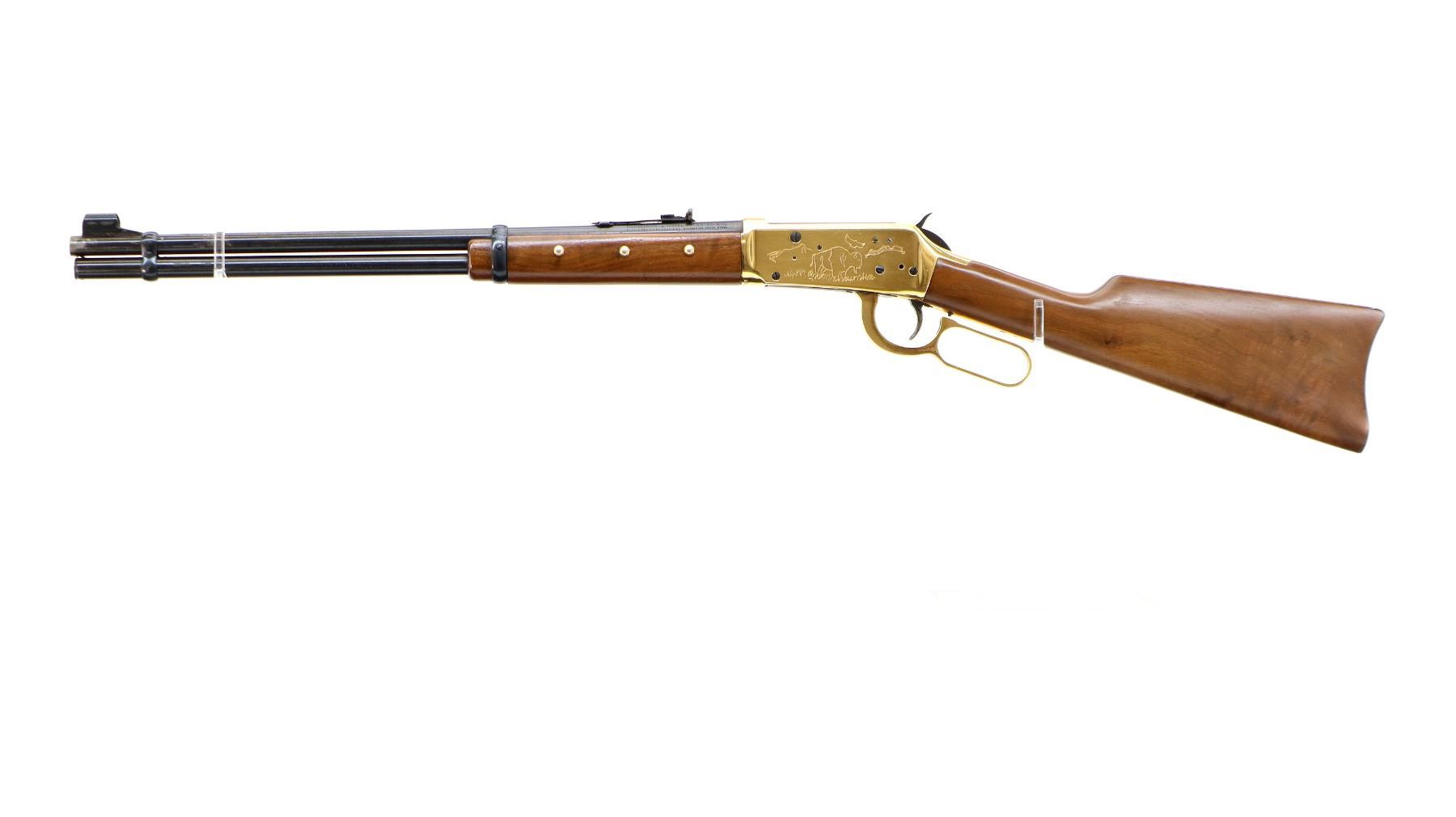 Main Description: Blade front sight with hood and ramp, adjustable u notched rear sight, blued round barrel, bolt, grooved spur hammer and full length magtube. Engraved gold receiver. Two piece wood stocks, forearm has 6 gold tacks, straight grip, smooth steel butt plate, slip on brown leather shell holder, medallion in right side of stock.