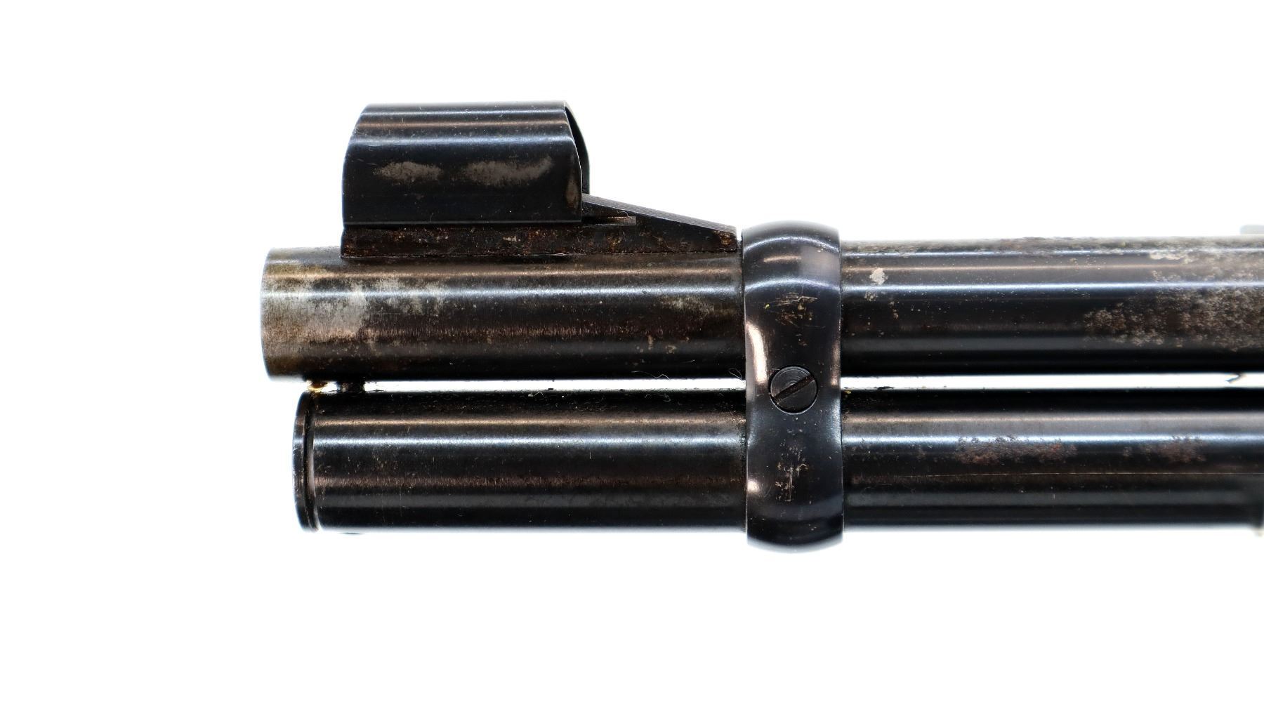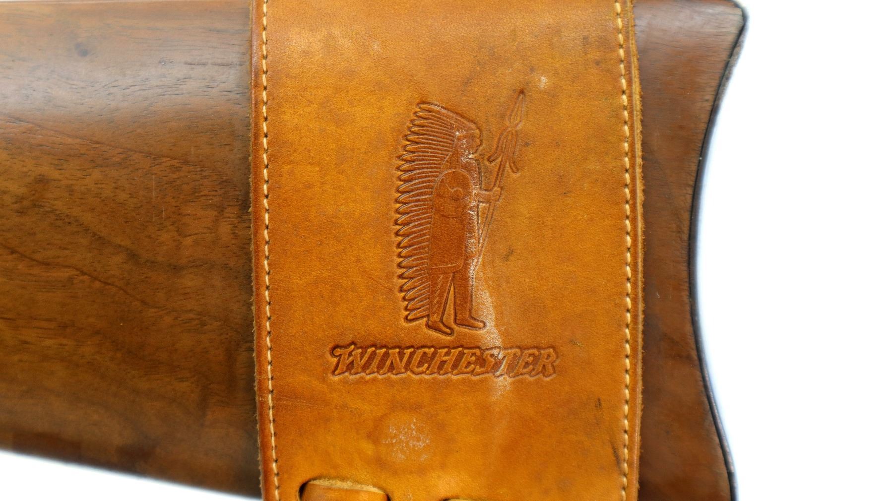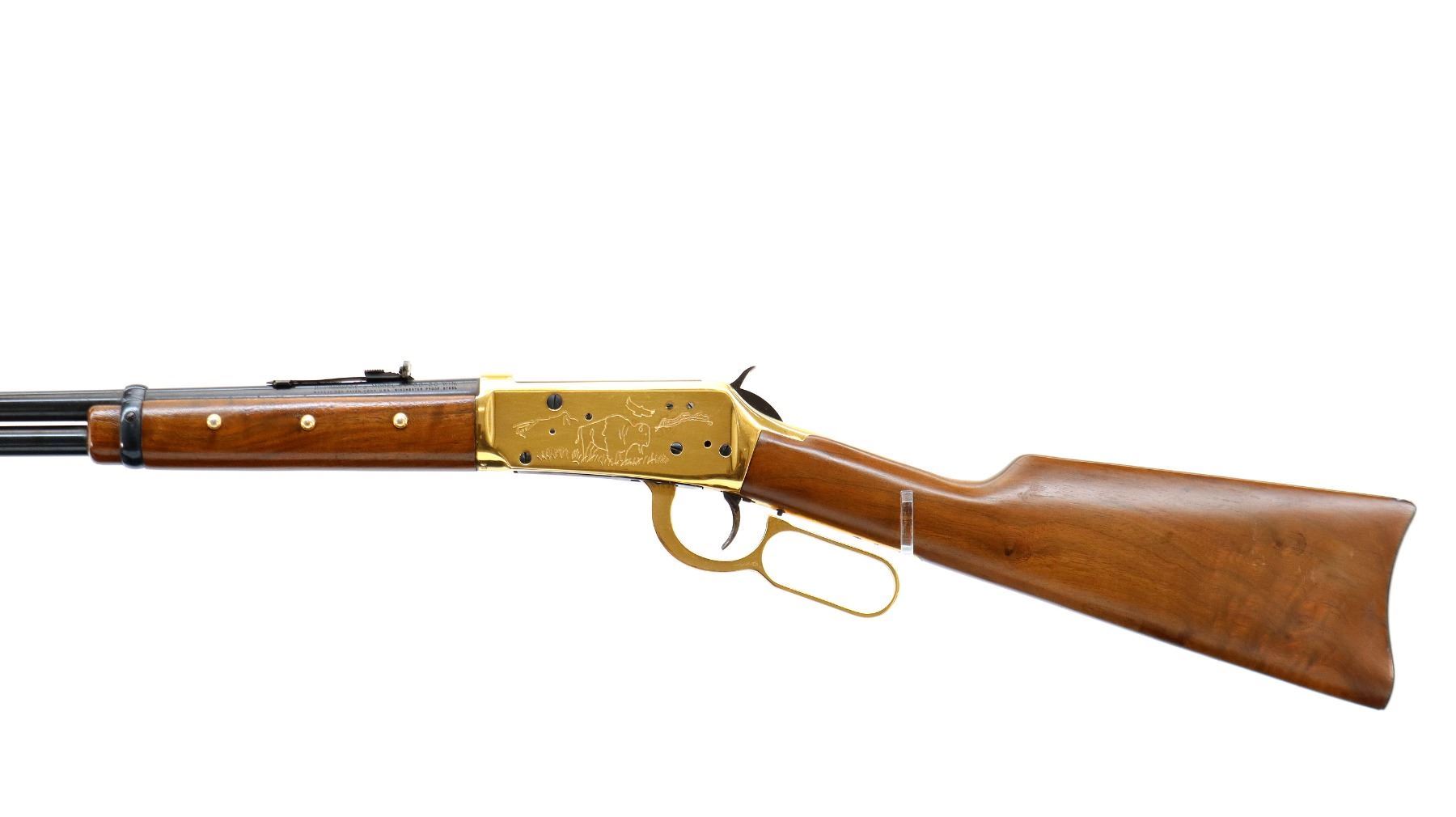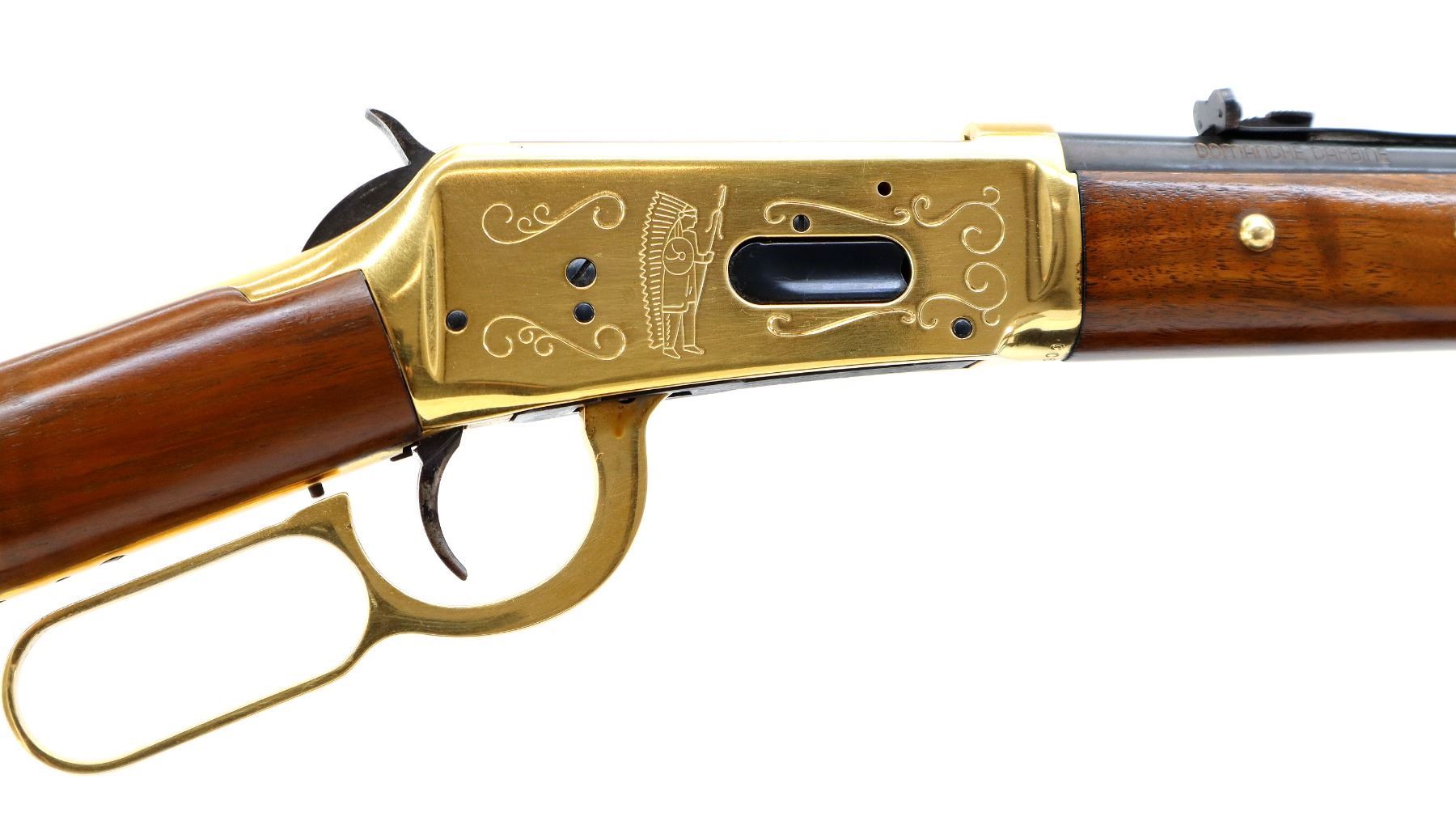 Main Description: Blade front sight with hood and ramp, adjustable u notched rear sight, blued round barrel, bolt, grooved spur hammer and full length magtube. Engraved gold receiver. Two piece wood stocks, forearm has 6 gold tacks, straight grip, smooth steel butt plate, slip on brown leather shell holder, medallion in right side of stock.