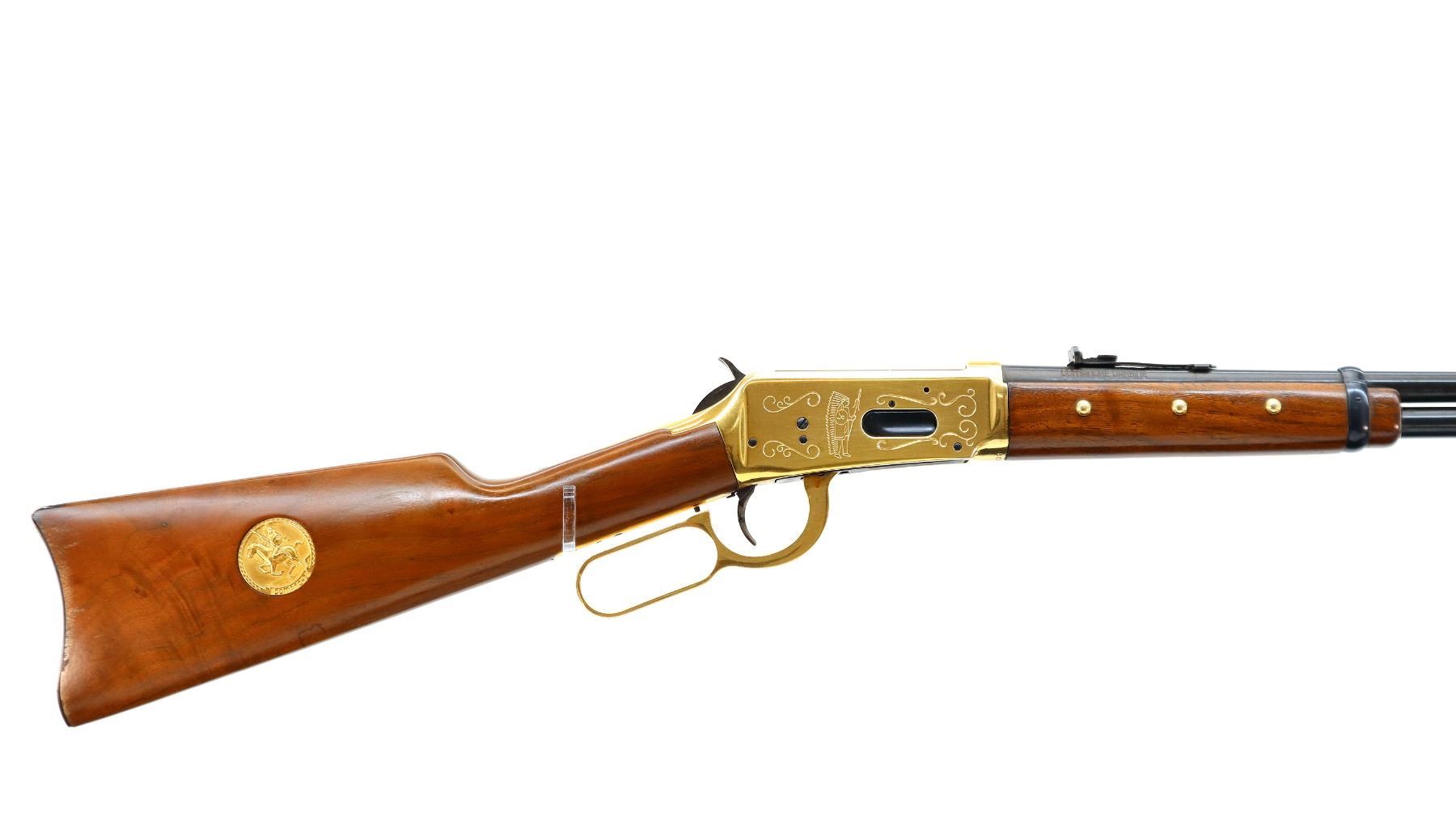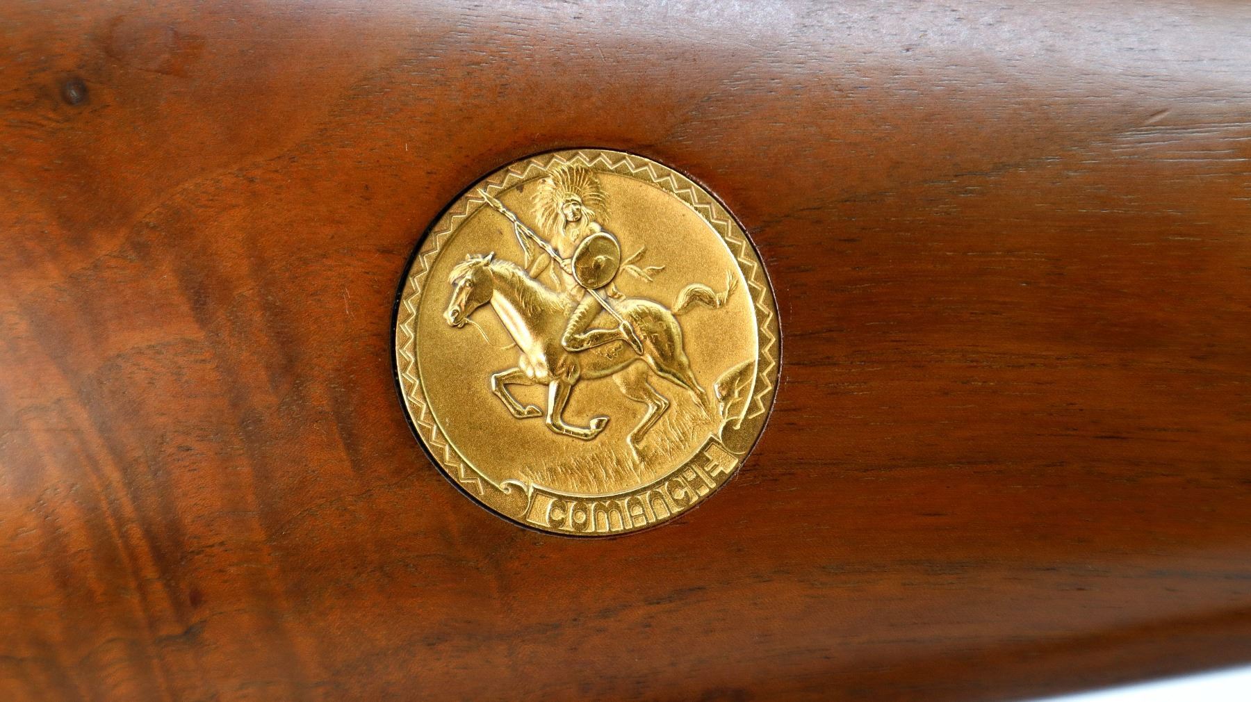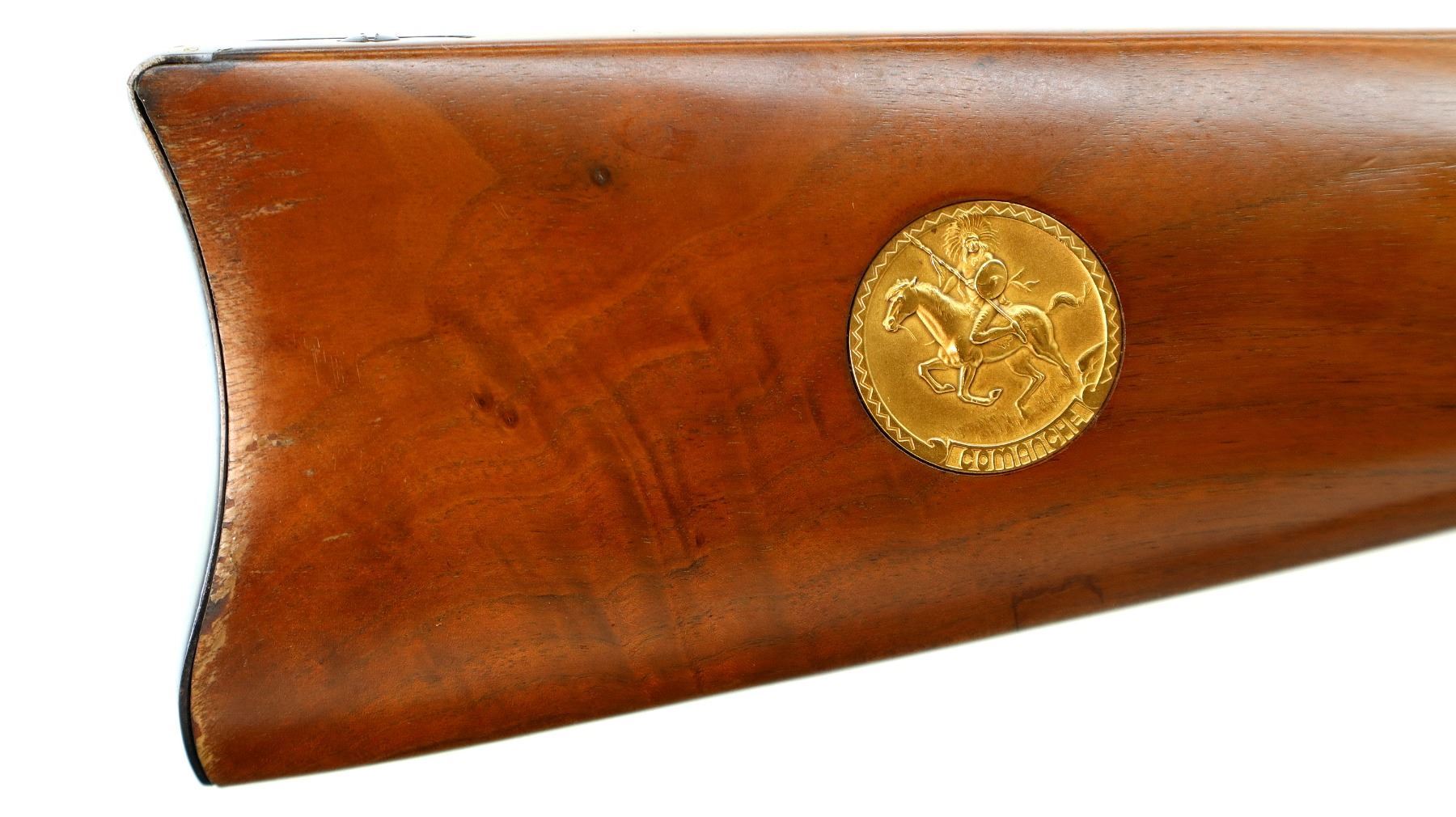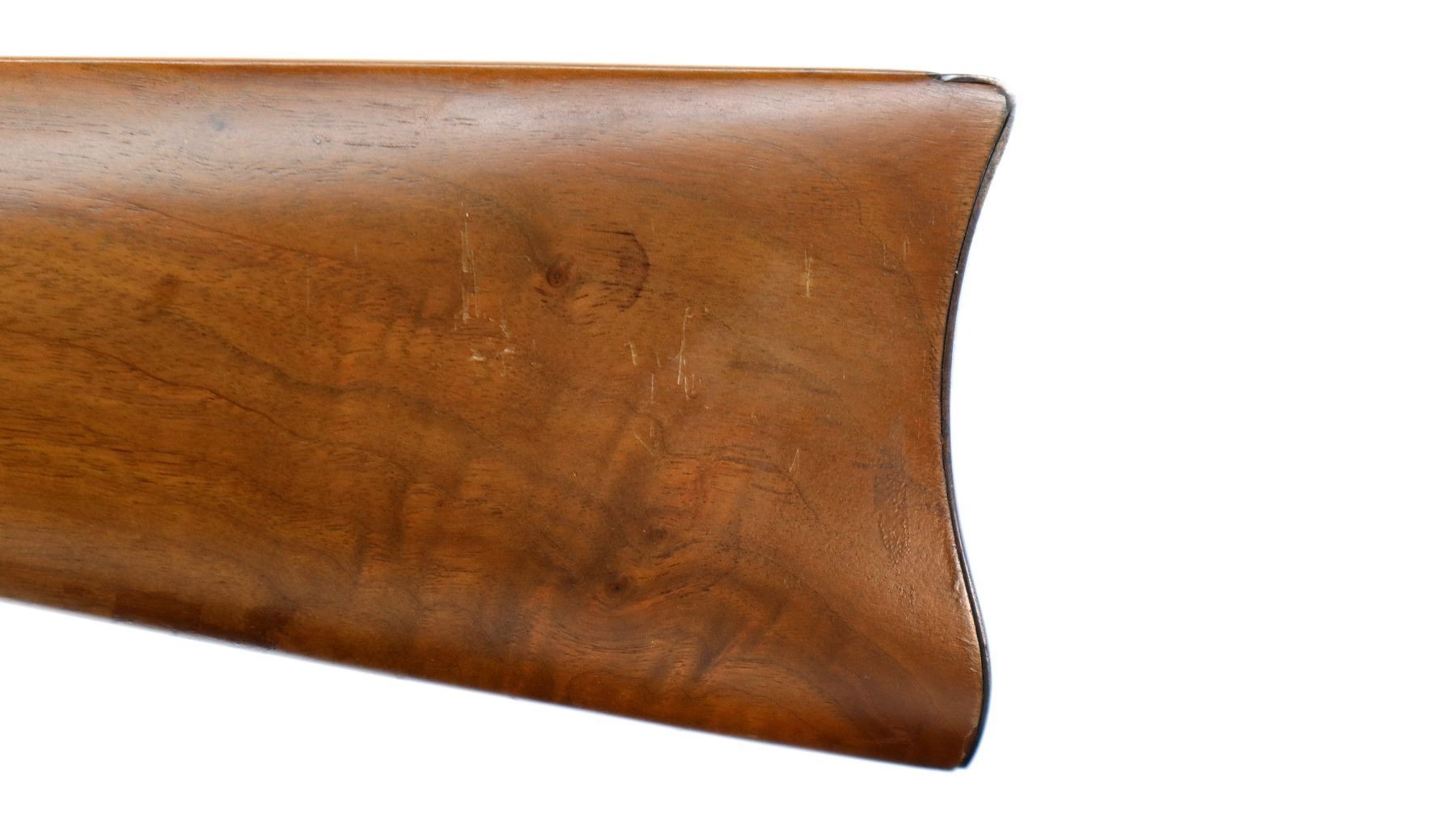 Main Description: Blade front sight with hood and ramp, adjustable u notched rear sight, blued round barrel, bolt, grooved spur hammer and full length magtube. Engraved gold receiver. Two piece wood stocks, forearm has 6 gold tacks, straight grip, smooth steel butt plate, slip on brown leather shell holder, medallion in right side of stock.