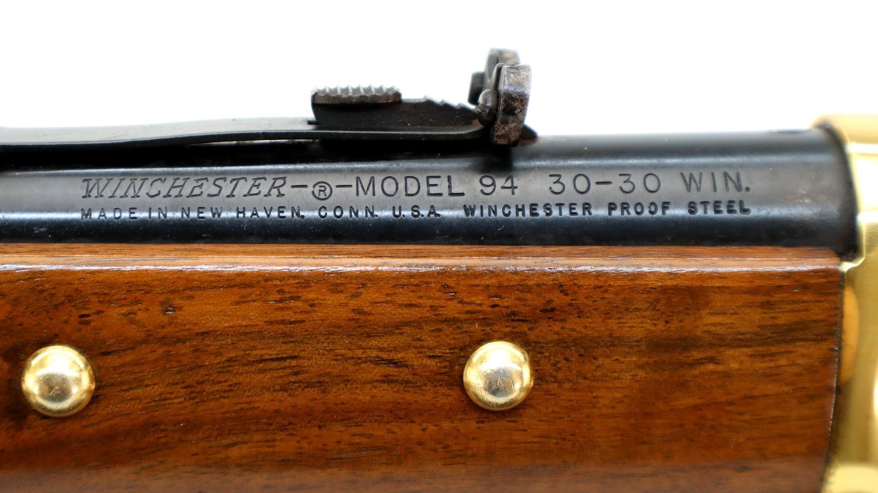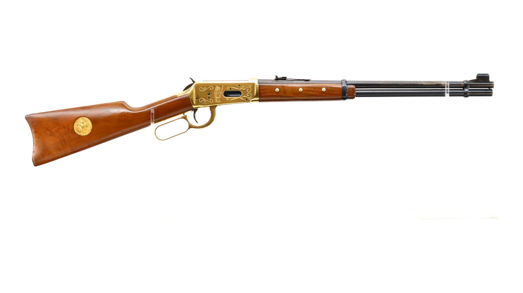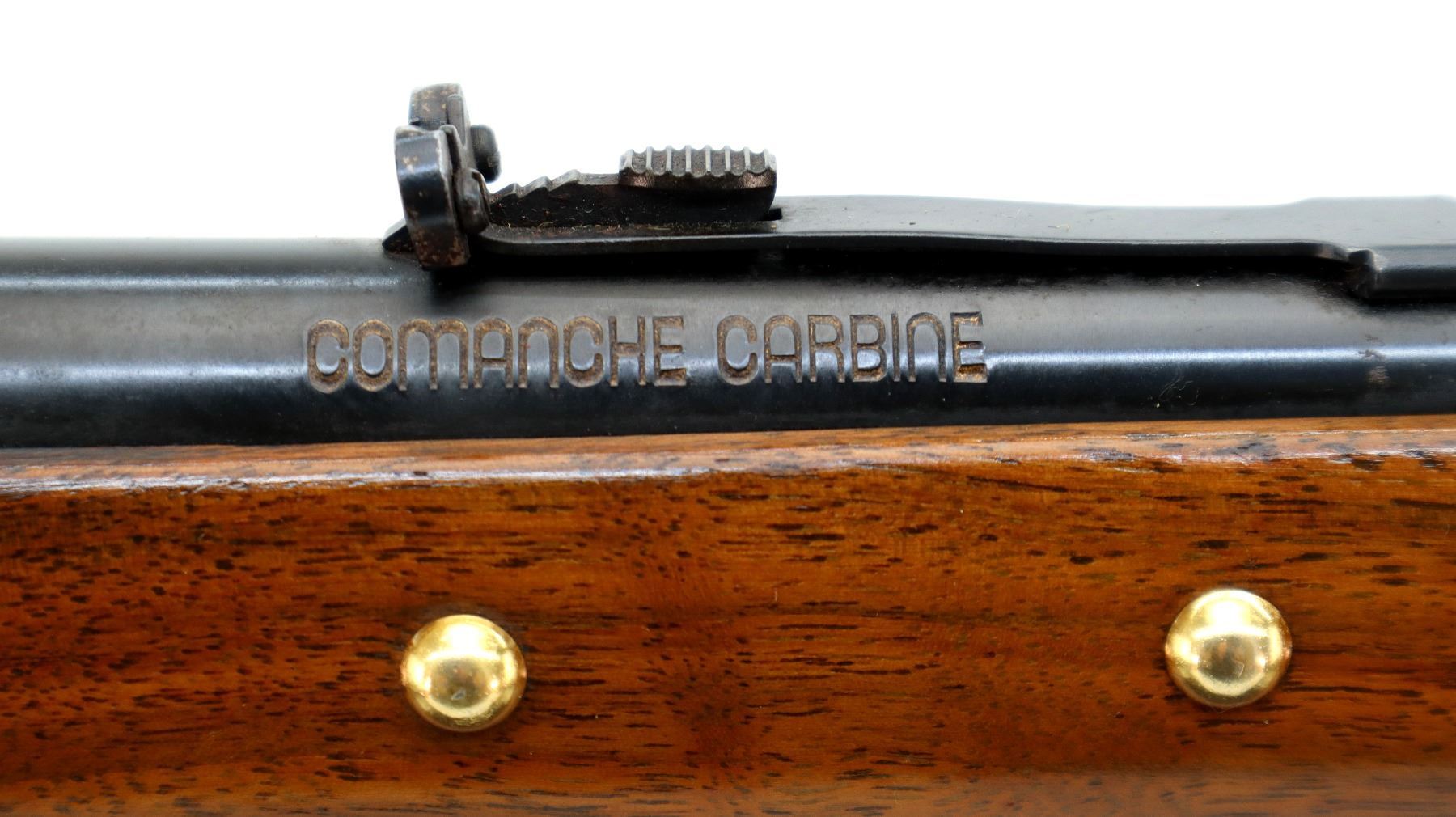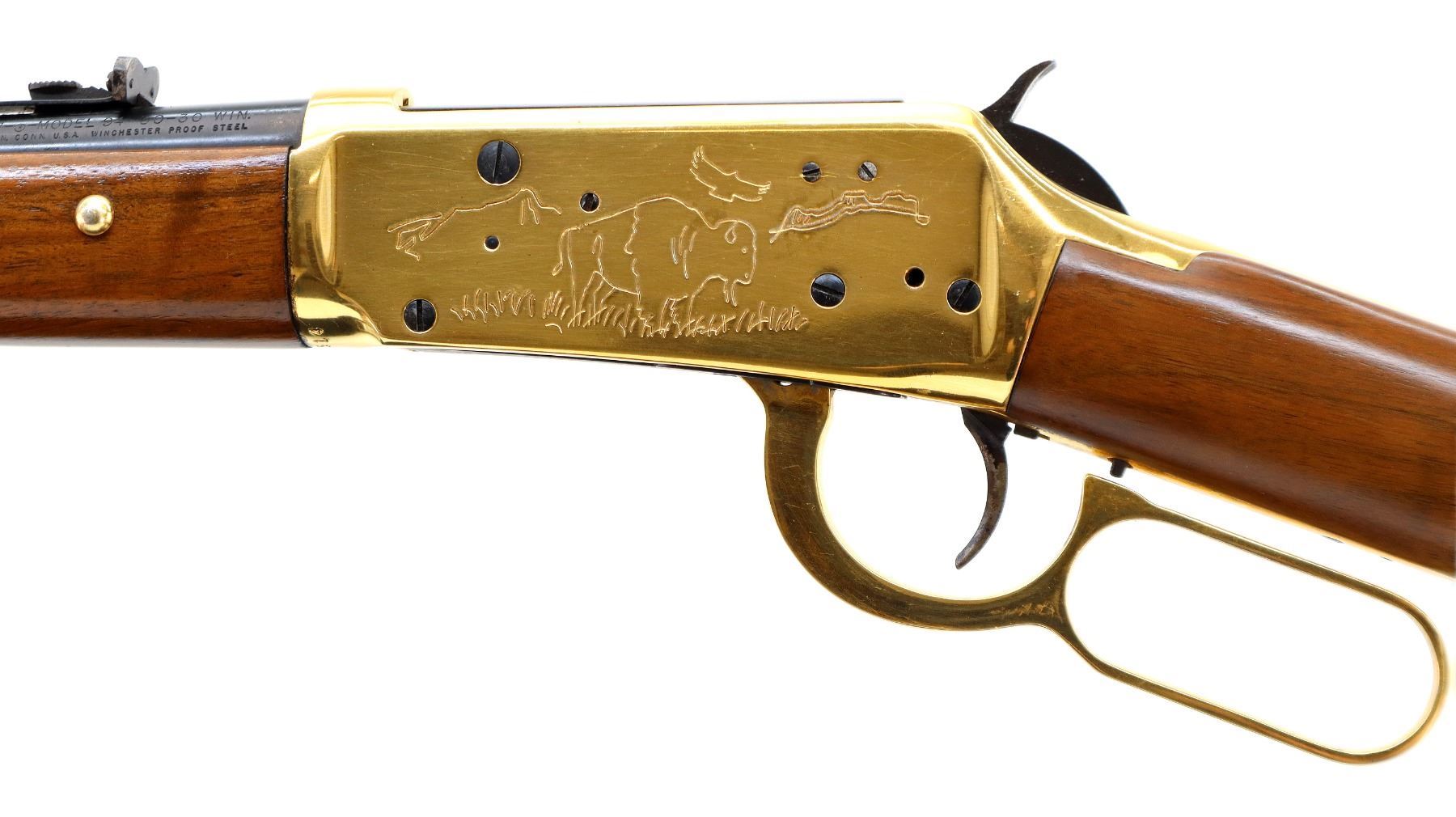 Main Description: Blade front sight with hood and ramp, adjustable u notched rear sight, blued round barrel, bolt, grooved spur hammer and full length magtube. Engraved gold receiver. Two piece wood stocks, forearm has 6 gold tacks, straight grip, smooth steel butt plate, slip on brown leather shell holder, medallion in right side of stock.