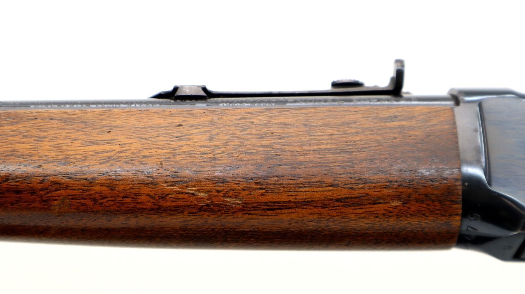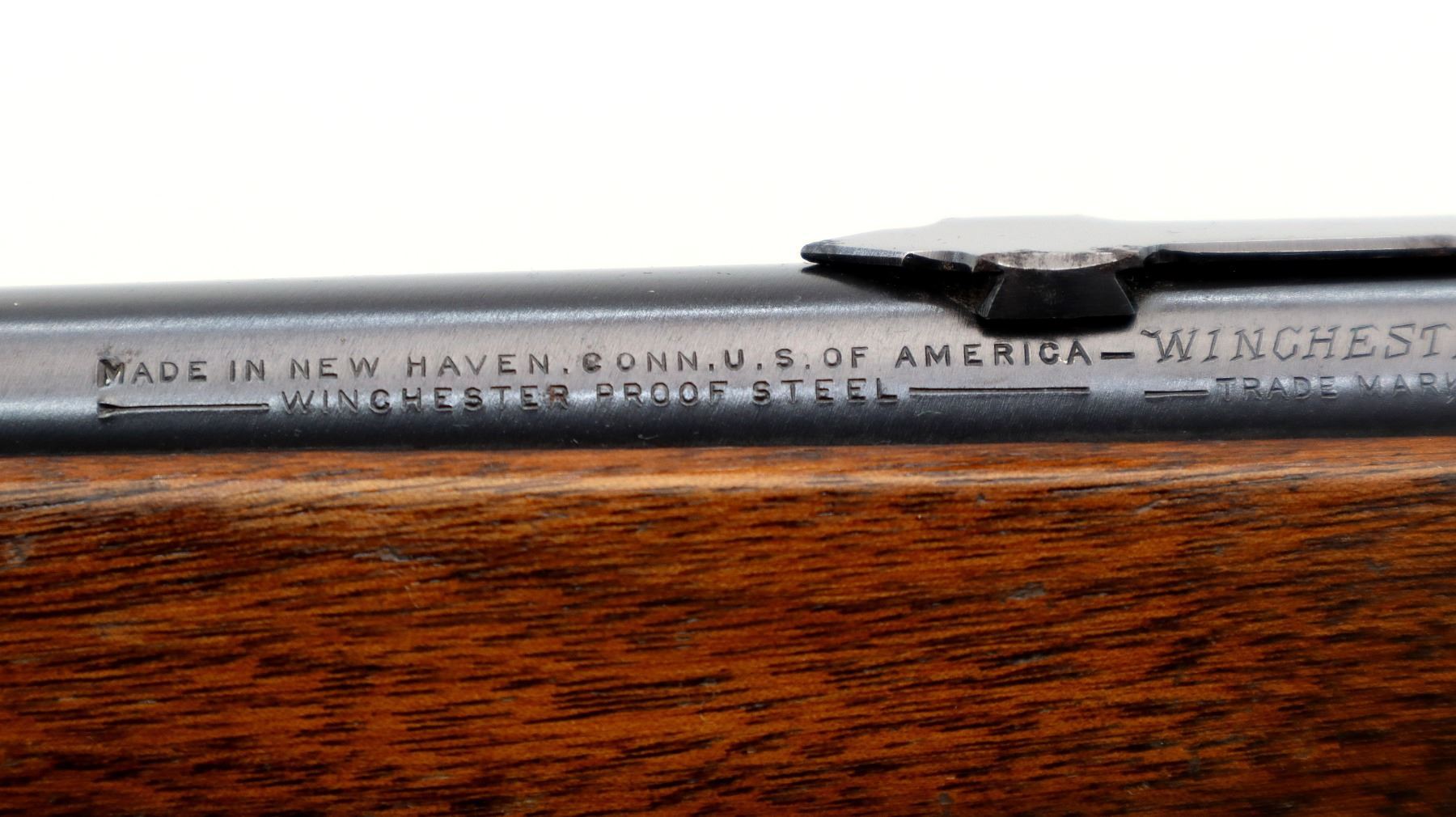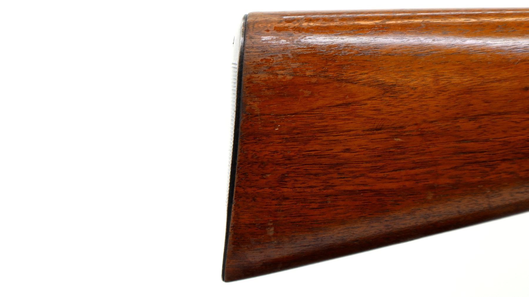 Main Description: Manufactured 1941. Blade front sight with ramp, adjustable u notched rear sight, blued finish, checkered spur hammer. Two piece wood stocks, straight grip, grooved steel shotgun butt plate, full length magtube.