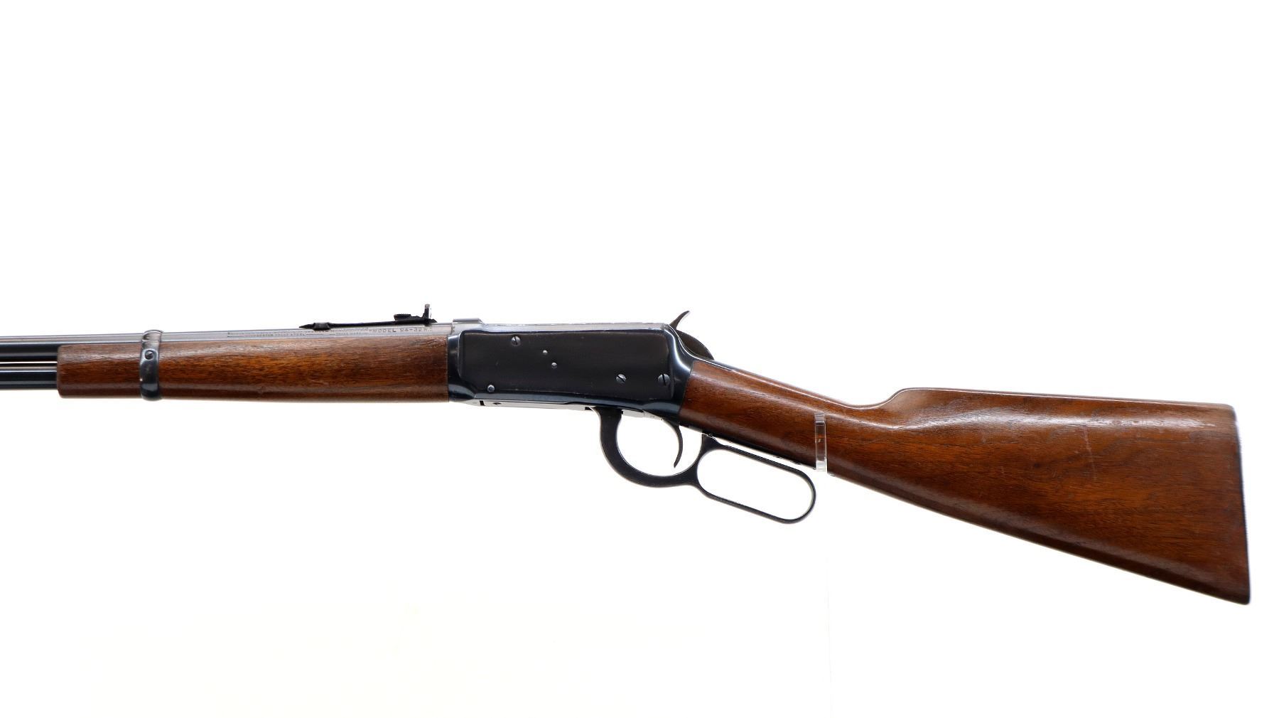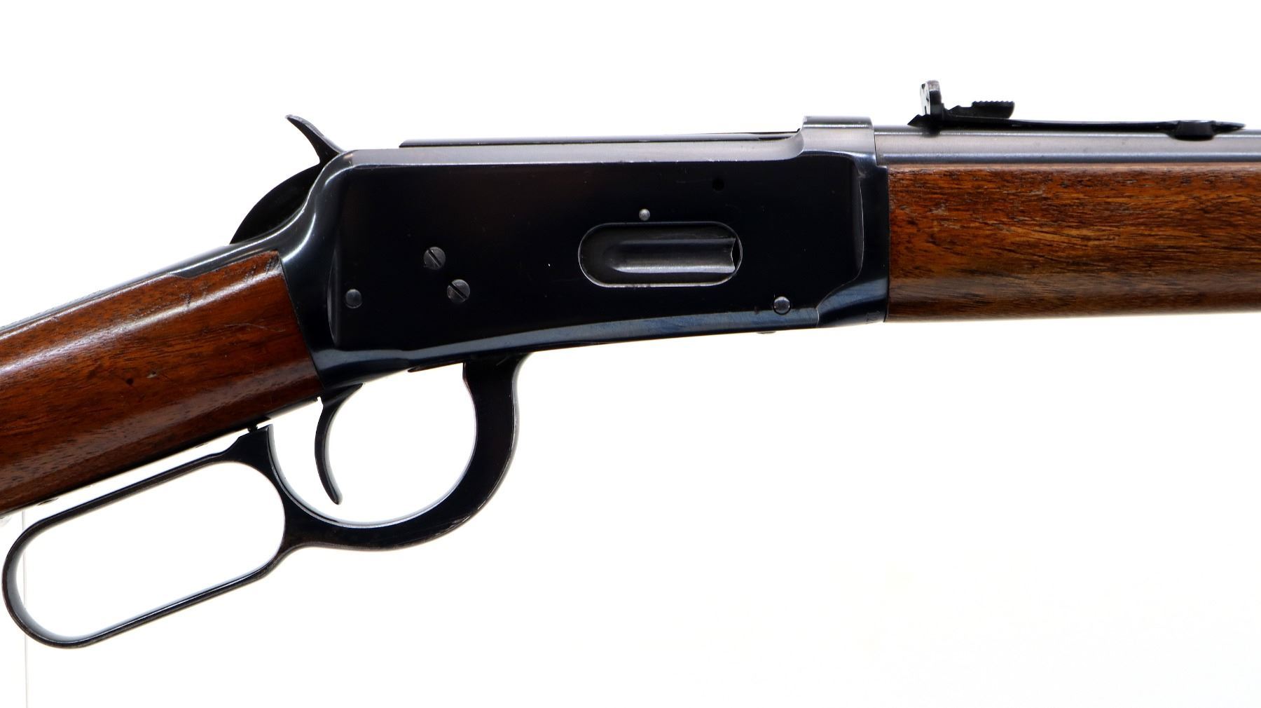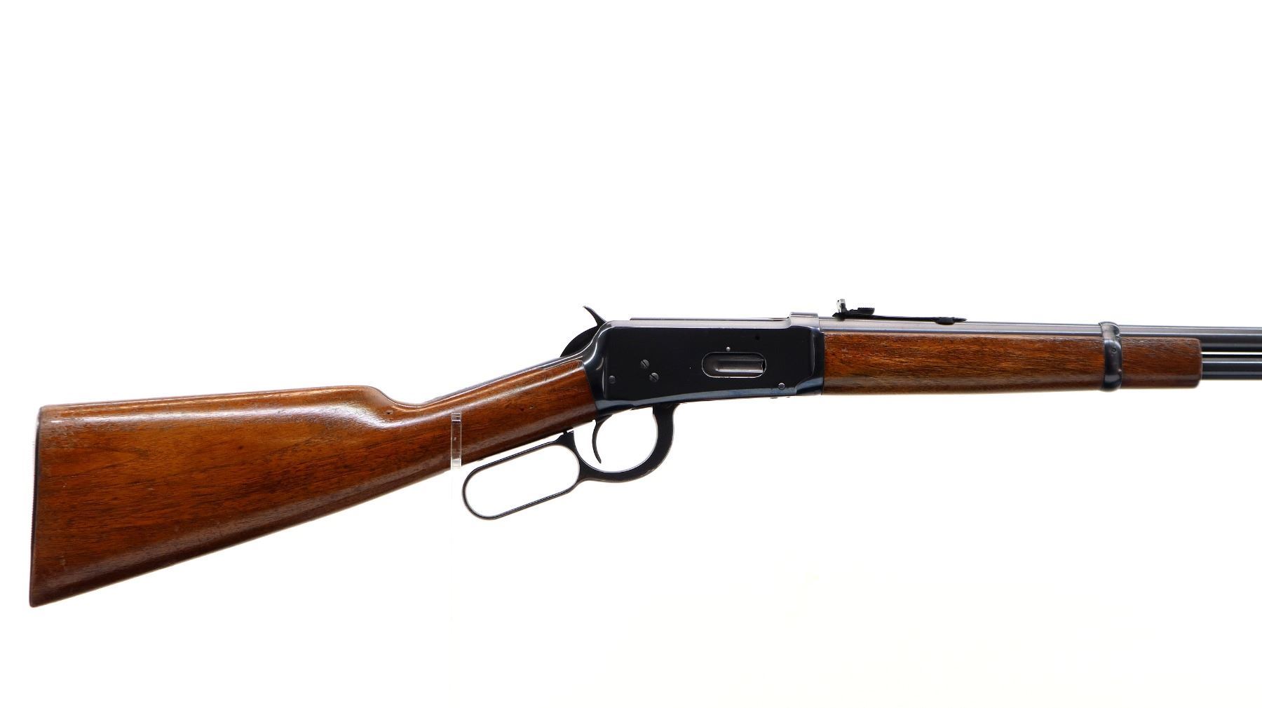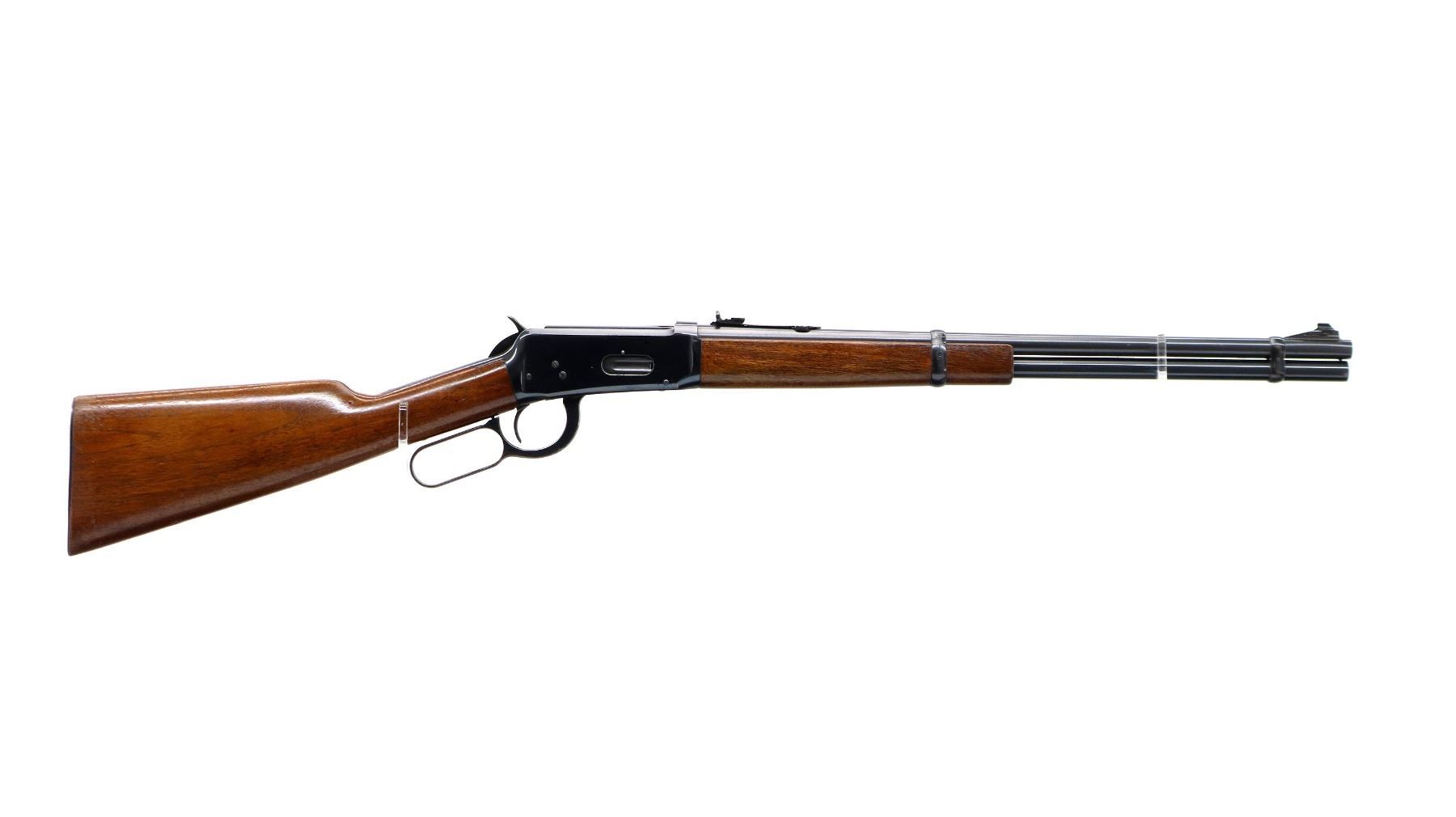 Main Description: Manufactured 1941. Blade front sight with ramp, adjustable u notched rear sight, blued finish, checkered spur hammer. Two piece wood stocks, straight grip, grooved steel shotgun butt plate, full length magtube.