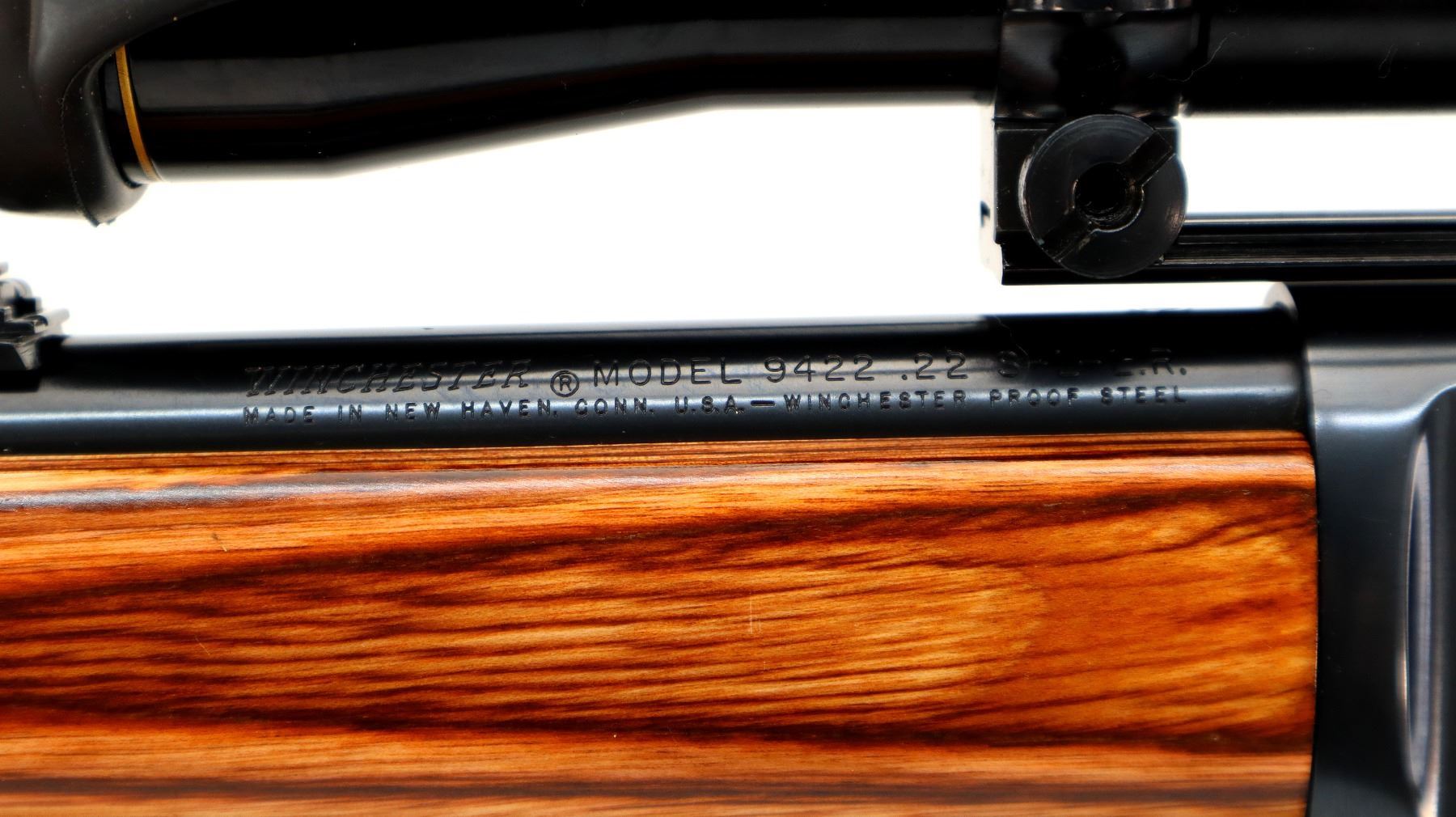 Main Description: Red fiber optic blade front sight with hood and ramp, adjustable folding u notched rear sight, polish blued finish, grooved receiver with one piece base 1" rings and Leupold FX-1 4x28 Rimfire scope installed, clear optics with duplex crosshair. Grooved hammer with checkered extension. Two piece brown laminate wood stocks, straight grip, checkered steel butt plate, swivel studs, full length magtube.