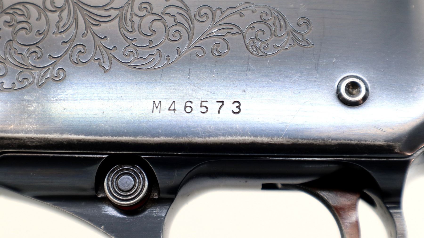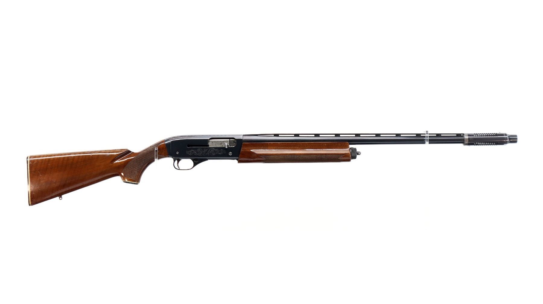 Main Description: Silver bead, blued finish, vent rib barrel with ported Cutts Compensator installed, engraved receiver, jewelled bolt. Two piece wood stocks, finger grooved checkered forearm which is cracked, checkered pistol grip and black polymer butt plate, grip cap missing center, swivel studs.