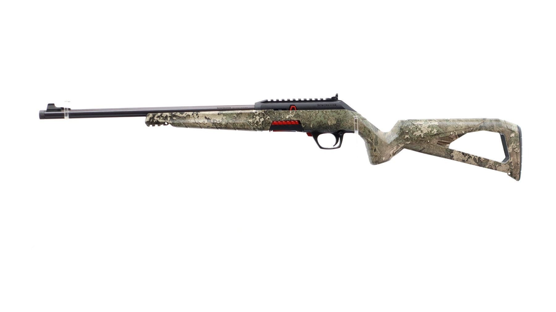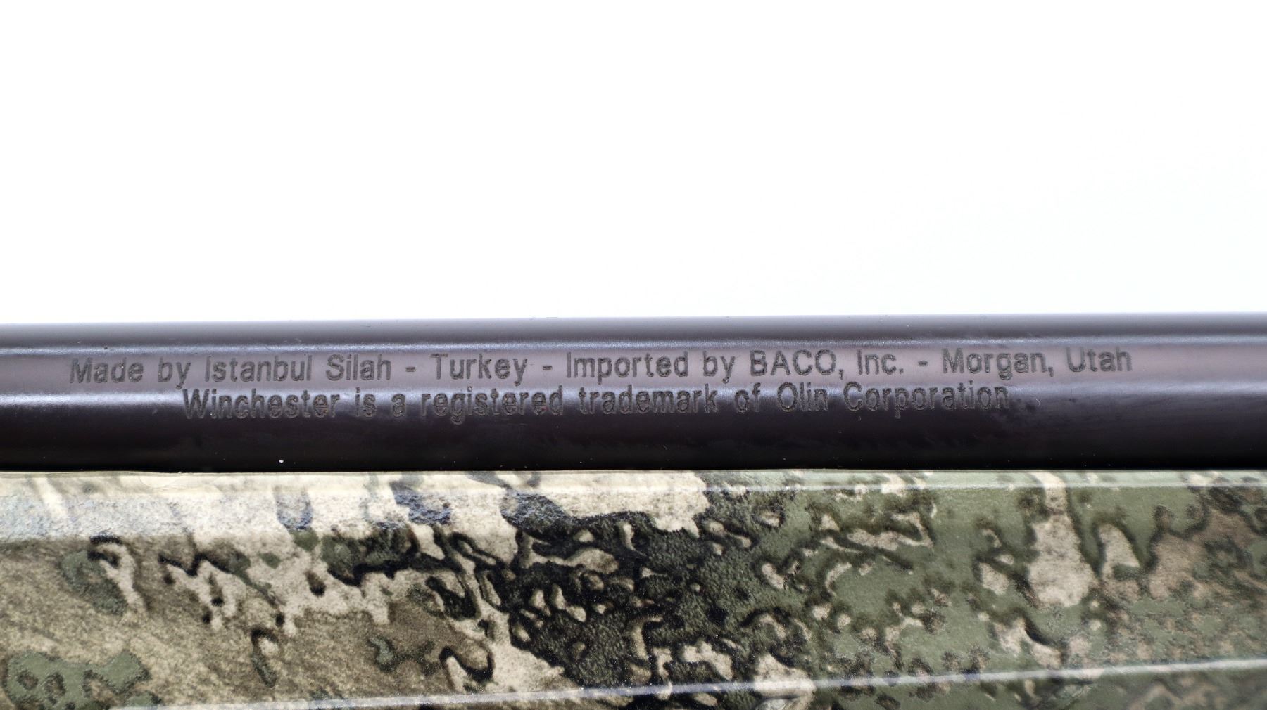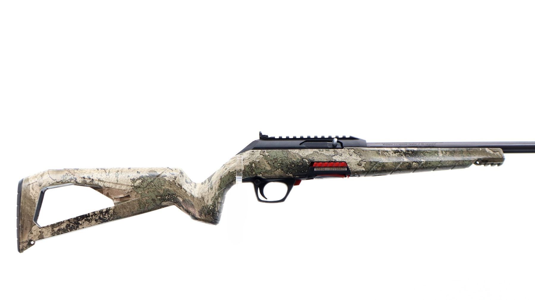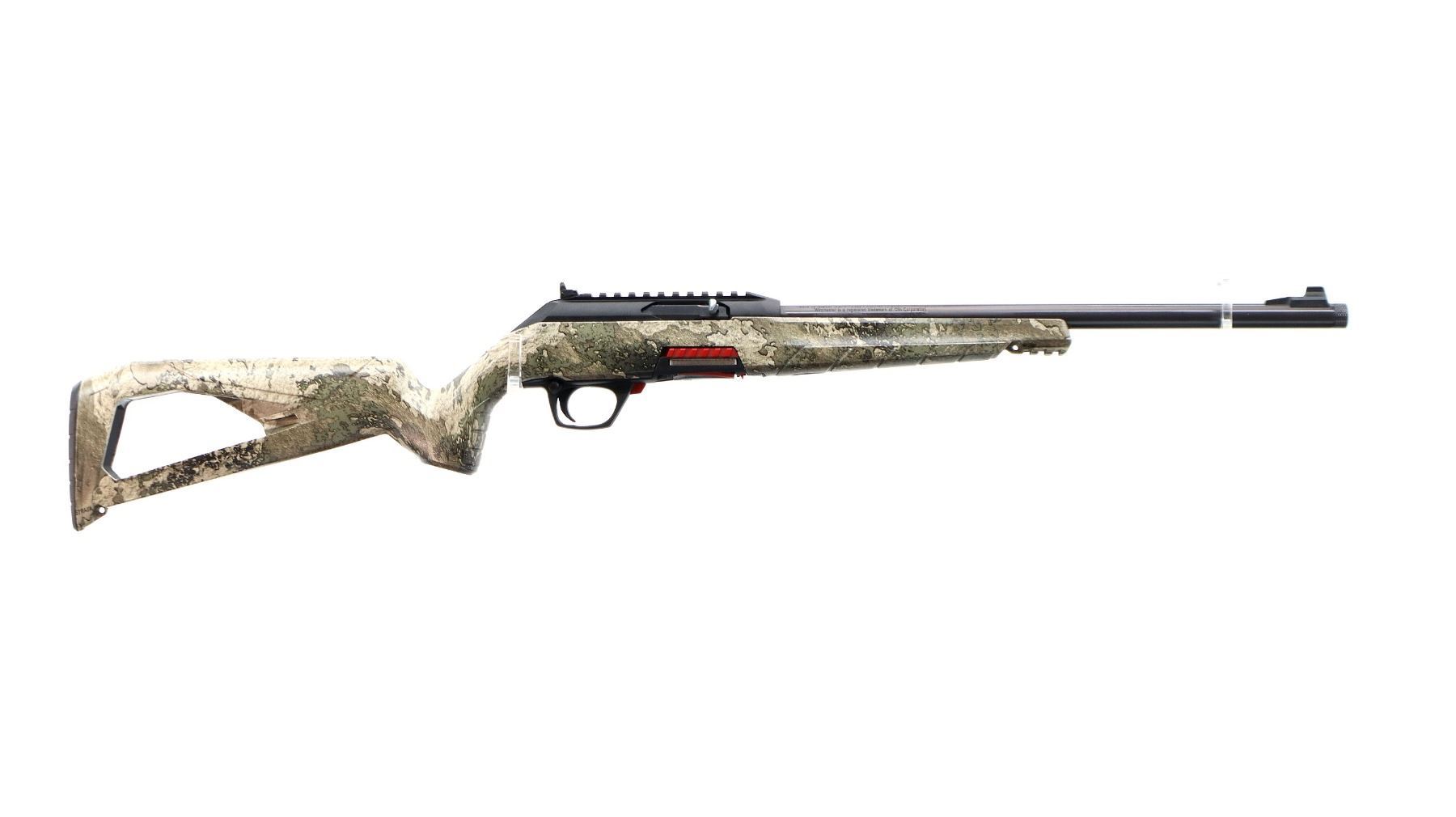 Main Description: Blade front sight with ramp, adjustable rear peep sight, matte blued barrel threaded at muzzle with cap, black alloy receiver with integral scope rail. One piece Strata camo synthetic stock, grooved forearm, pistol grip and black polymer butt plate, 13.75" LOP, hollow butt stock, grip cap, swivel studs, short rail at forearm tip.
