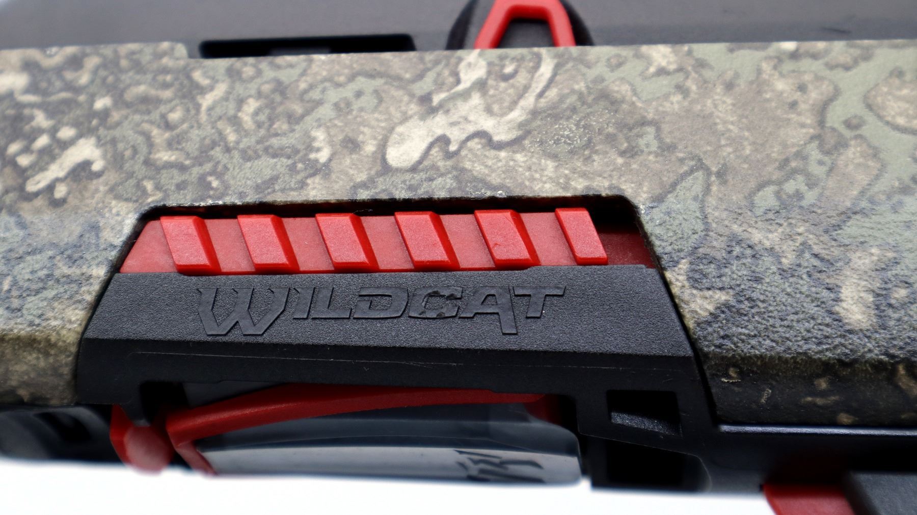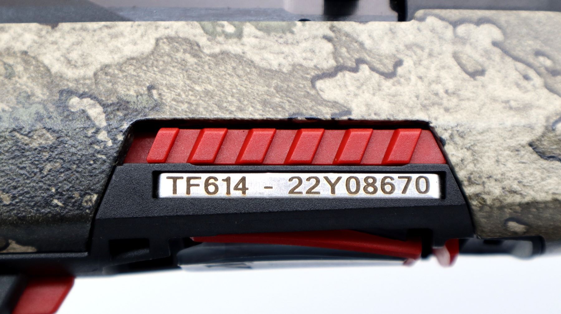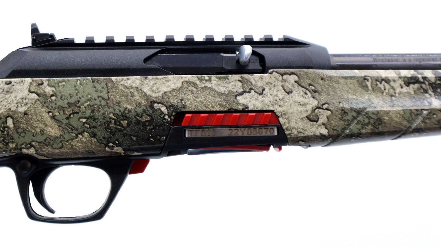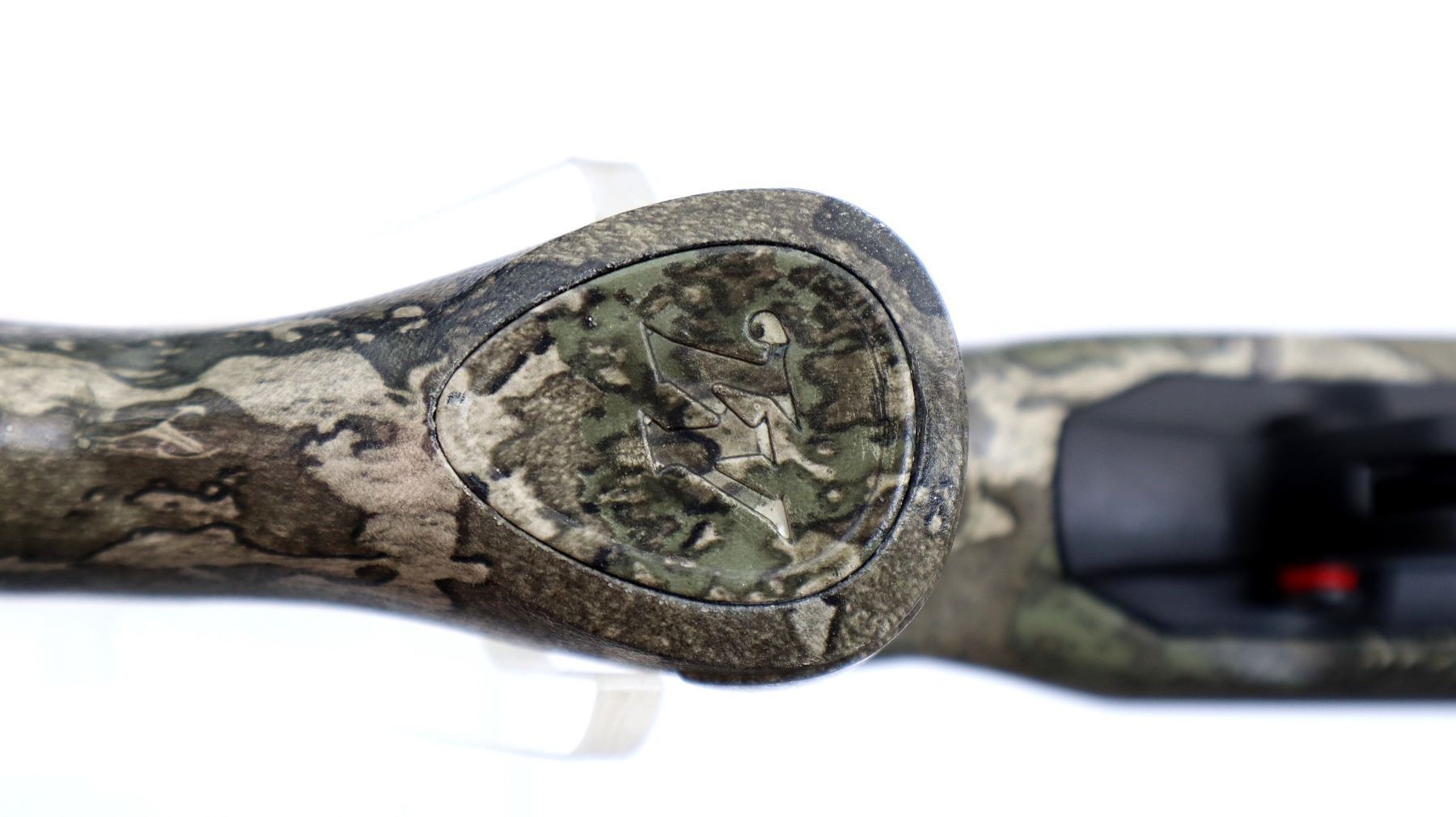 Main Description: Blade front sight with ramp, adjustable rear peep sight, matte blued barrel threaded at muzzle with cap, black alloy receiver with integral scope rail. One piece Strata camo synthetic stock, grooved forearm, pistol grip and black polymer butt plate, 13.75" LOP, hollow butt stock, grip cap, swivel studs, short rail at forearm tip.