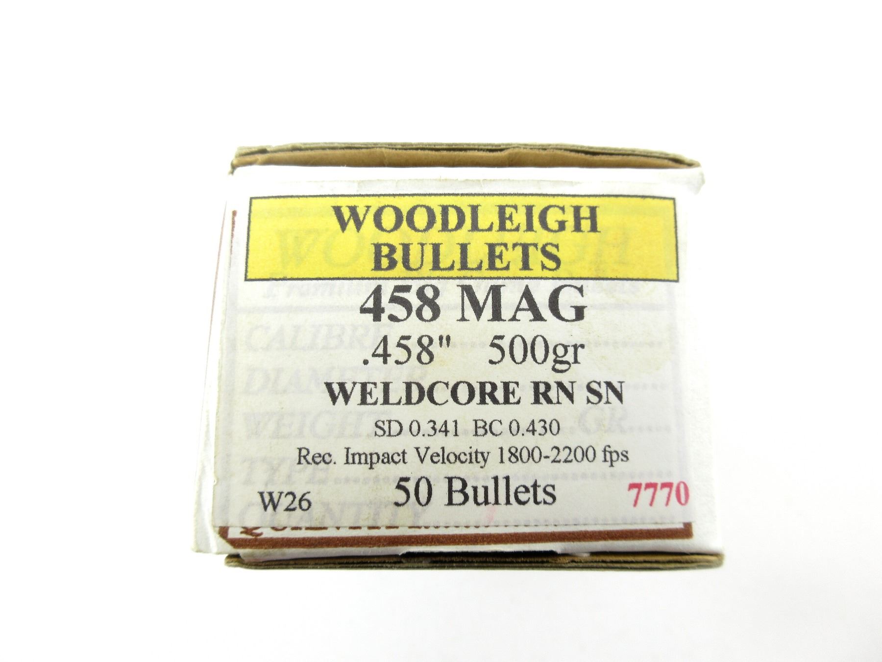 LOT INCLUDES; APPROX. (50) BULLETS, APPROX. DIA .458", 500 GRNS (STATED ON BOX NOT CONFIRMED), WELDCORE RN SN.