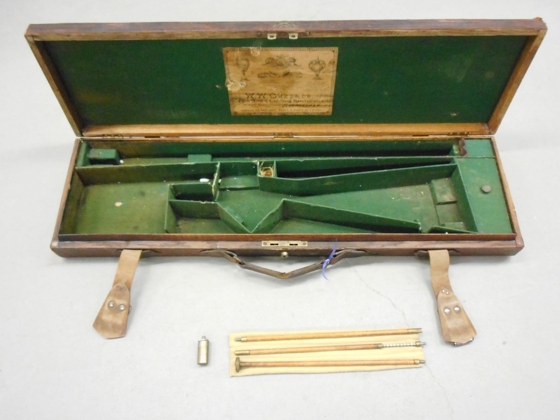 WW GREENER HARD RIFLE CASE , FITS DOUBLE RIFLES, WOOD WITH LEATHER COVERING, LABELLED INSIDE, WITH LOCATIONS AND PRIZE DETAILS, RIFLE RODS (3 PIECE), OILER. APPROX. DIMENSIONS 32" X 9".