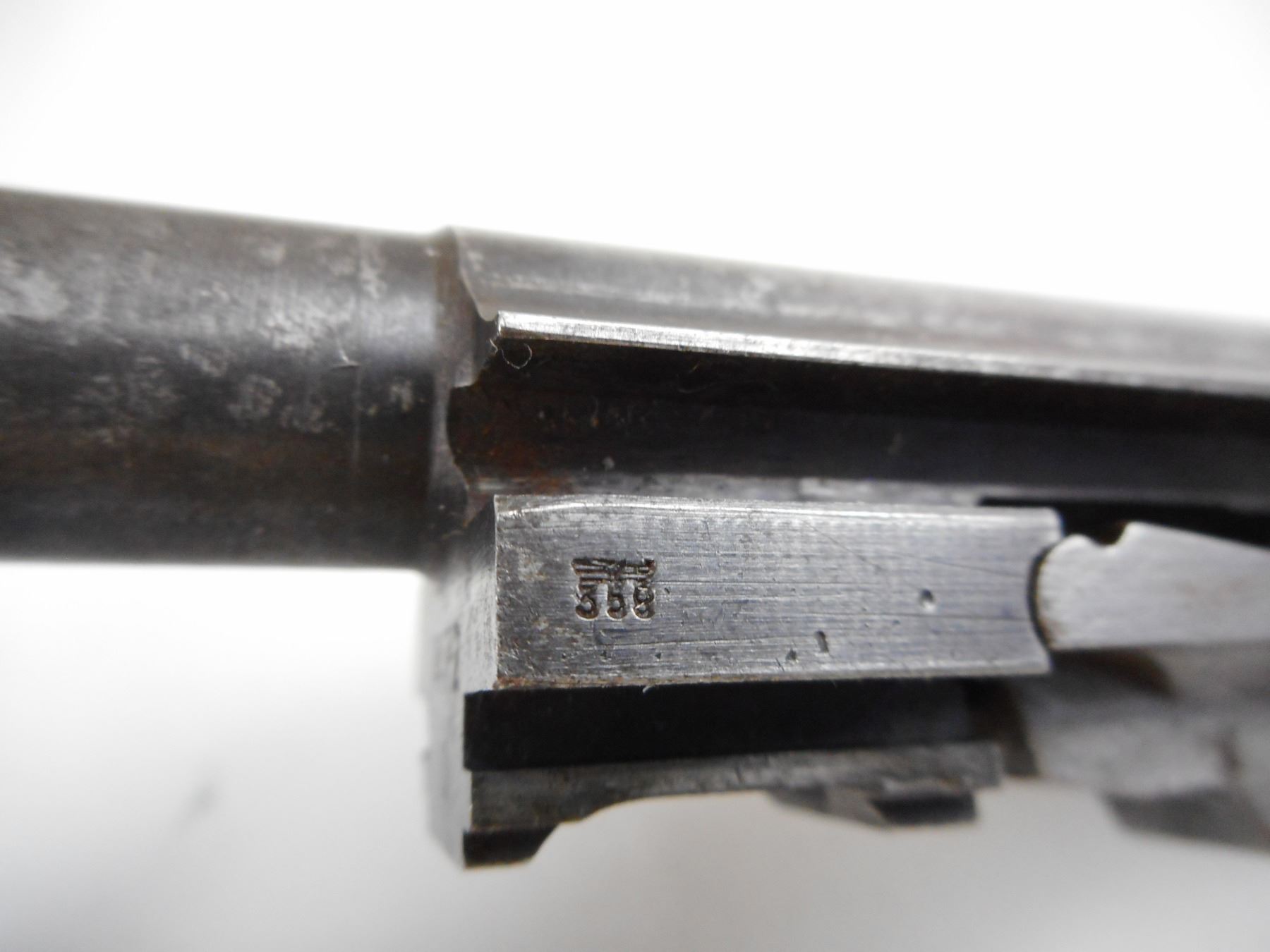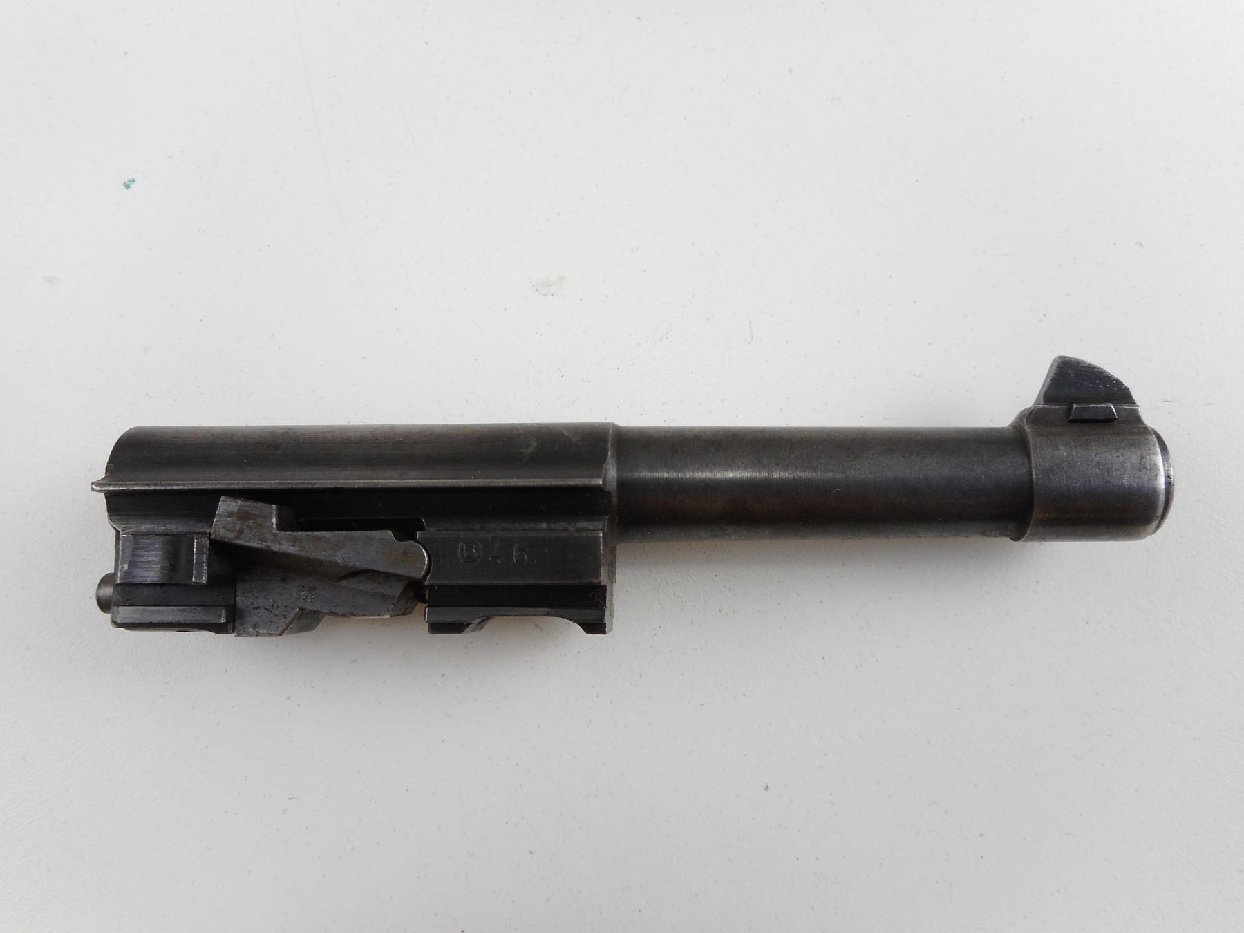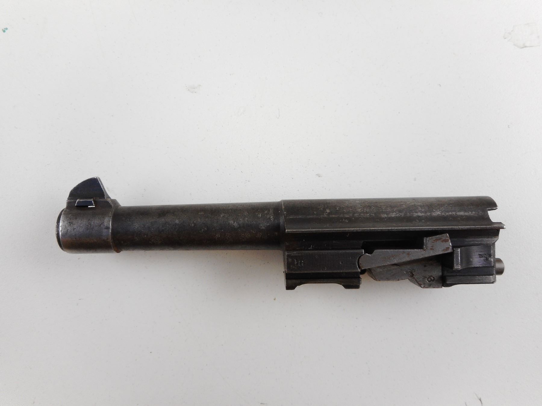 WW II GERMAN WALTHER P38 BARREL , BARREL ASSEMBLY, #'D 7472 D, 9MM, APPROX. BARREL LENGTH 5", FAIR BORE, WORN, HAS LOCKING BLOCK + PLUNGER, FRONT SIGHT, WAA 359 MARKED, MAY REQUIRE FITTING.