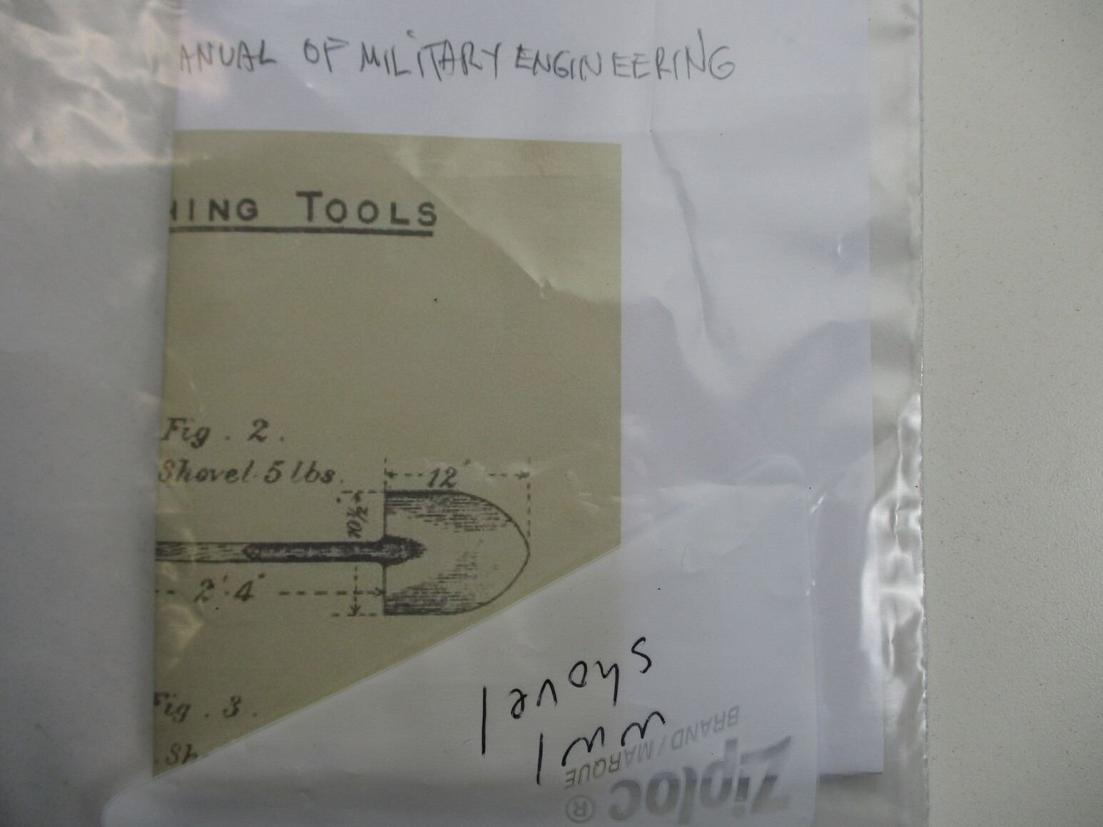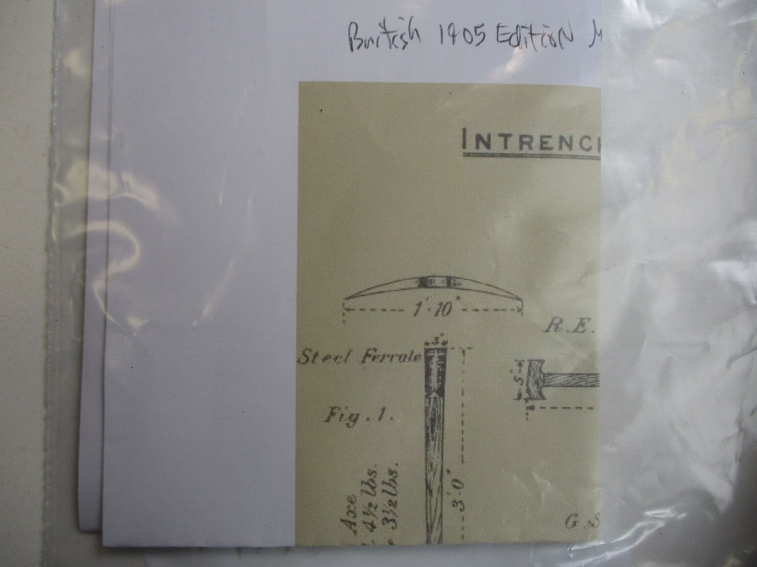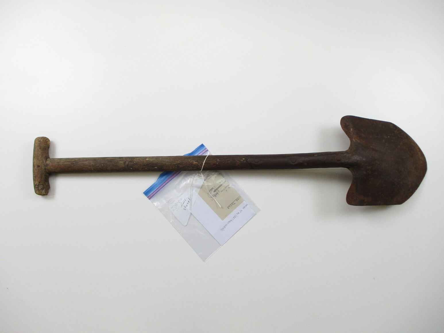 WWI BRITISH MILITARY SHOVEL , (1) METAL SHOVEL HEAD WITH WOODEN T-HANDLE, SHOVEL HEAD MARKED: "1918" & "J.YATES & CO., BIRMINGHAM" WITH OTHER WORN MARKINGS, WOODEN HANDLE HAS CRACK IN IT, CONSIGNOR HAS PROVIDED COPY OF ENGINEERING DRAWINGS, APPROX. 37" H X 8" W. SEE PHOTOS.