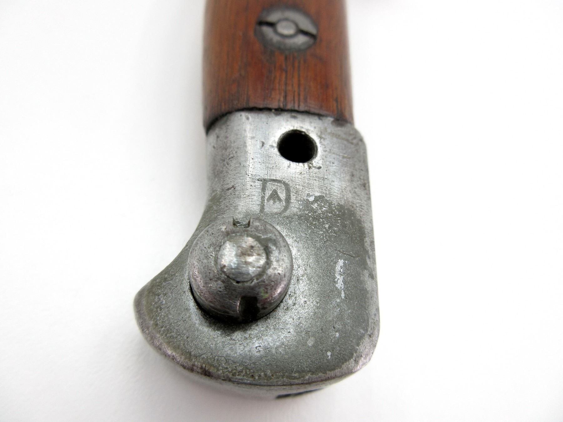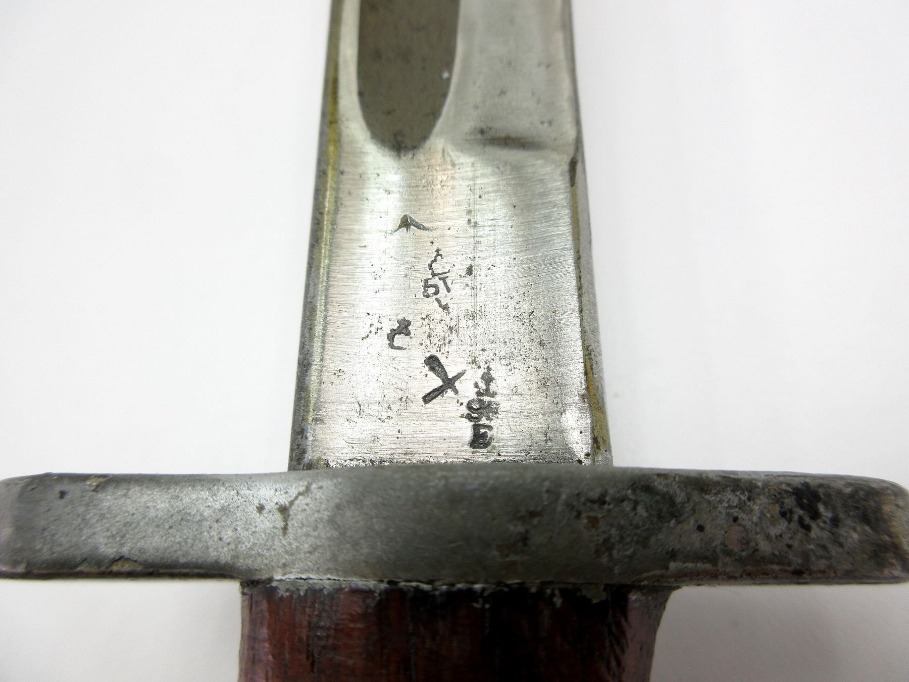(1) FITS .303 CALIBER SHORT MAGAZINE LEE-ENFIELD NO.1 MKIII (SMLE) RIFLE, RICASSO MARKED: PARTIAL CROWN OVER "11 8" OVER "?ILKIN", OTHER-SIDE MARKED: "X (BEND TEST)", BROAD ARROW & VARIOUS PROOF MARKS, NO QUILLON, 2-PIECE WOOD GRIP, METAL POMMEL, MARKED: "D" WITH BROAD ARROW, METAL & LEATHER SCABBARD, ETCHED / HAND-WRITTEN: "1942, WK", BLADE APPROX. 17" & OAL APPROX. 21.75". SEE PHOTOS.