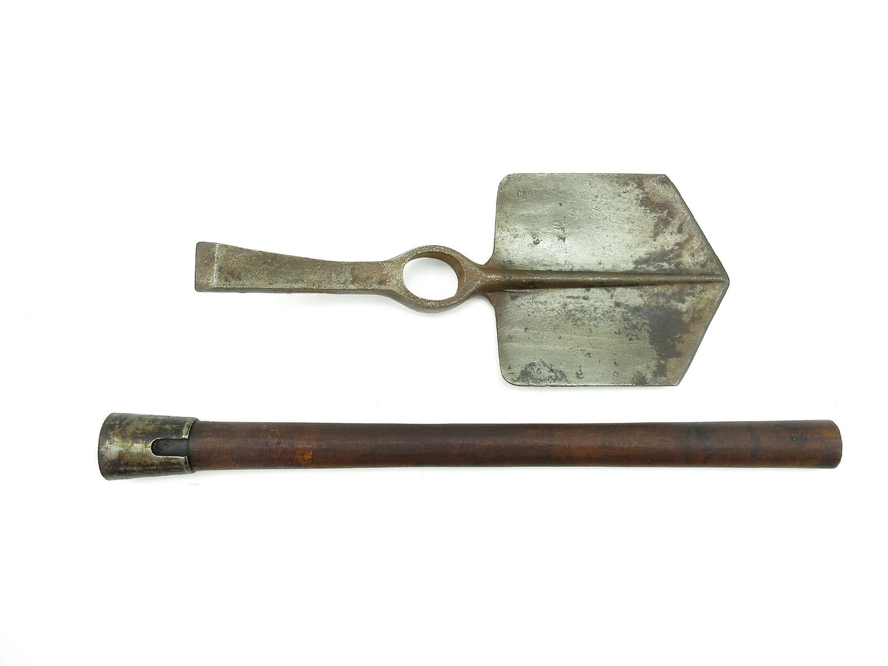 LOT INCLUDES; (1) STEEL TOOL HEAD, SPADE ON ONE SIDE / PICK ON THE OTHER, MARKED: "CHILLINGTON, 1918", "69", "I" & BROAD ARROW "5", APPROX. 5" W, OAL APPROX. 12.25" & (1) WOOD HELVE WITH STEEL, HANDLE MARKED WITH C-BROAD ARROW, "1" & "0", OAL APPROX. 16 5/8". SEE PHOTOS.