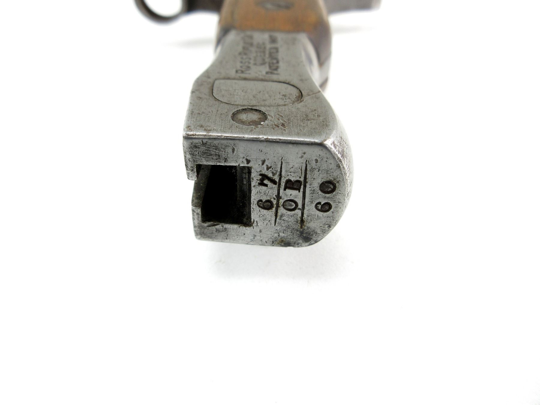 (1) FITS 1905 MKI RIFLES, BUTTER KNIFE BLADE, 2-PIECE WOOD GRIP, GRIP MARKED: "A42", CROWN OVER "5", OTHER-SIDE MARKED: "F970", CROWN OVER "5" & VARIOUS OTHER MARKINGS CROSSED / SCRATCHED OUT, SPINE IN-BETWEEN GRIPS MARKED: CROWN OVER "7" (TWICE), METAL POMMEL MARKED: "08" OVER "5-09", BROAD ARROW, CROWN OVER "8", OTHER-SIDE MARKED: "ROSS RIFLE CO., QUEBEC, PATENTED 1907", END OF POMMEL MARKED: "67" OVER "OB" OVER "60", ORIGINAL ROSS RIFLE LEATHER & METAL SCABBARD, LEATHER MARKED: C-BROAD ARROW OVER "R.R.C." OVER "1909", METAL THROAT MARKED: CROWN OVER "2" & "129", LEATHER FROG MARKED: "992" CROSSED-OUT, BLADE APPROX. 10 1/8" & OAL APPROX. 14 5/8". SEE PHOTOS.
