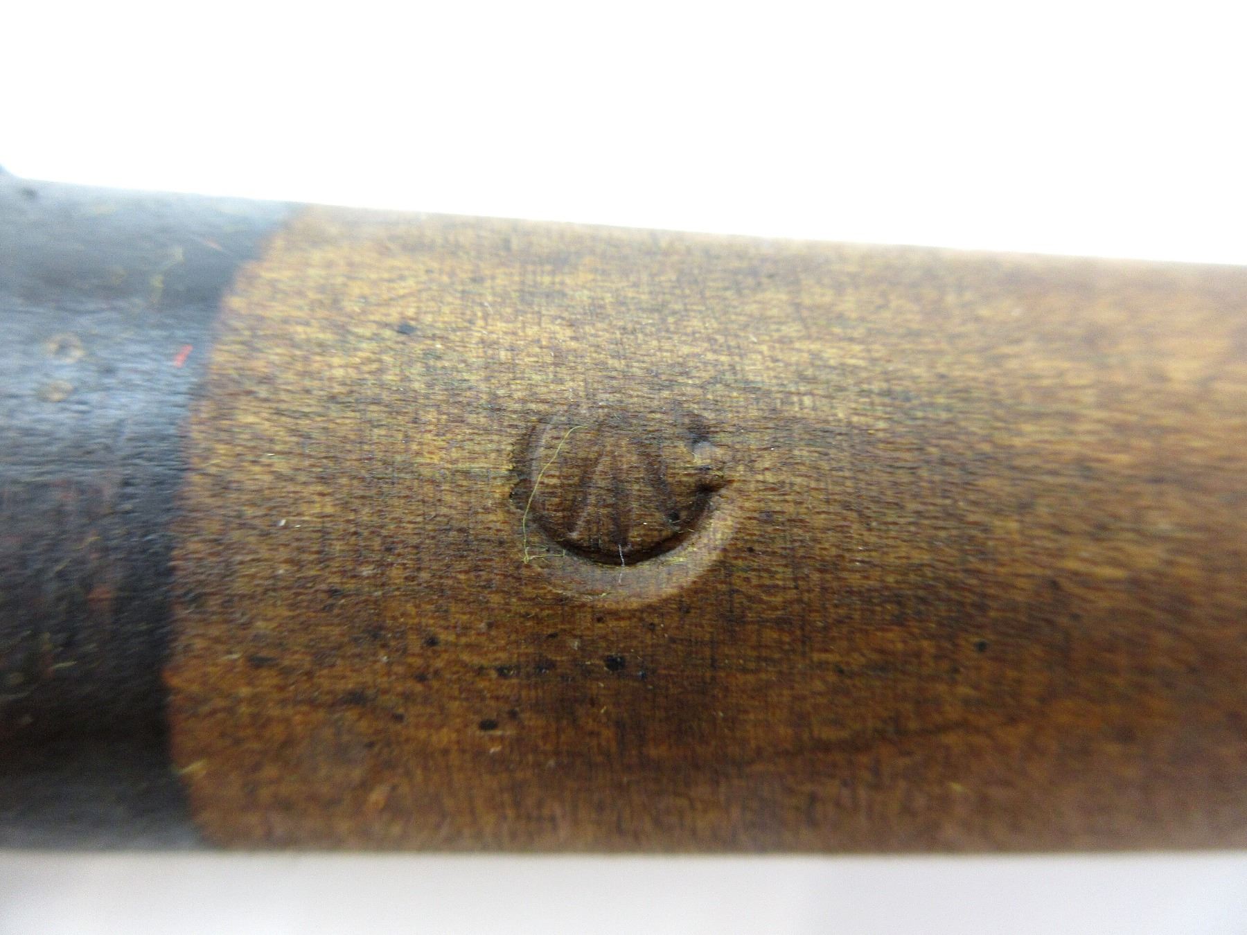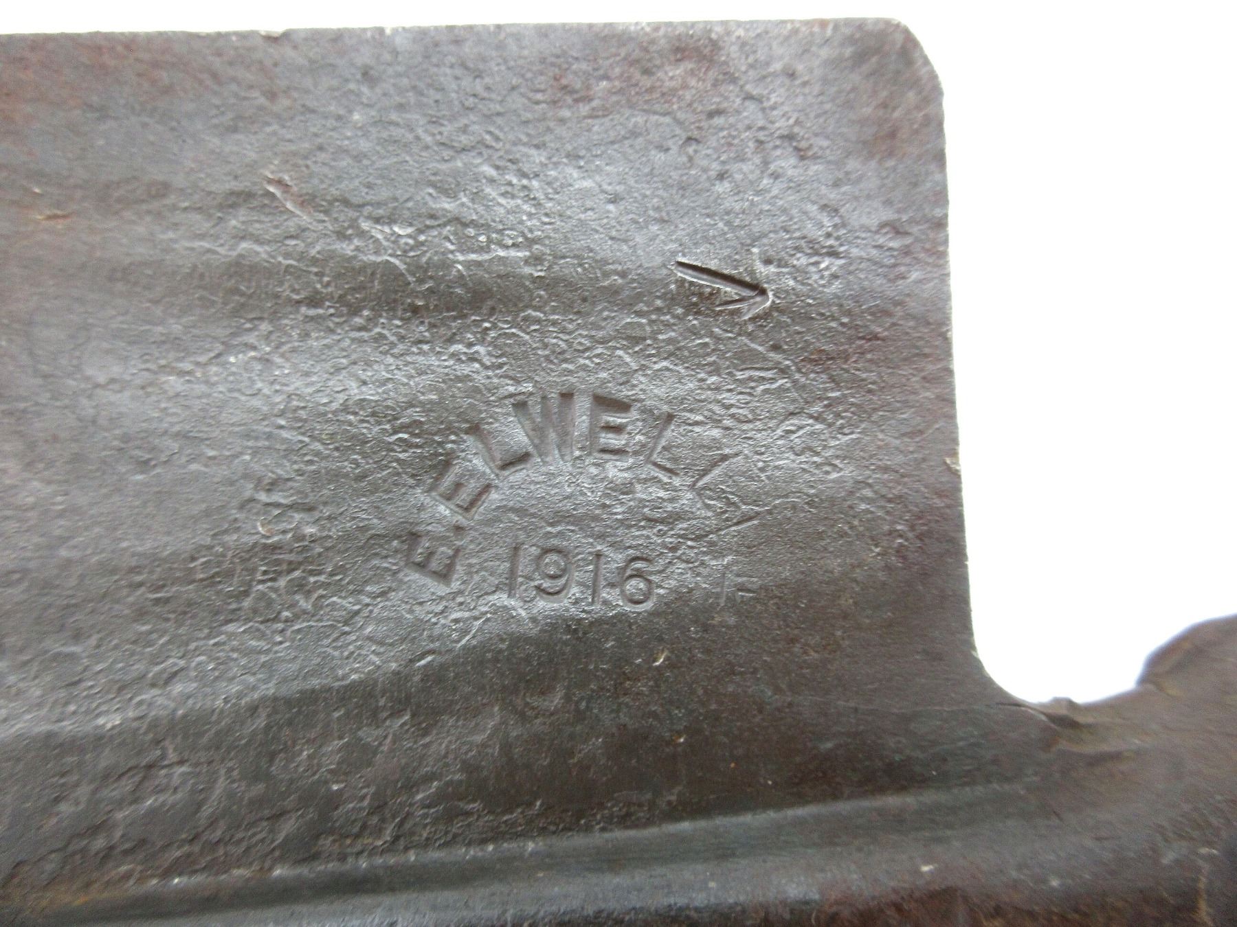 LOT INCLUDES; (1) STEEL TOOL HEAD, SPADE ON ONE SIDE / PICK ON THE OTHER, MARKED: "E.ELWELL, 1916", C-BROAD ARROW & PARTIAL BROAD ARROW, APPROX. 5 1/8" W, OAL APPROX. 12 1/8" & (1) WOOD HELVE WITH STEEL, HANDLE MARKED WITH C-BROAD ARROW, OAL APPROX. 16 5/8". SEE PHOTOS.
