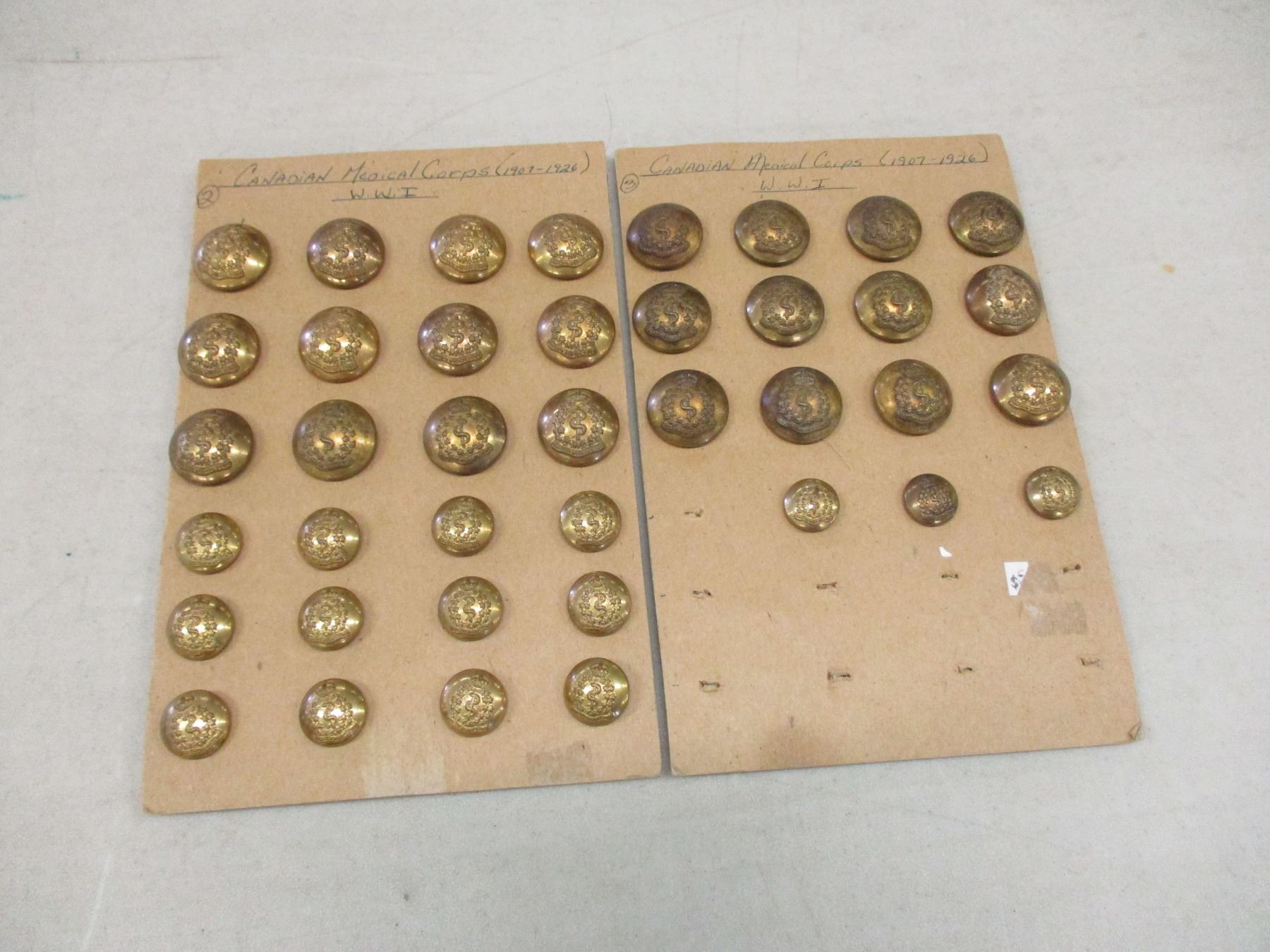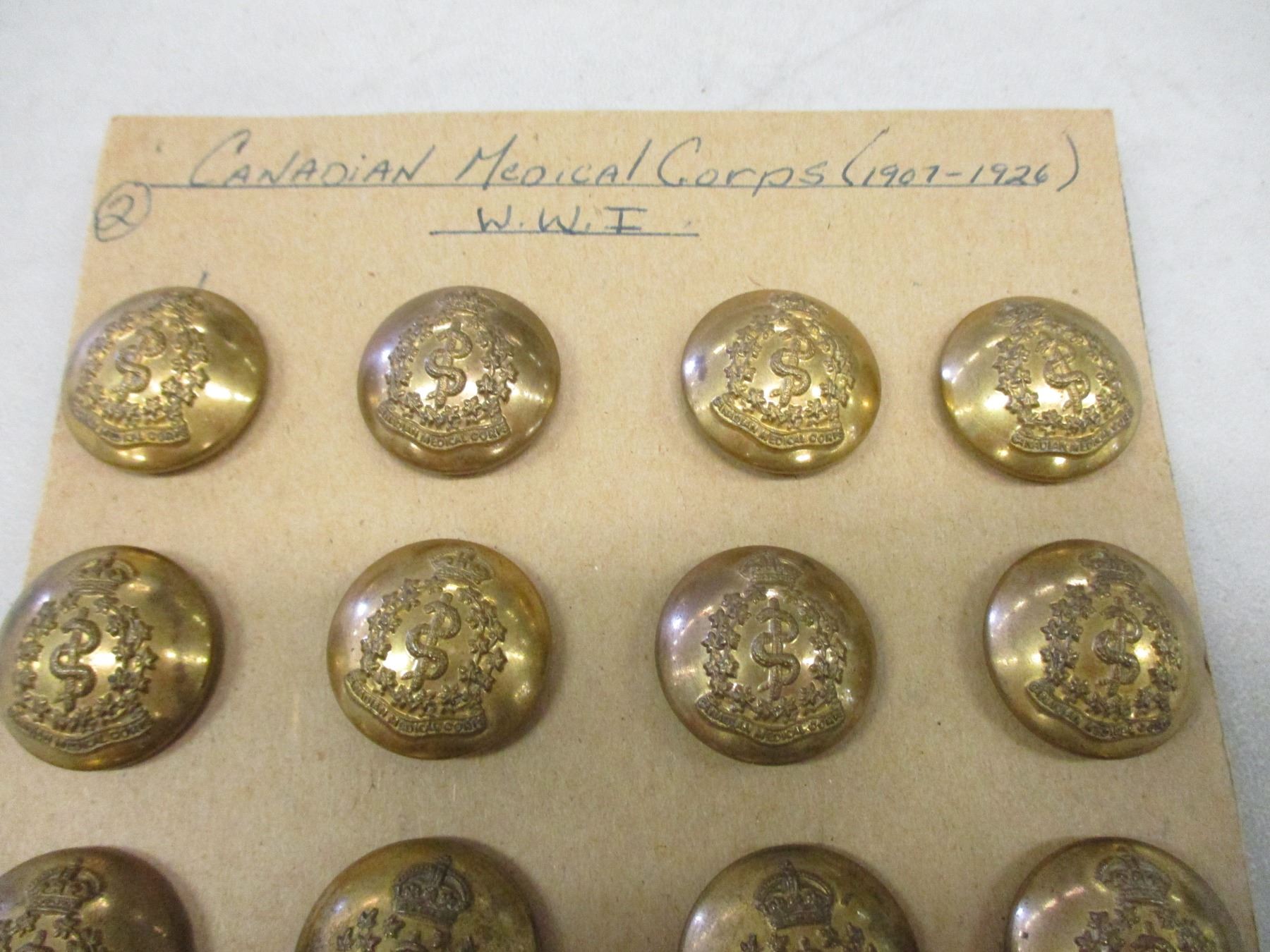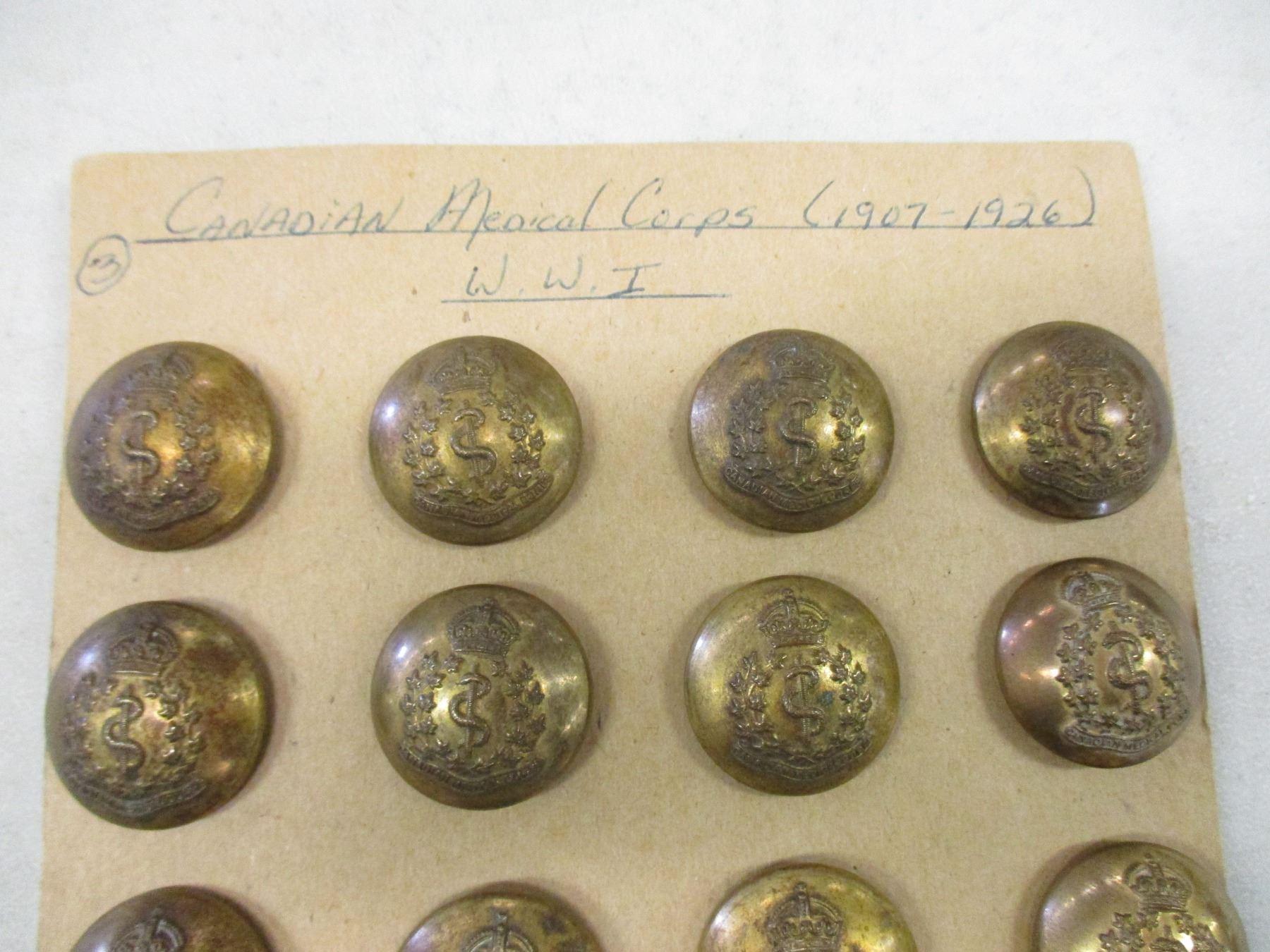 WWI CANADIAN MEDICAL CORPS BUTTONS , 1907-1926. LARGE AND SMALL, FASTENED TO CARDBOARD. LOT OF 39