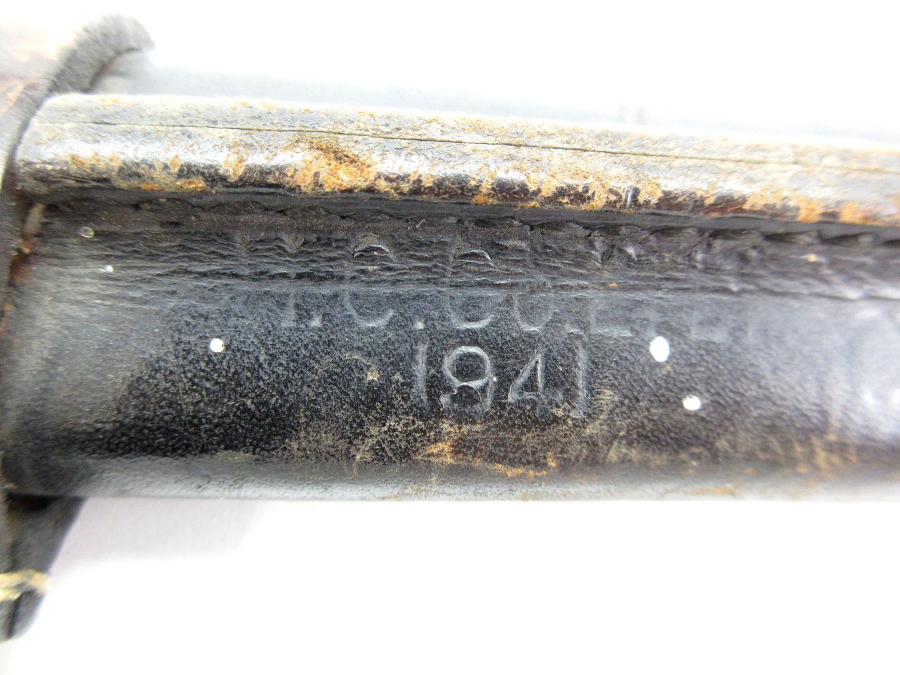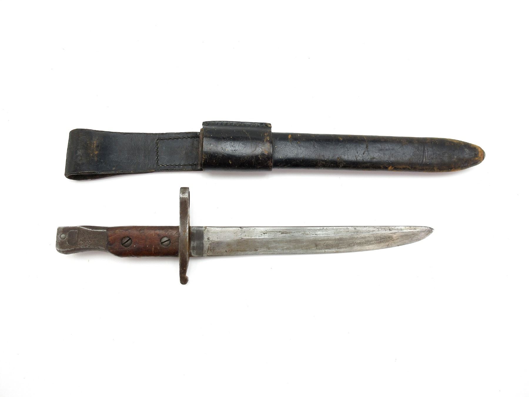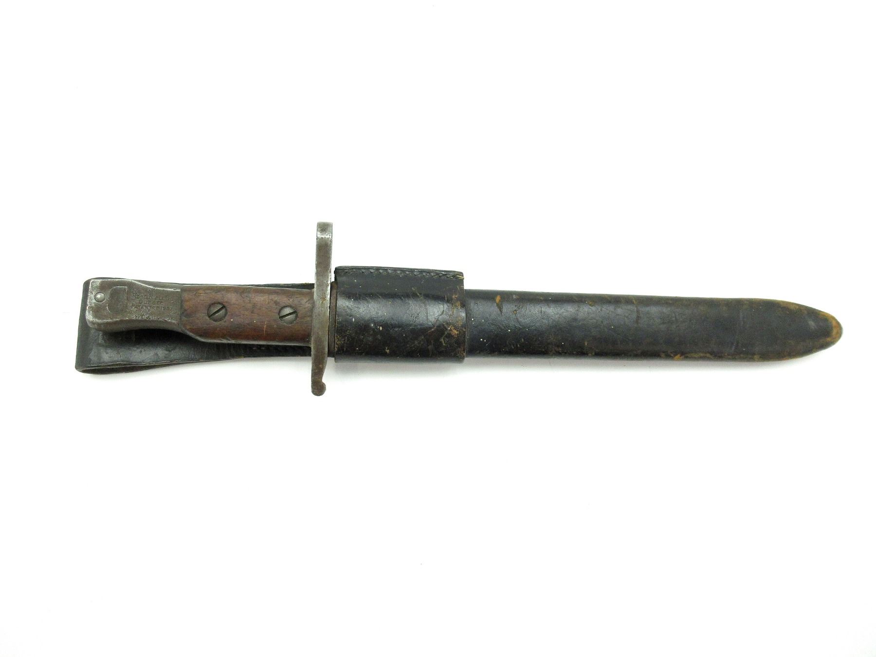 (1) FITS 1910 MKIII RIFLES, WWI MODIFIED BLADE TIP, 2-PIECE WOOD GRIP MARKED: CROWN OVER "4" ON EITHER-SIDE, SPINE IN-BETWEEN GRIPS MARKED: CROWN OVER "4" (TWICE), METAL POMMEL MARKED: "11", "2/12", CROWN OVER "4", EARLY C-BROAD ARROW, OTHER-SIDE MARKED: "ROSS RIFLE CO., QUEBEC, PATENTED 1907", BOTTOM OF POMMEL MARKED: "2 . 15" OVER "6 3" OVER "80" (ALL CROSSED OUT), METAL & LEATHER SCABBARD, MARKED: "H.C. CO. LTD, 1941", "MK II" & C-BROAD ARROW, LEATHER FROG, NO VISIBLE MARKINGS, BLADE APPROX. 9.75" & OAL APPROX. 14.25". SEE PHOTOS.