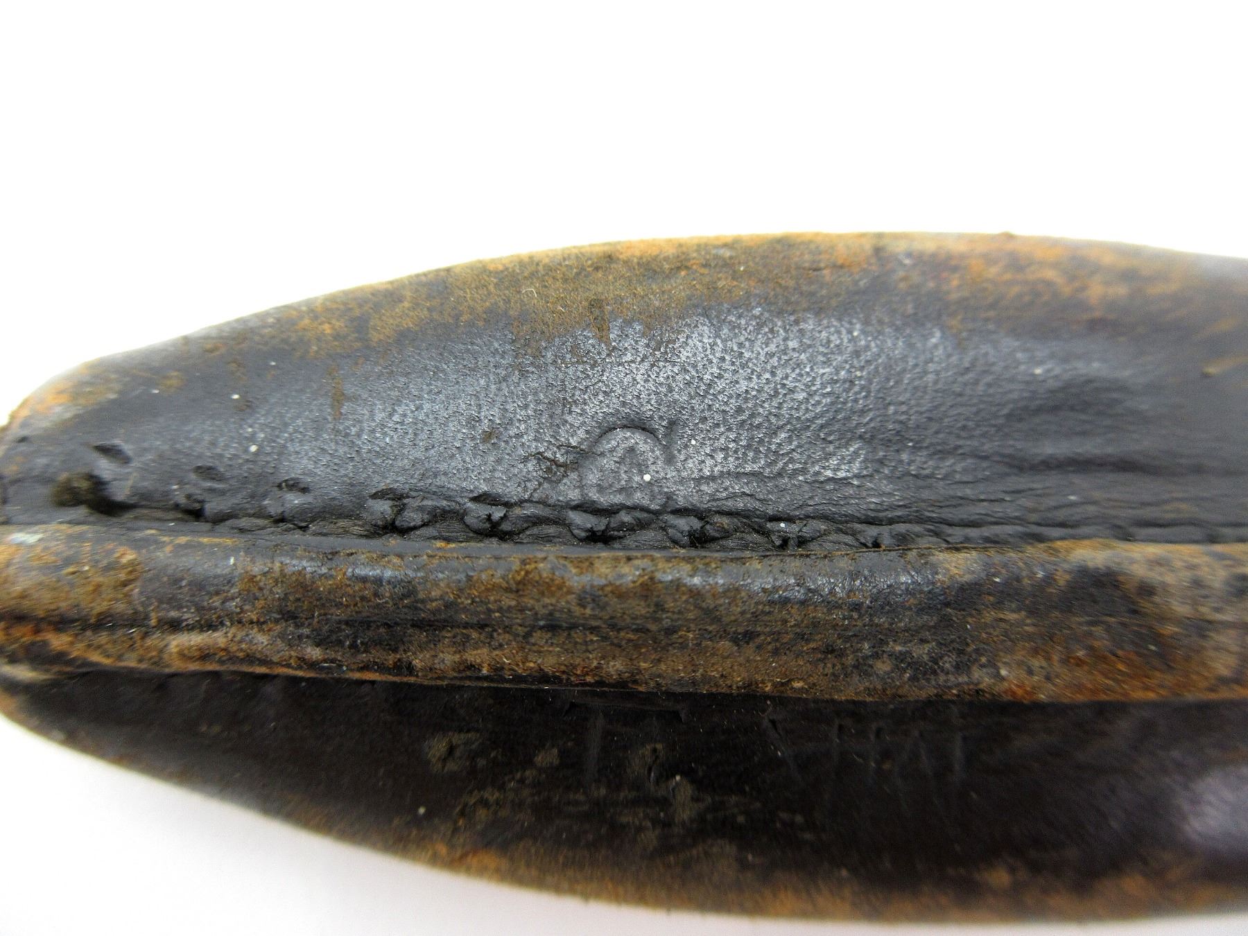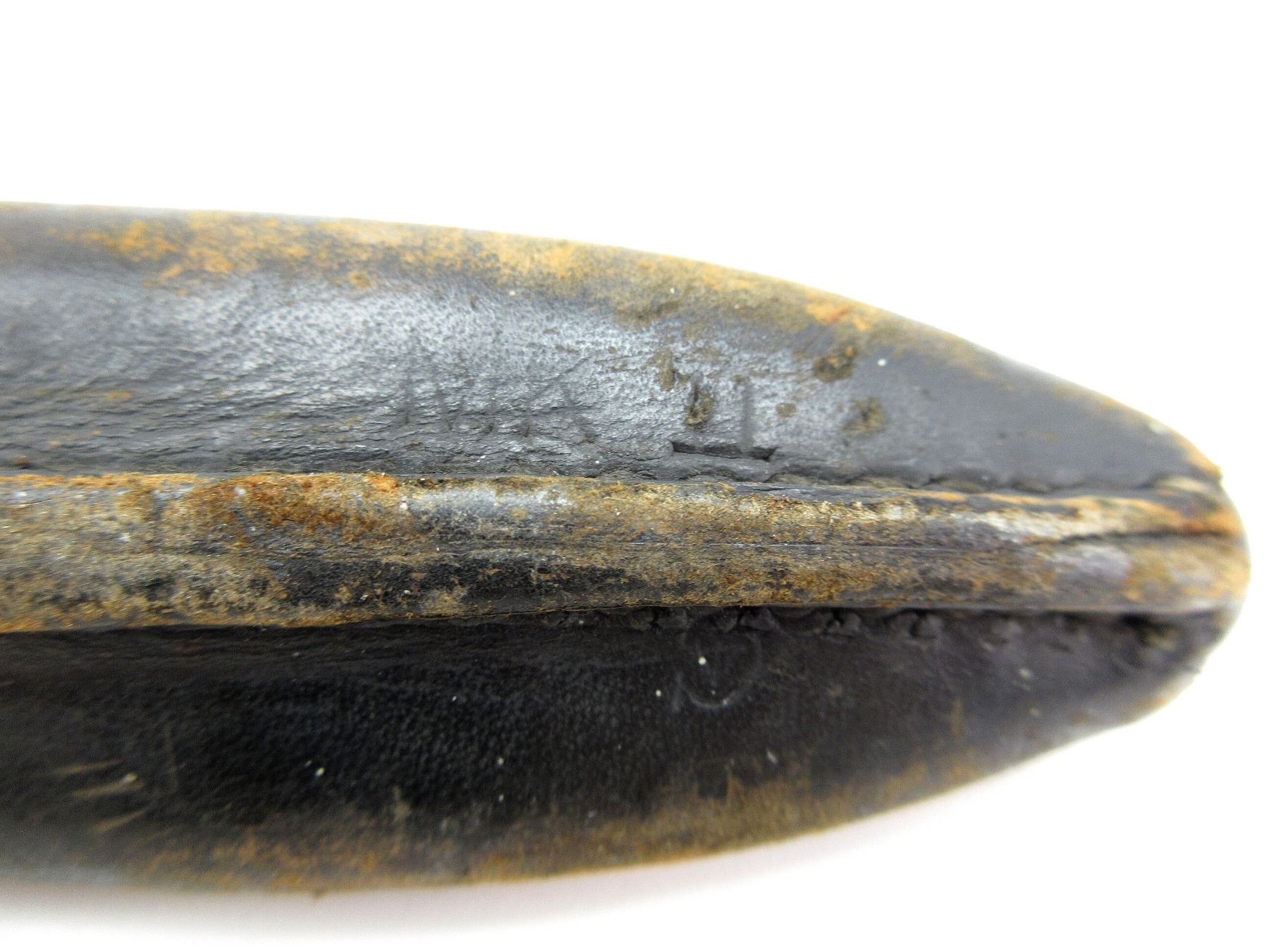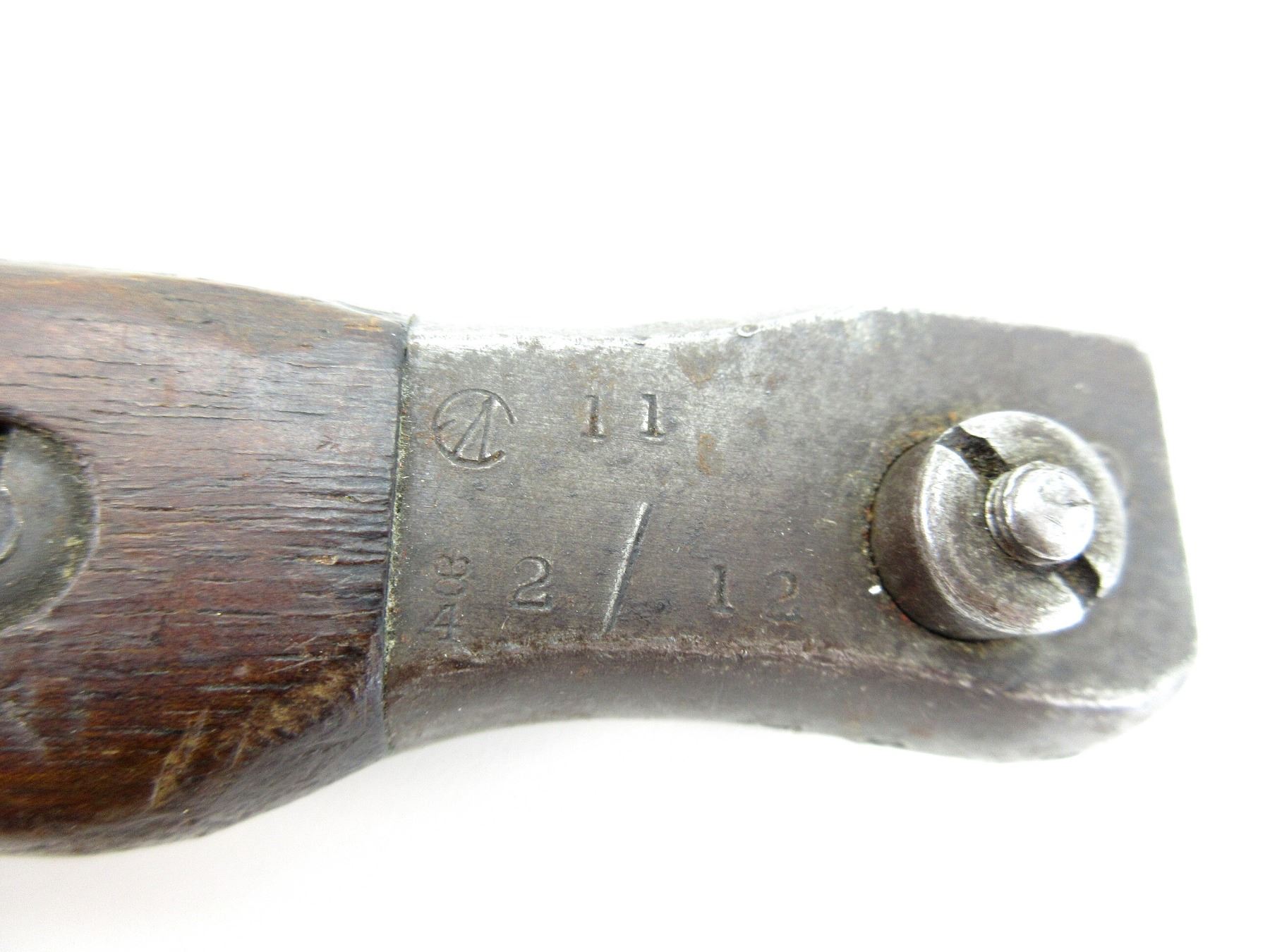 (1) FITS 1910 MKIII RIFLES, WWI MODIFIED BLADE TIP, 2-PIECE WOOD GRIP MARKED: CROWN OVER "4" ON EITHER-SIDE, SPINE IN-BETWEEN GRIPS MARKED: CROWN OVER "4" (TWICE), METAL POMMEL MARKED: "11", "2/12", CROWN OVER "4", EARLY C-BROAD ARROW, OTHER-SIDE MARKED: "ROSS RIFLE CO., QUEBEC, PATENTED 1907", BOTTOM OF POMMEL MARKED: "2 . 15" OVER "6 3" OVER "80" (ALL CROSSED OUT), METAL & LEATHER SCABBARD, MARKED: "H.C. CO. LTD, 1941", "MK II" & C-BROAD ARROW, LEATHER FROG, NO VISIBLE MARKINGS, BLADE APPROX. 9.75" & OAL APPROX. 14.25". SEE PHOTOS.