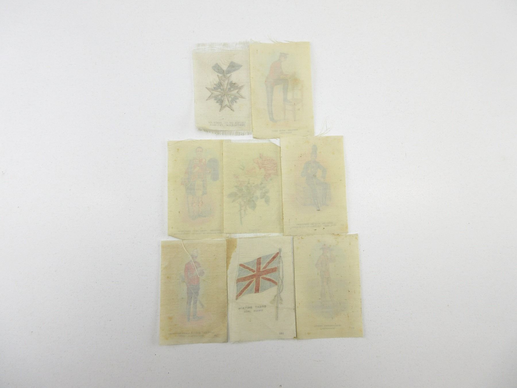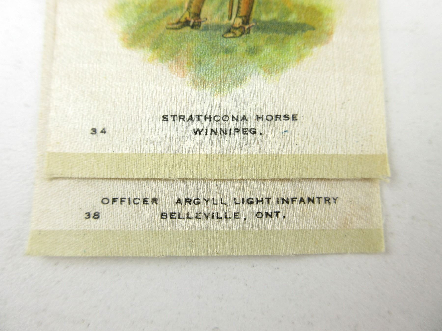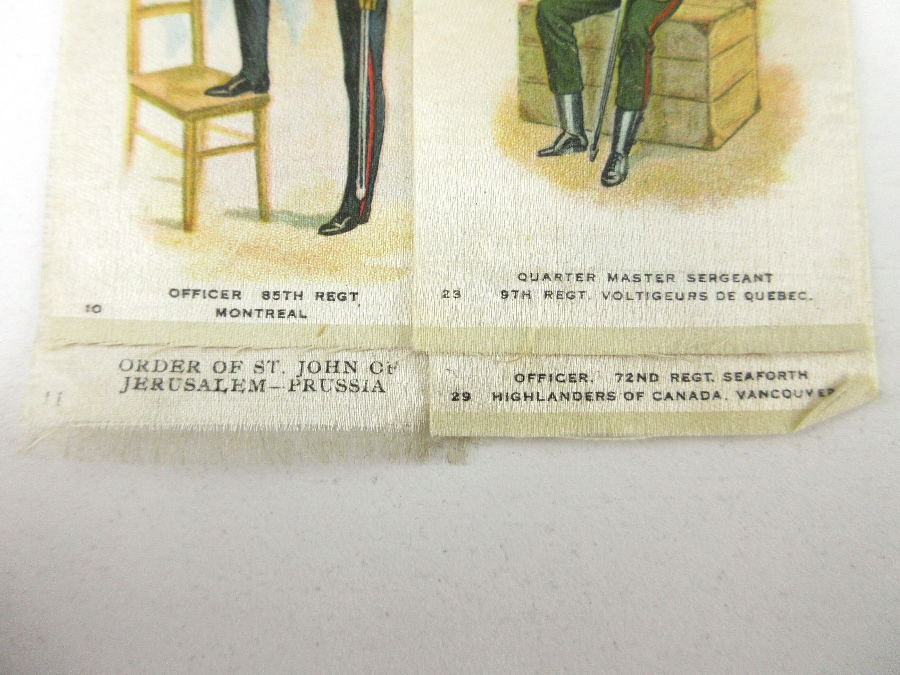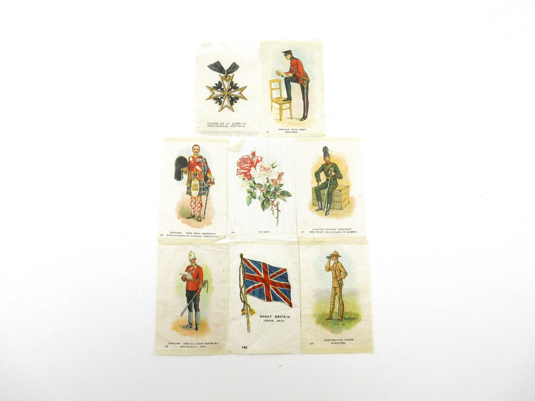 LOT INCLUDES; (8) SILK CIGARETTE CARDS, ONE MARKED: "10, OFFICER 85TH REGT., MONTREAL", ONE MARKED: "11, ORDER OF ST. JOHN OF JERUSALEM-PRUSSIA", ONE MARKED: "23, QUARTER MASTER SERGEANT, 9TH REGT. VOLTIGEURS DE QUEBEC.", ONE MARKED: "29, OFFICER 72ND REGT. SEAFORTH, HIGHLANDERS OF CANADA, VANCOUVER.", ONE MARKED: "33, ROSES", ONE MARKED: "34, STRATHCONA HORSE, WINNIPEG.", ONE MARKED: "38, OFFICER ARGYLL LIGHT INFANTRY, BELLEVILLE, ONT." & ONE MARKED: "GREAT BRITAIN, UNION JACK". SEE PHOTOS.