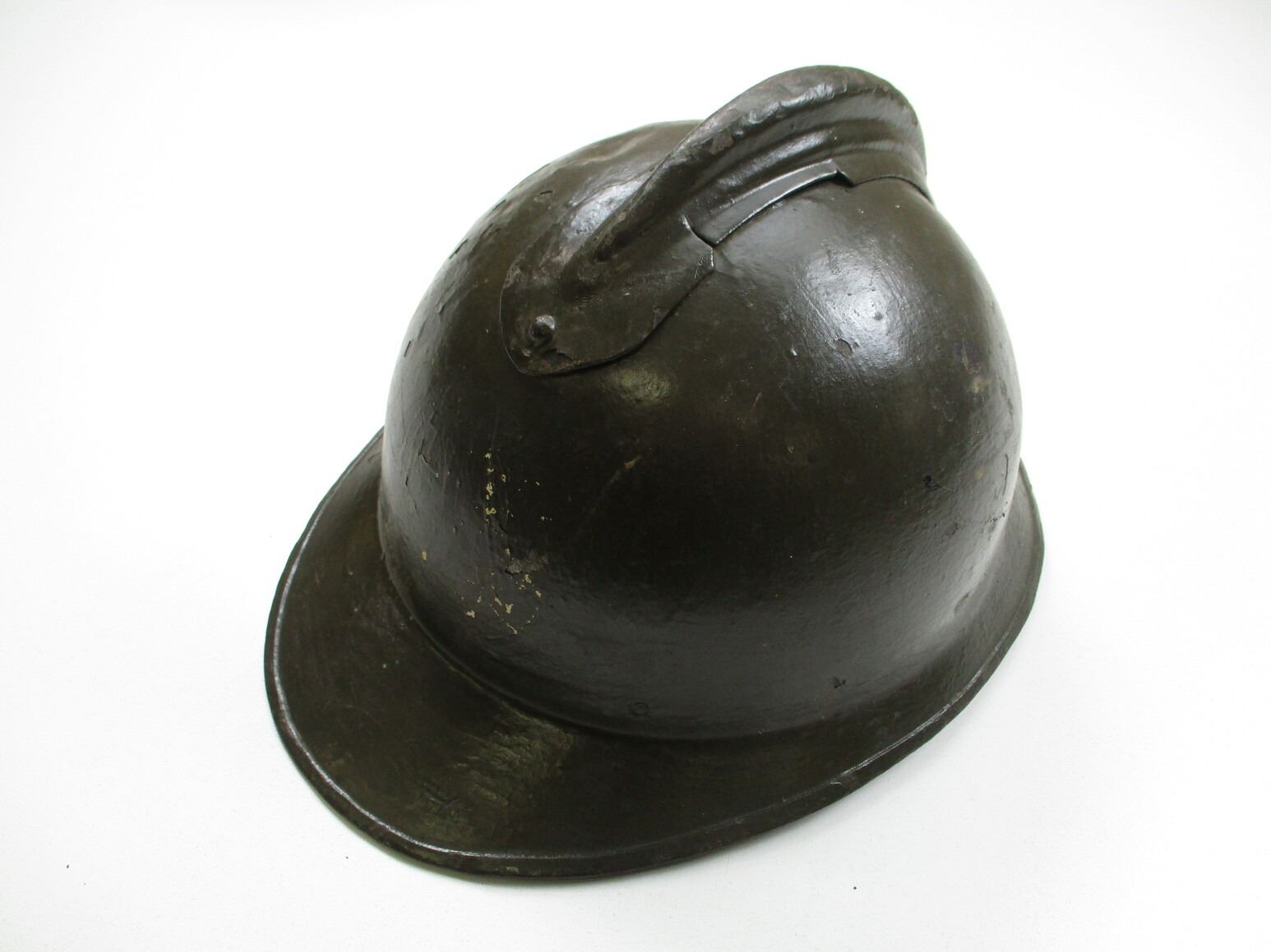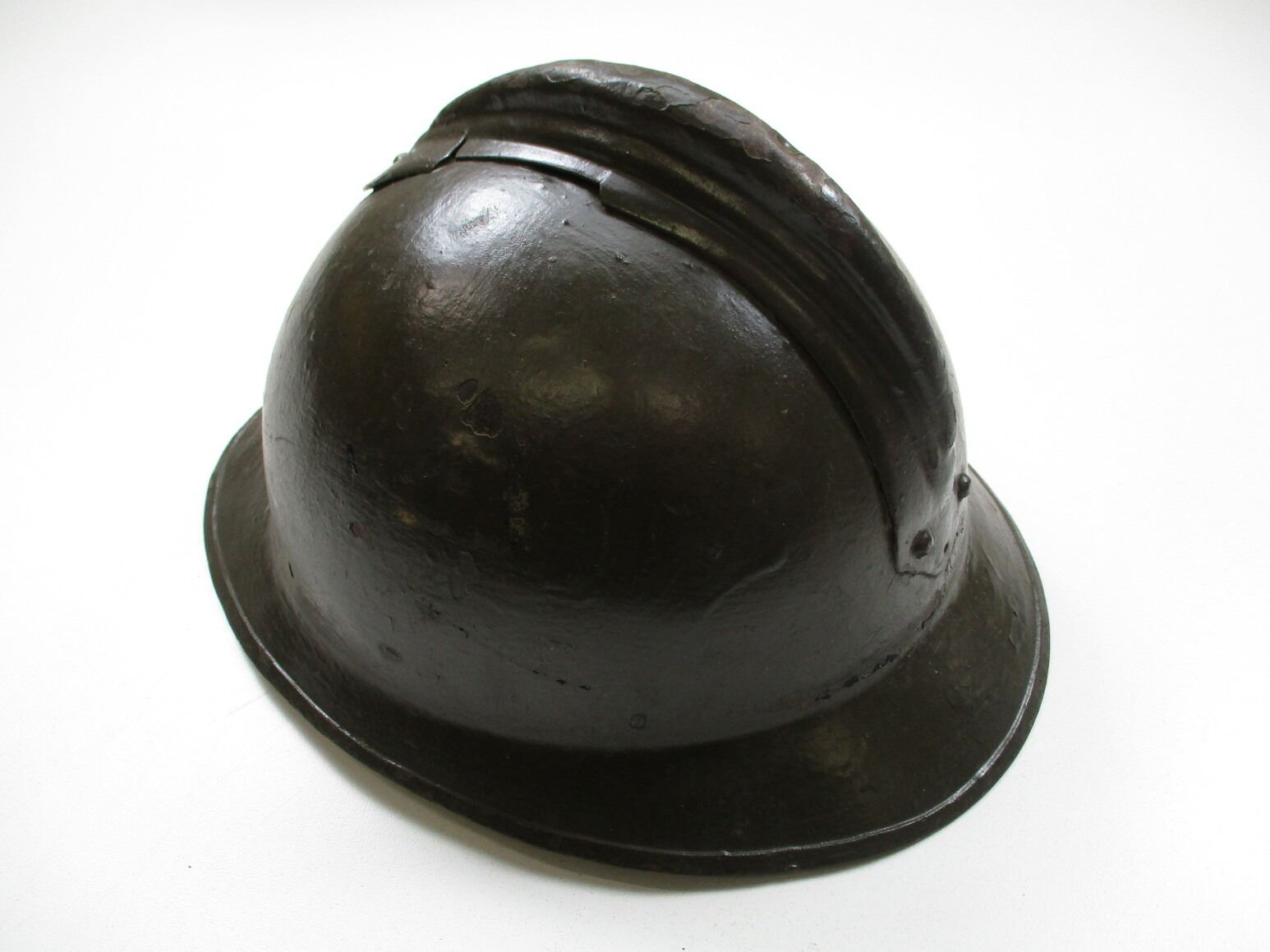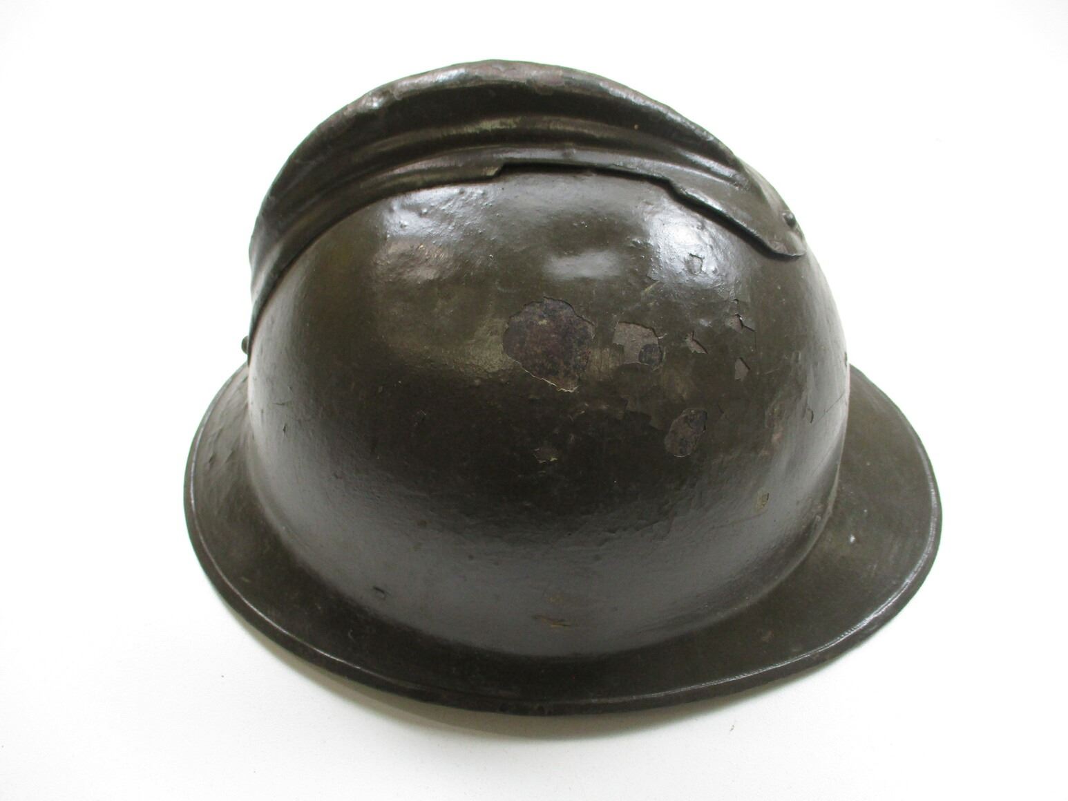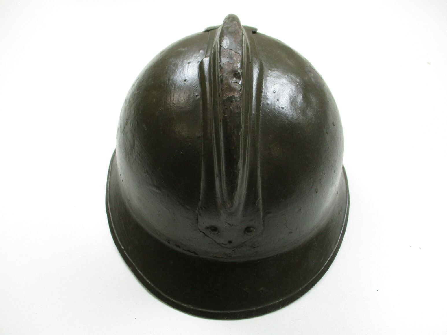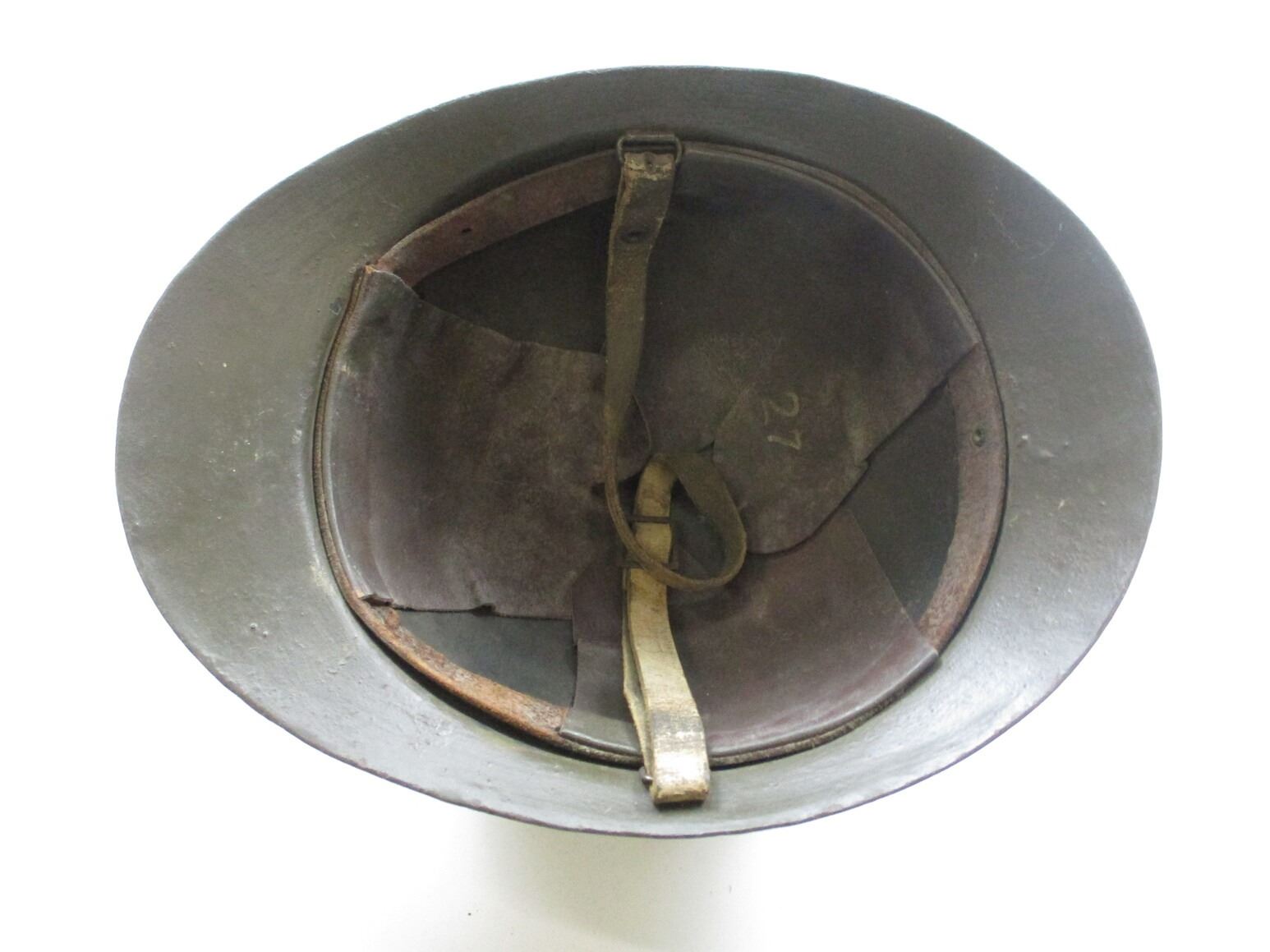 WWI FRENCH M15 TYPE MILITARY HELMET, (1) GREEN PAINTED STEEL, NO BADGE ON THE FRONT, RIVETTED CONSTRUCTION, LEATHER HEAD LINER & CHIN STRAP, LINER MARKED: "27". SEE PHOTOS.