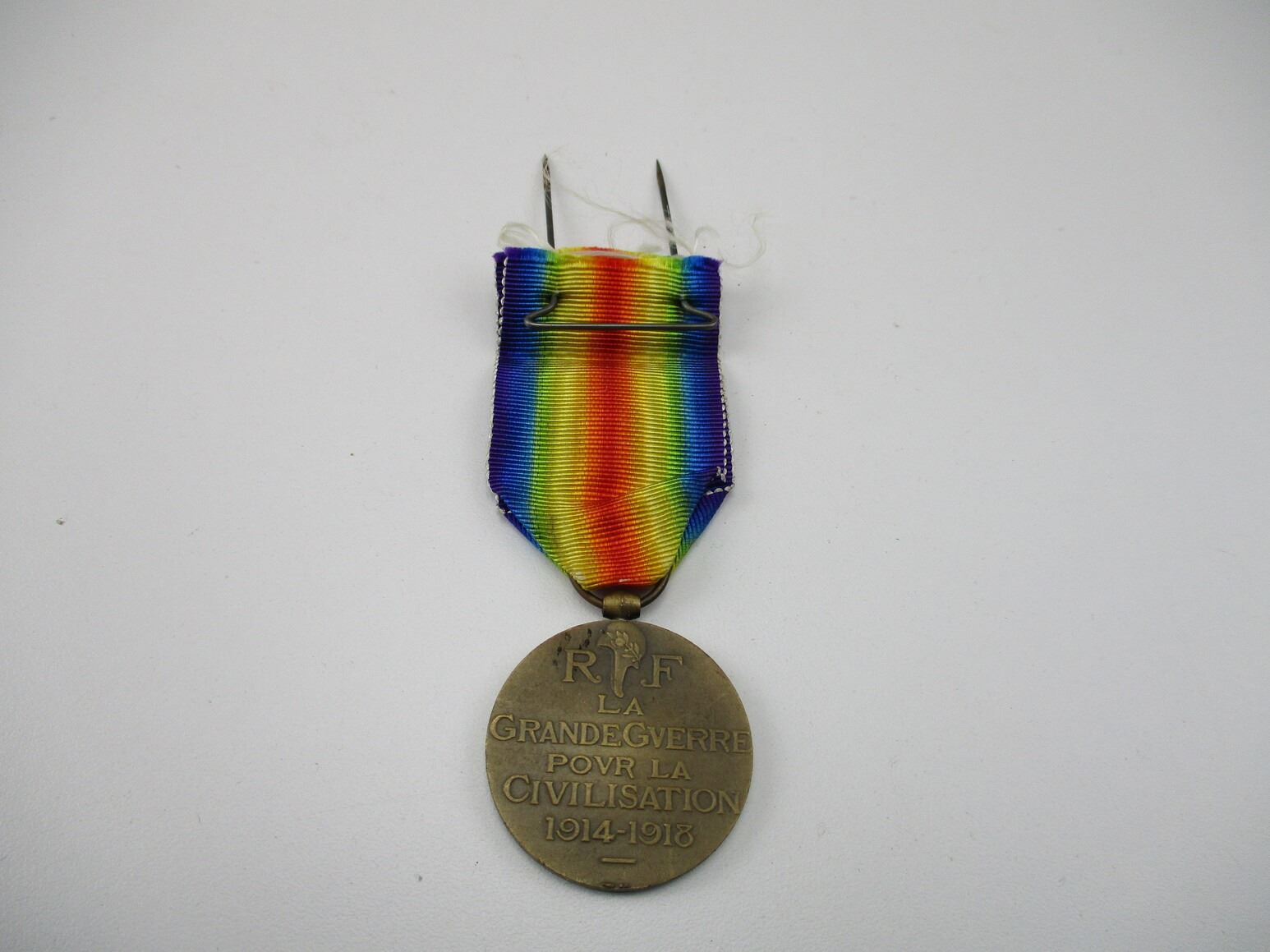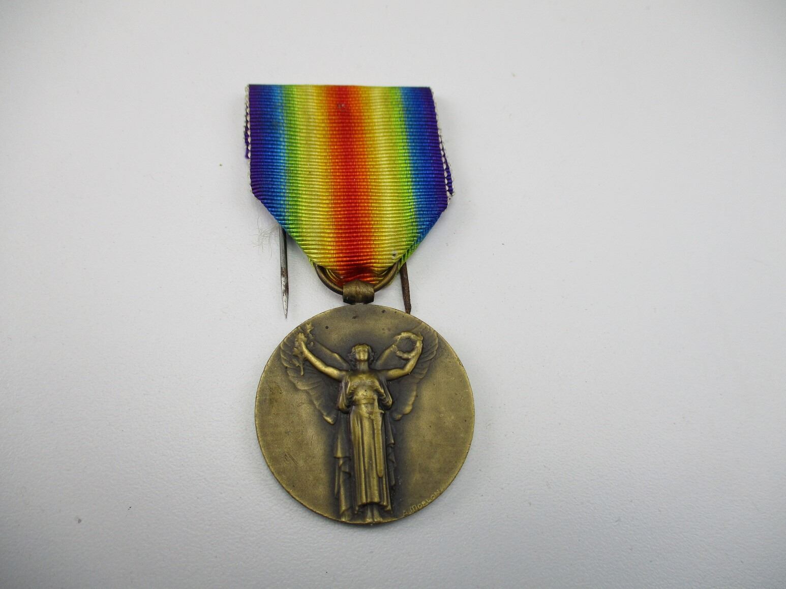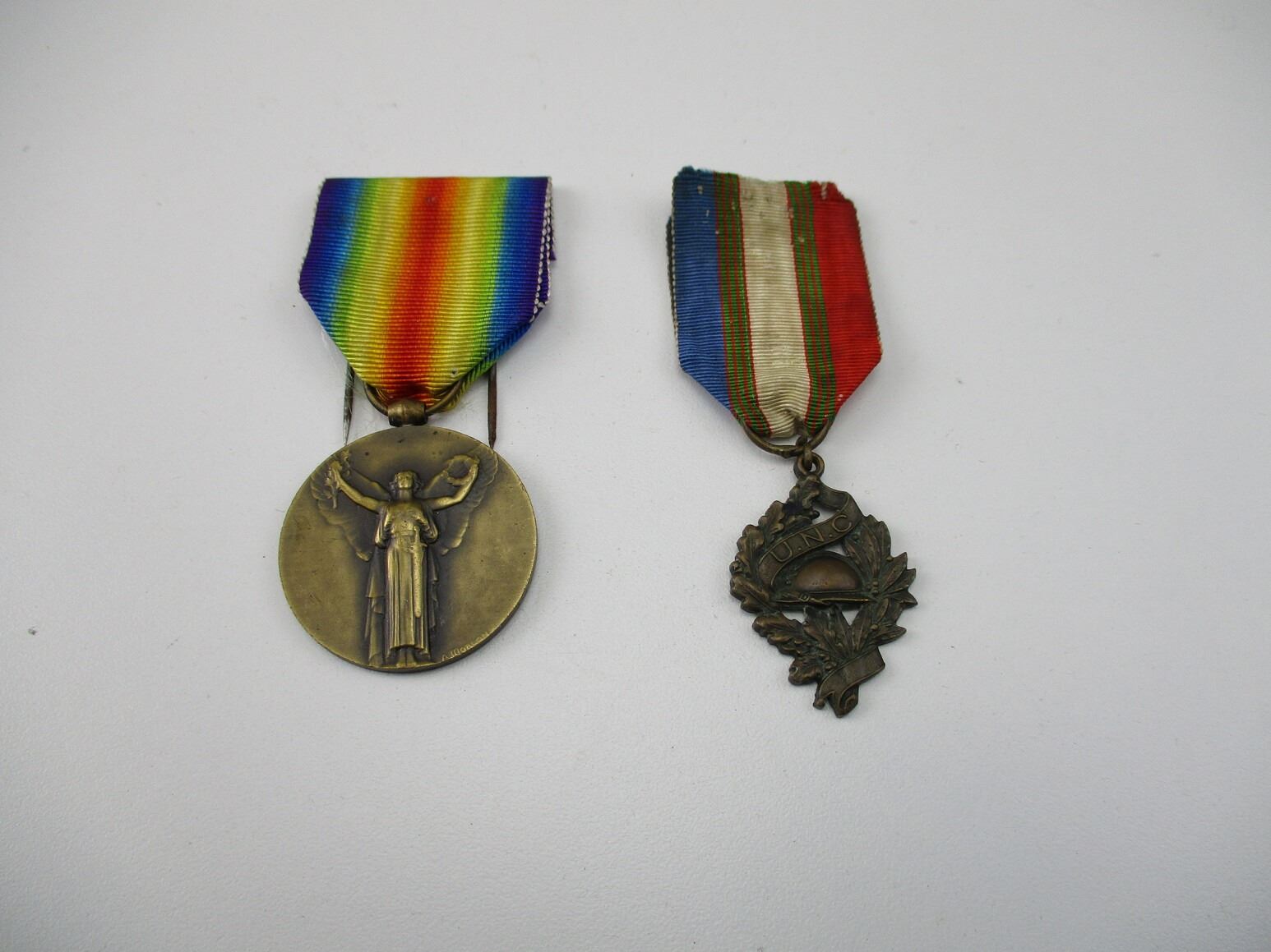 WWI FRENCH MEDAL LOT , LOT OF 2. (1) WWI FRENCH VICTORY MEDAL. MULTI COLOURED RIBBON. (1) WWI FRENCH VETERANS MEDAL. BLUE, GREEN, WHITE AND RED RIBBON.