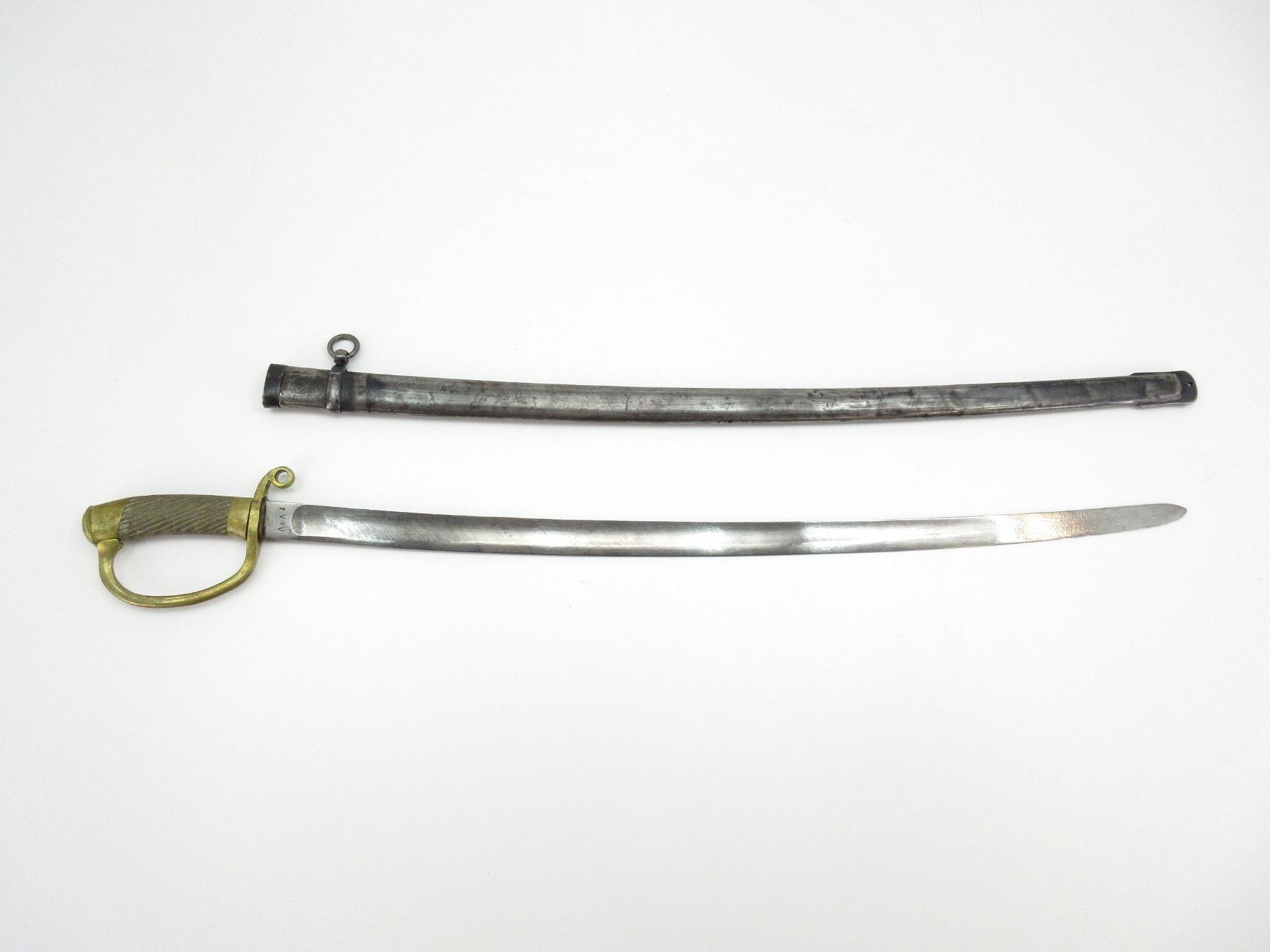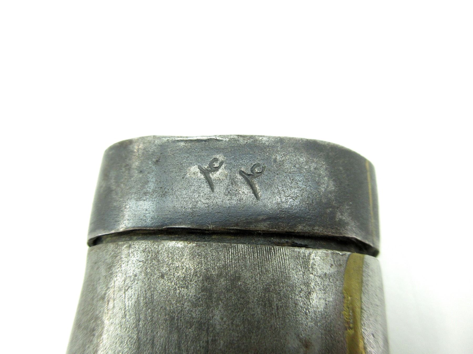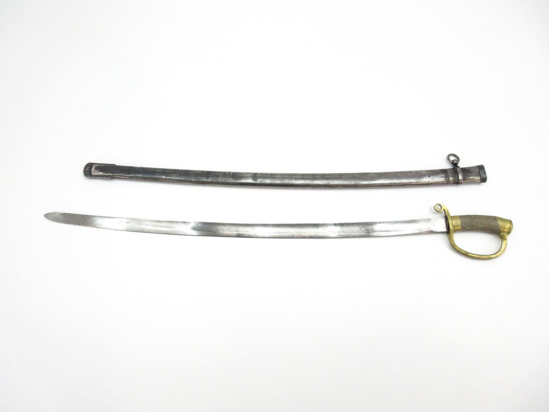 (1) STYLED AFTER RUSSIAN MODEL, SLIGHTLY CURVED FULLERED BLADE, VARIOUS MARKINGS ON RICASSO, LEATHER WASHER / BUFFER PAD, BRASS CROSS-GUARD / HILT / POMMEL, GROOVED GRIP, VARIOUS MARKINGS ON POMMEL, STEEL SCABBARD WITH ONE HANGER, VARIOUS MARKINGS NEAR THROAT, VARIOUS MARKINGS ON TIP, BLADE APPROX. 32" & OAL APPROX. 37.25". SEE PHOTOS.