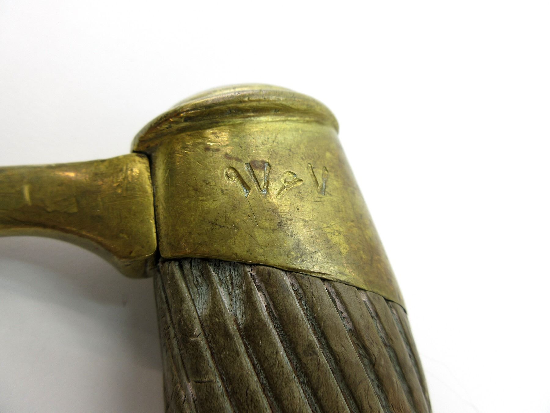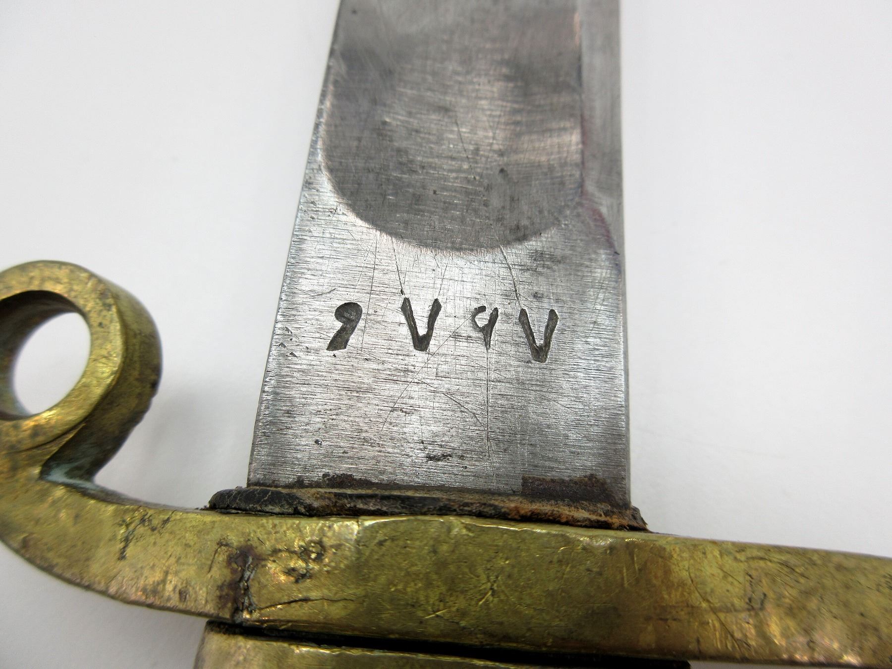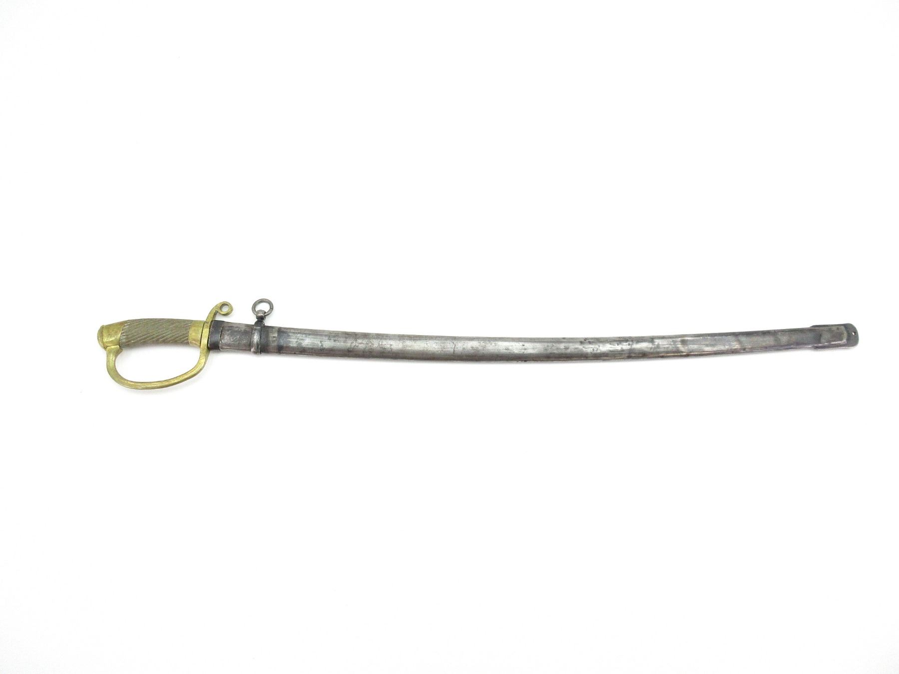 (1) STYLED AFTER RUSSIAN MODEL, SLIGHTLY CURVED FULLERED BLADE, VARIOUS MARKINGS ON RICASSO, LEATHER WASHER / BUFFER PAD, BRASS CROSS-GUARD / HILT / POMMEL, GROOVED GRIP, VARIOUS MARKINGS ON POMMEL, STEEL SCABBARD WITH ONE HANGER, VARIOUS MARKINGS NEAR THROAT, VARIOUS MARKINGS ON TIP, BLADE APPROX. 32" & OAL APPROX. 37.25". SEE PHOTOS.
