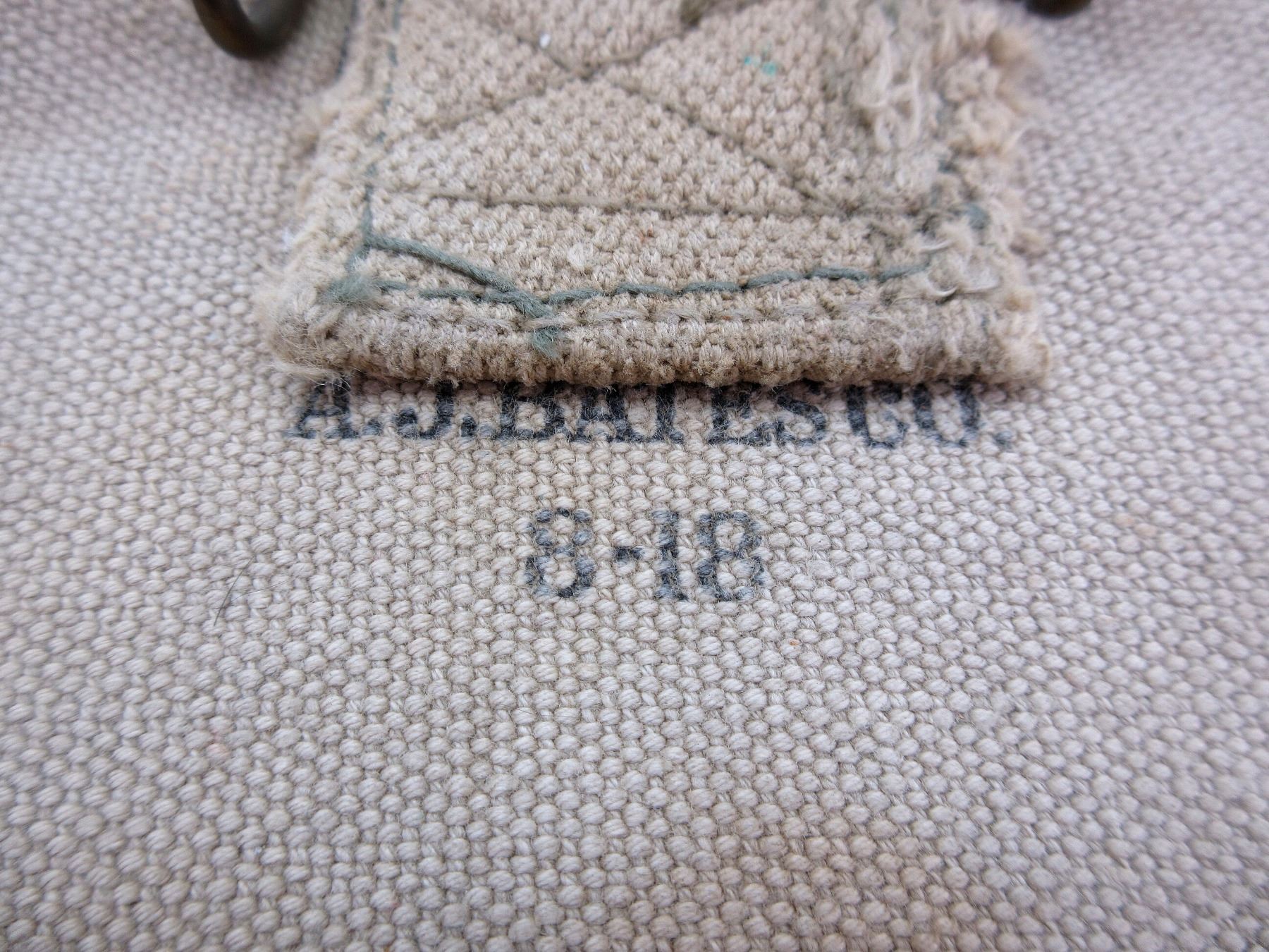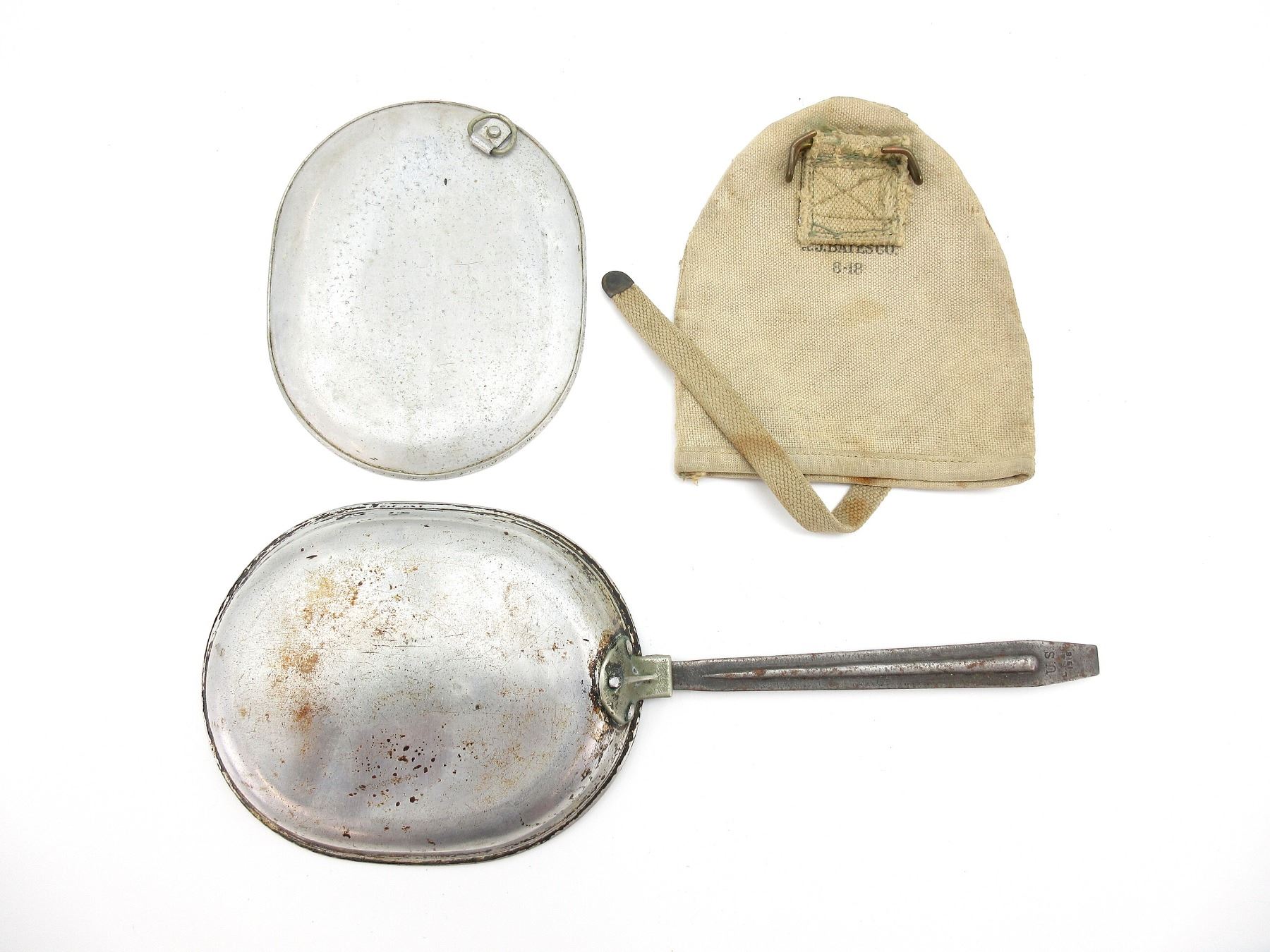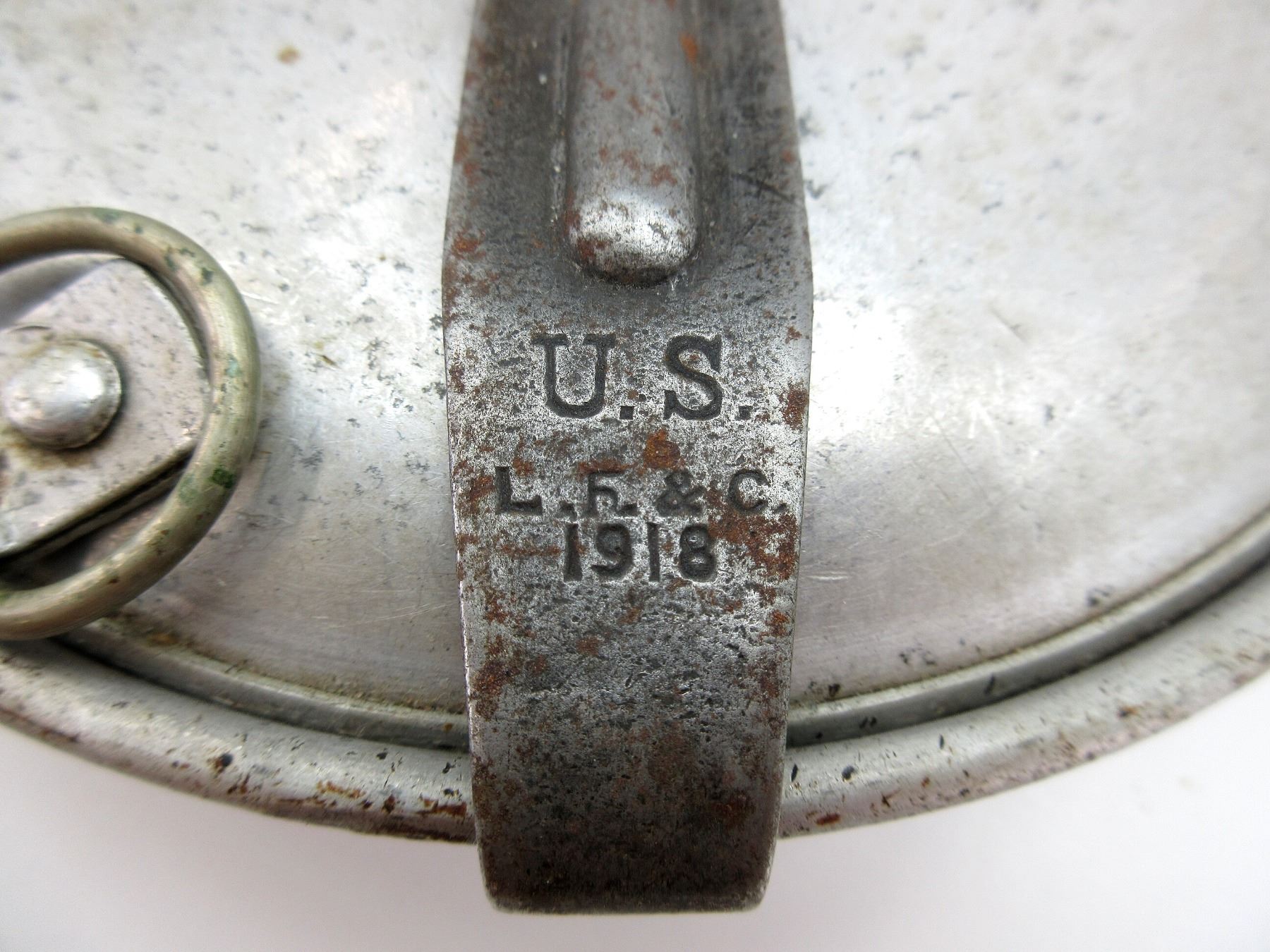 LOT INCLUDES; (1) ALUMINUM & STEEL MESS TIN, MARKED: "U.S., L.F. & C., 1918", SHOWS AGE / WEAR, APPROX. 9" X 7" X 1" & (1) TAN CANVAS CANTEEN COVER, MARKED: "U.S." & "A.J.BATES CO., 8-18", SHOWS AGE / WEAR. SEE PHOTOS.
