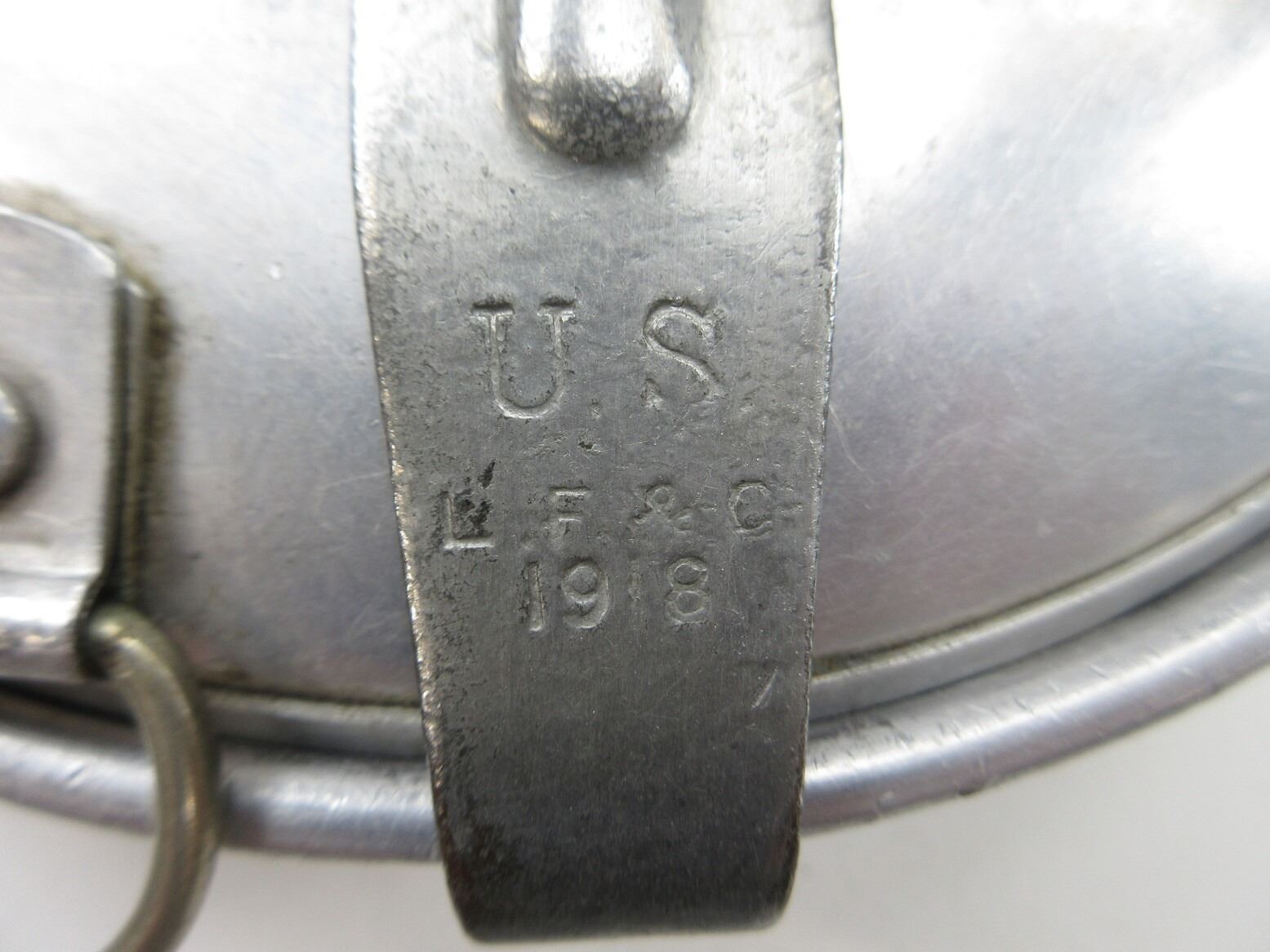 LOT INCLUDES; (1) ALUMINIUM MESS TIN, MARKED: "U.S., L.F.&C., 1918", APPROX. 9" X 7" X 1 5/8" & (1) TAN CANVAS CARRY COVER, FAINT / UN-CLEAR MARKINGS, APPROX. 8" X 7.25" X 2". SEE PHOTOS.