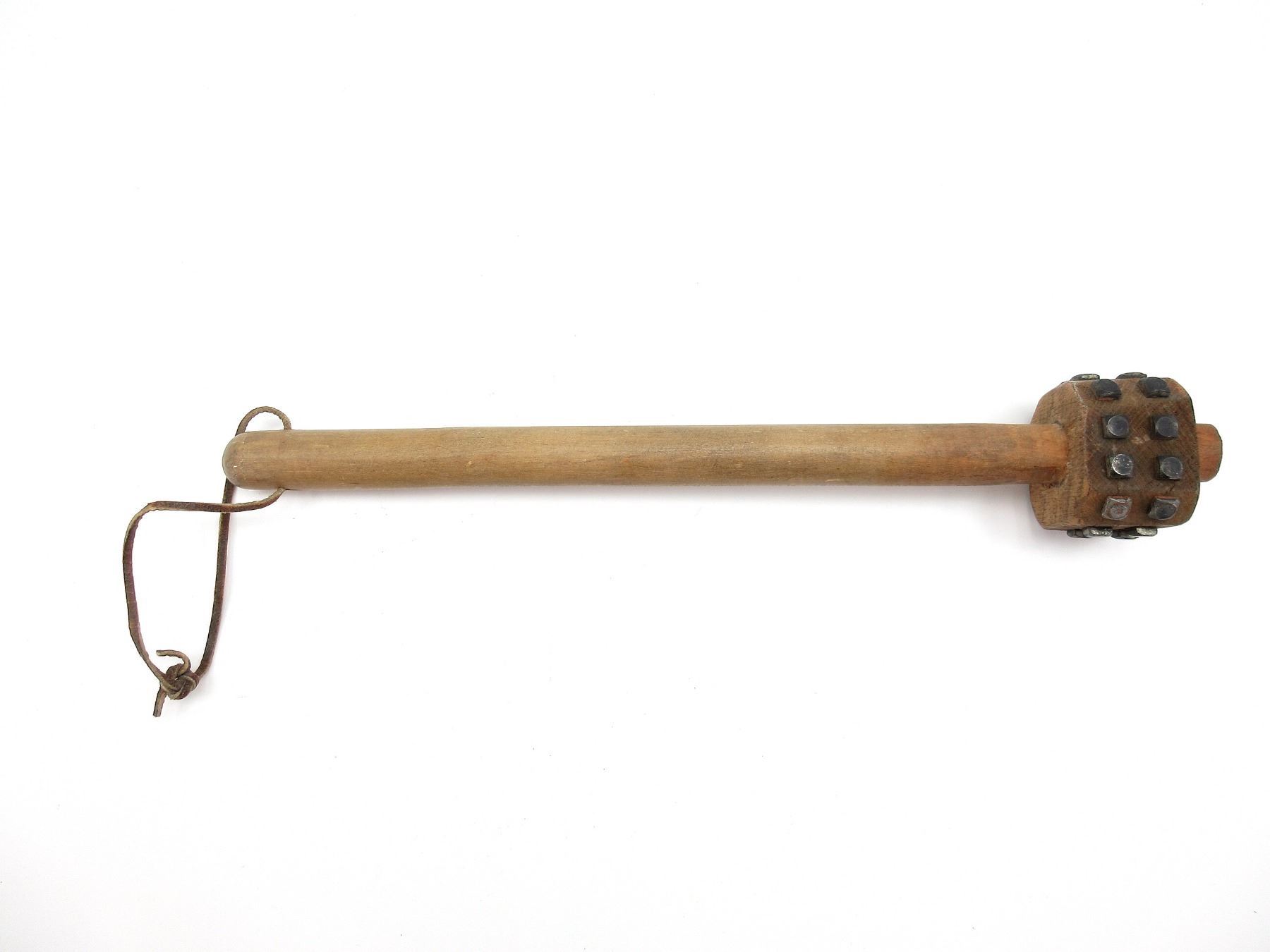 (1) TRENCH CLUB, CONSIGNOR STATES: "WW1 TRENCH CLUB, WHITE OAK & HOBB NAIL CONSTRUCTION", NO VISIBLE MARKINGS, WITH LEATHER THONG, OAL APPROX. 17 3/8". SEE PHOTOS.