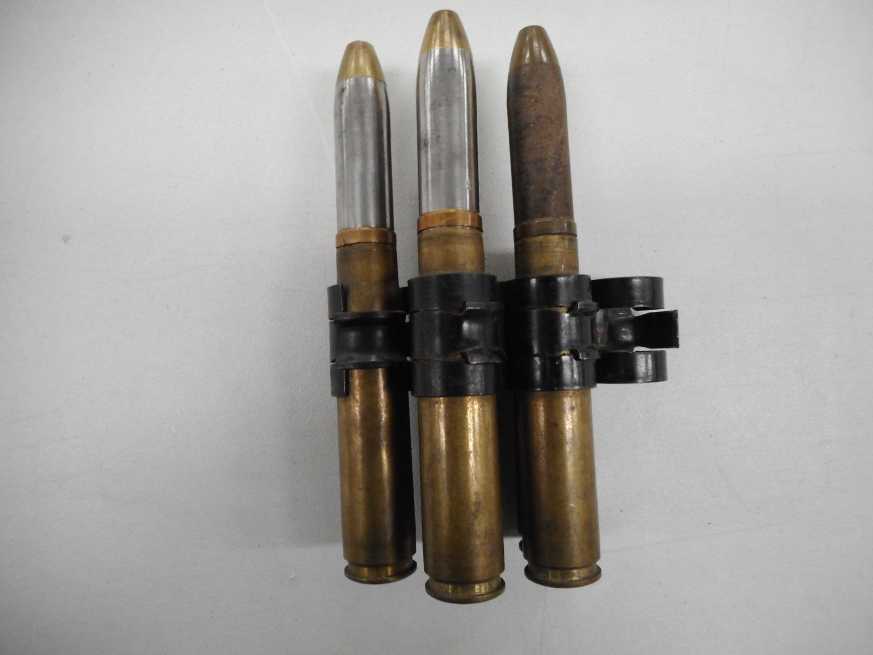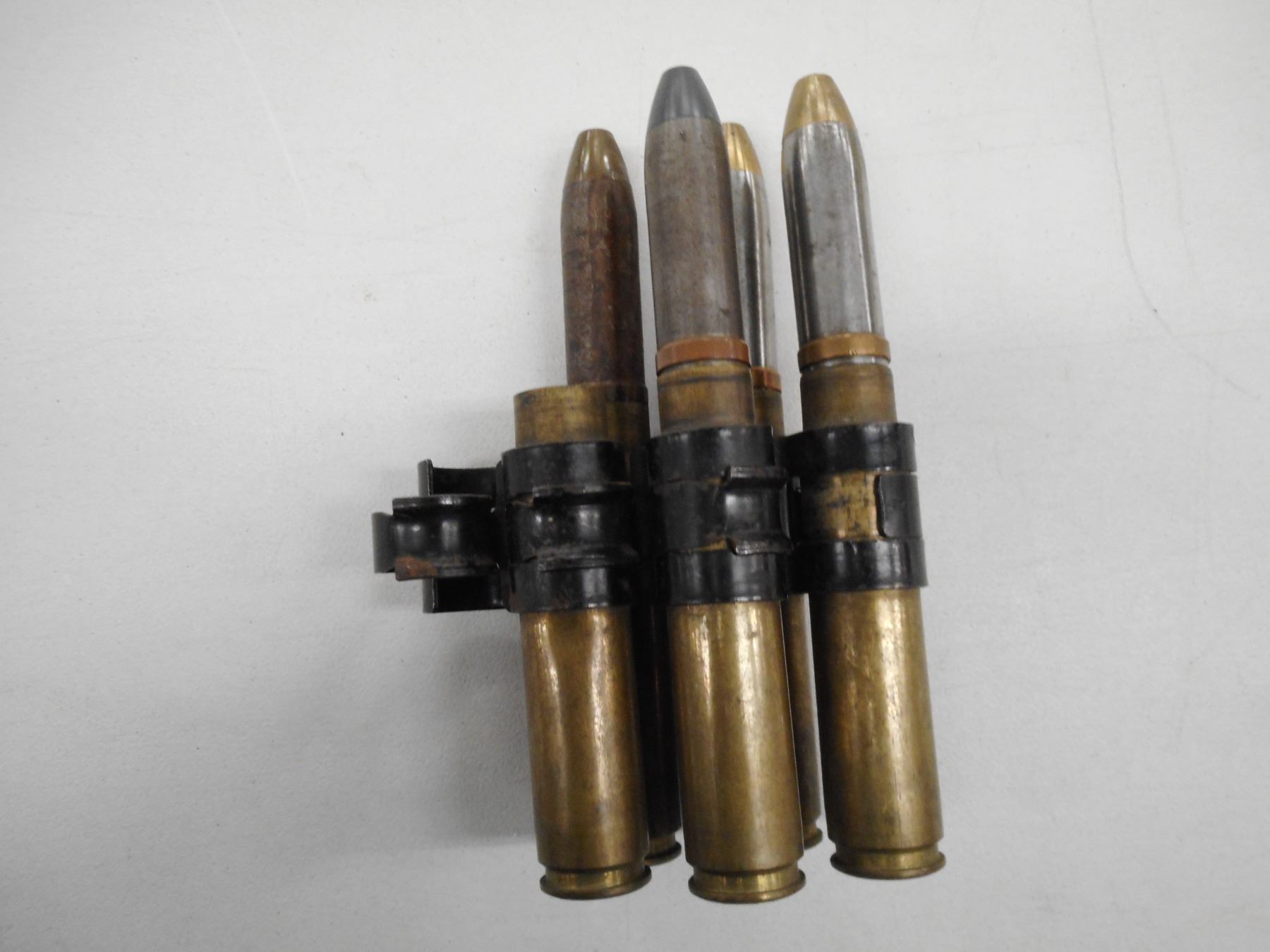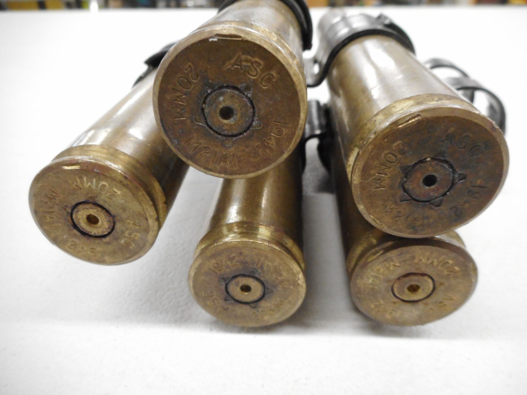 WWII 20MM FIRED CASES WITH PROJECTILES AND LINKS , MARKED 1942, 20MM ASC. APPROX. HEIGHT 7.25". LOT OF 5