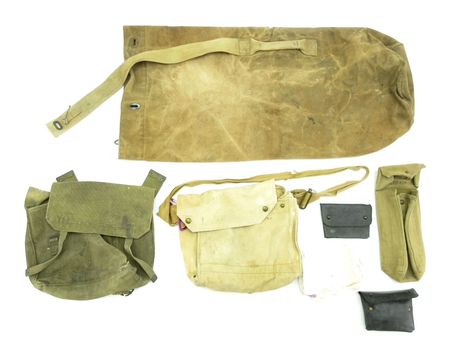 LOT INCLUDES; (1) WWII BRITISH MILITARY TAN P37 WEB MKIII BASIC POUCH, MARKED: "MKIII, CP LTD 42" WITH BROAD ARROW AND INK STAMP PROOF MARK, BRASS FITTINGS / BELT HOOKS, (1) CANADIAN MILITARY TAN P37 WEB MEDIUM / SMALL PACK, MARKED WITH FAINT / PARTIAL C-BROAD ARROW, SHOULDER STRAP MISSING, SHOWS AGE / WEAR, (1) CANADIAN MILITARY TAN CANVAS GAS MASK BAG WITH SHOULDER STRAP, MARKED WITH C-BROAD ARROW & VARIOUS HAND-WRITTEN MARKINGS, SHOWS AGE / WEAR / TEAR, (1) WWII STYLE UNKNOWN MILITARY TAN CANVAS DUFFLE BAG, VARIOUS HAND-WRITTEN MARKINGS ON BOTTOM, WITH TAN P37 WEB SHOULDER STRAP & CARRY HANDLE, OAL APPROX. 34", ETC. SEE PHOTOS.