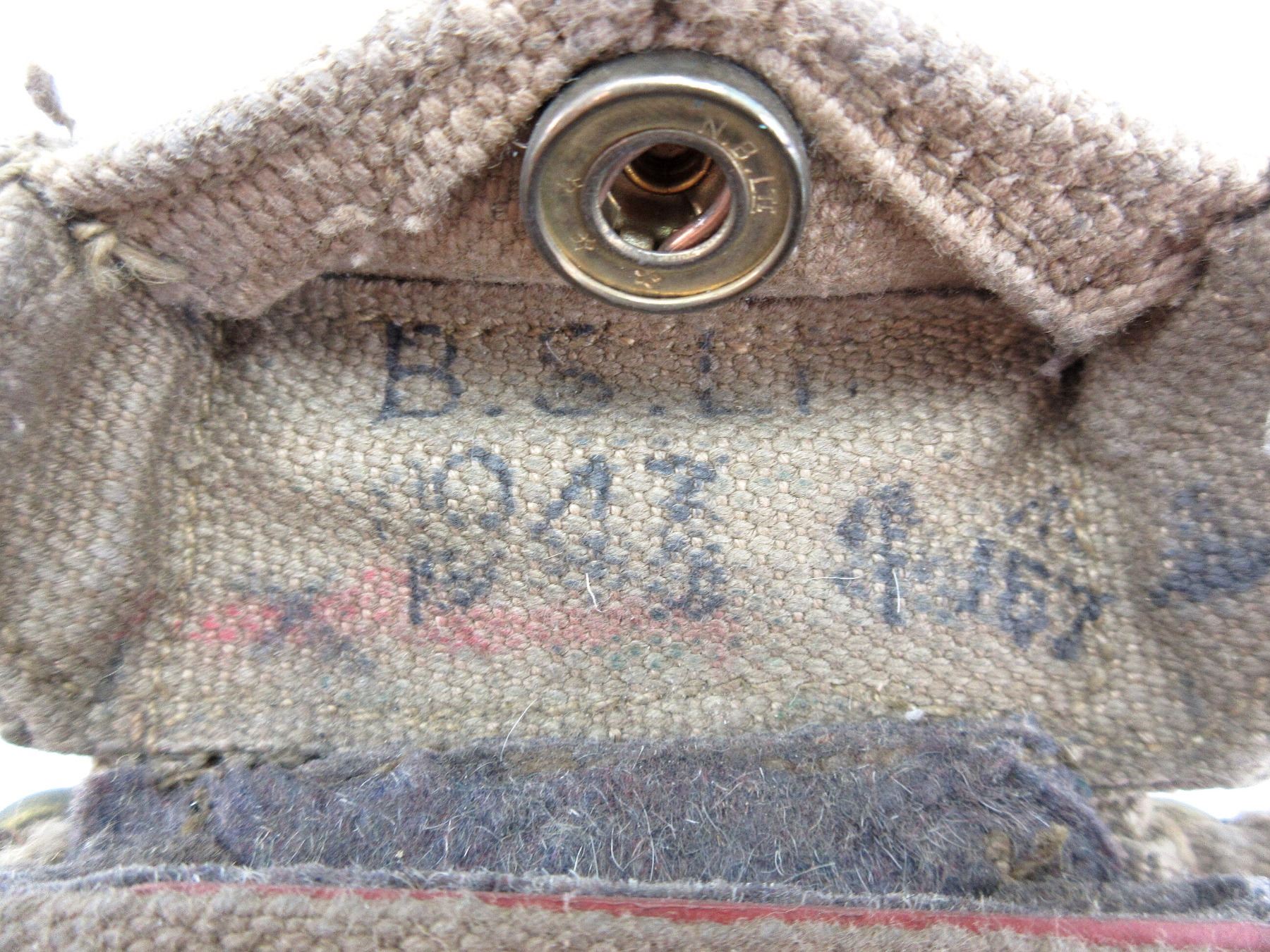 LOT INCLUDES; (1) U.S. MILITARY TAN WEB CANVAS DRESSING POUCH WITH BELT HOOK, MARKED: "US", "LEE 1942" & VARIOUS HAND-WRITTEN MARKINGS, (1) U.S. MILITARY TAN / GREEN WEB CANVAS 1911 PISTOL MAG POUCH, DOUBLE-POCKET, MARKED: "S. FROEHLICH CO., 1943", LARGE BELT LOOP, METAL FITTINGS, (1) BRITISH MILITARY TAN P37 WEB CANVAS AMMO POUCH, MARKED: "B.S.L., 1943", BROAD ARROW & VARIOUS OTHER FAINT / UN-CLEAR MARKINGS, BRASS FITTINGS / BELT HOOKS & (2) CANADIAN MILITARY TAN P37 WEB CANVAS LEE ENFIELD AMMO POUCHES, MARKED: "Z.L.&T. LTD. 1940" WITH C-BROAD ARROW, BRASS FITTINGS / BELT HOOKS. SEE PHOTOS.